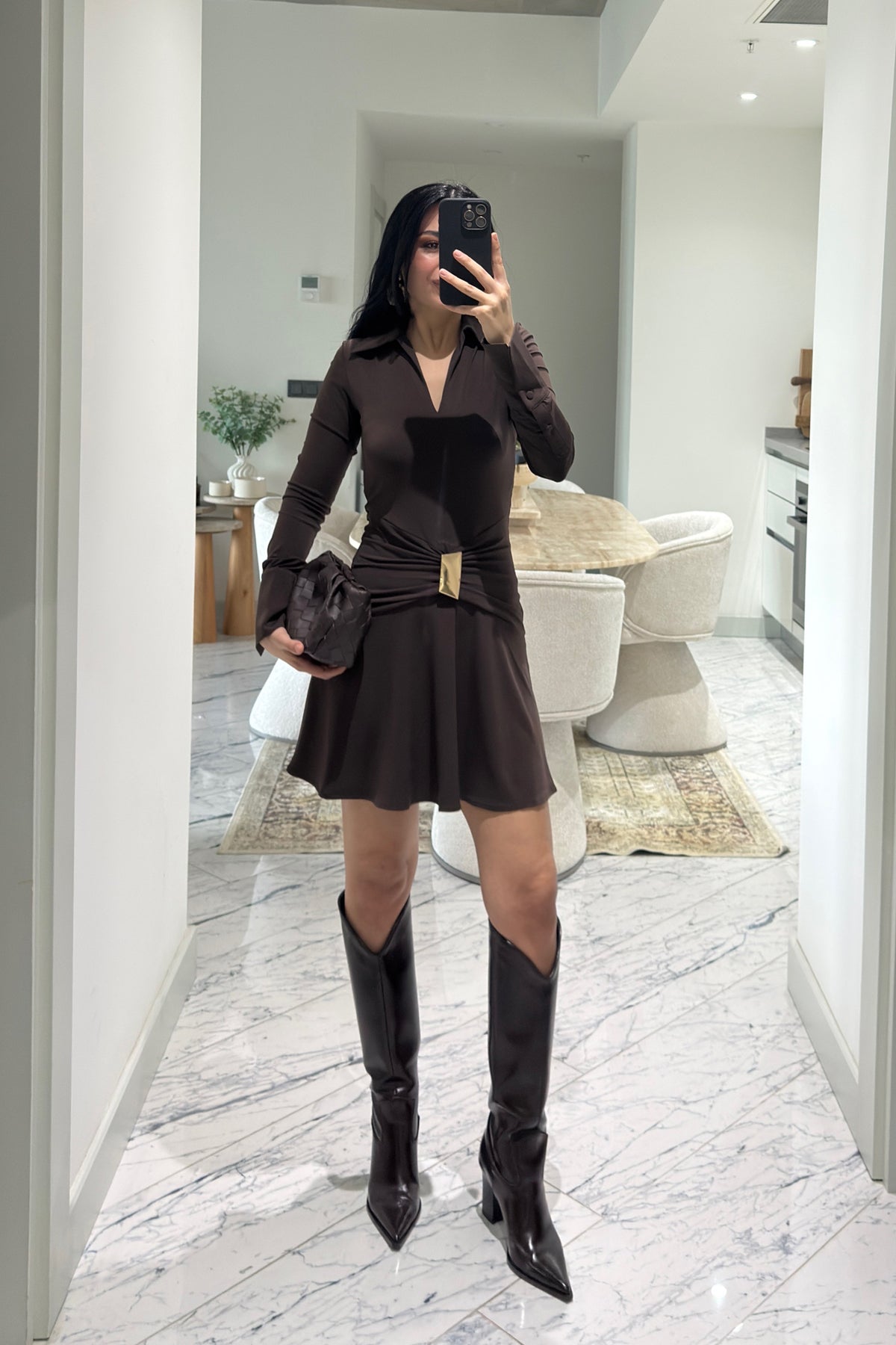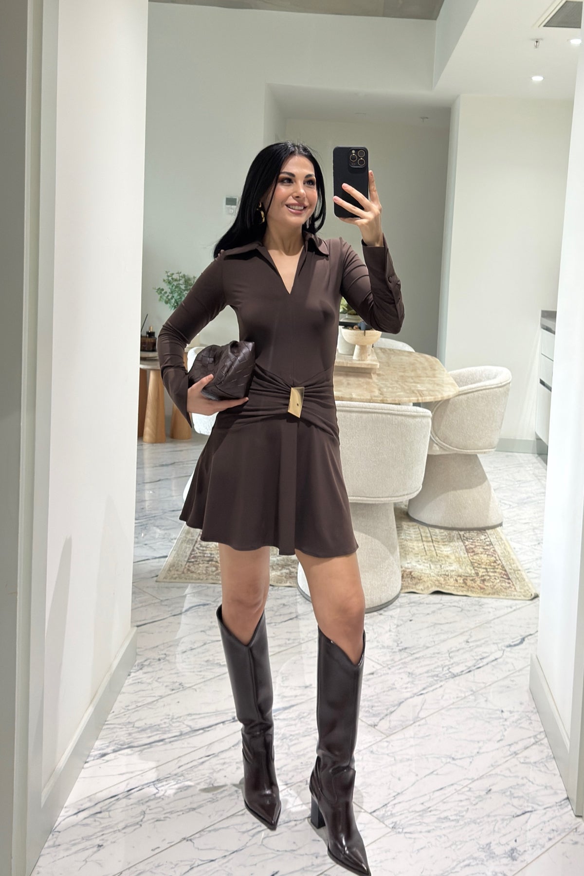 Ürün Detayları:Toka Detaylı Yakalı Elbise Kahve
