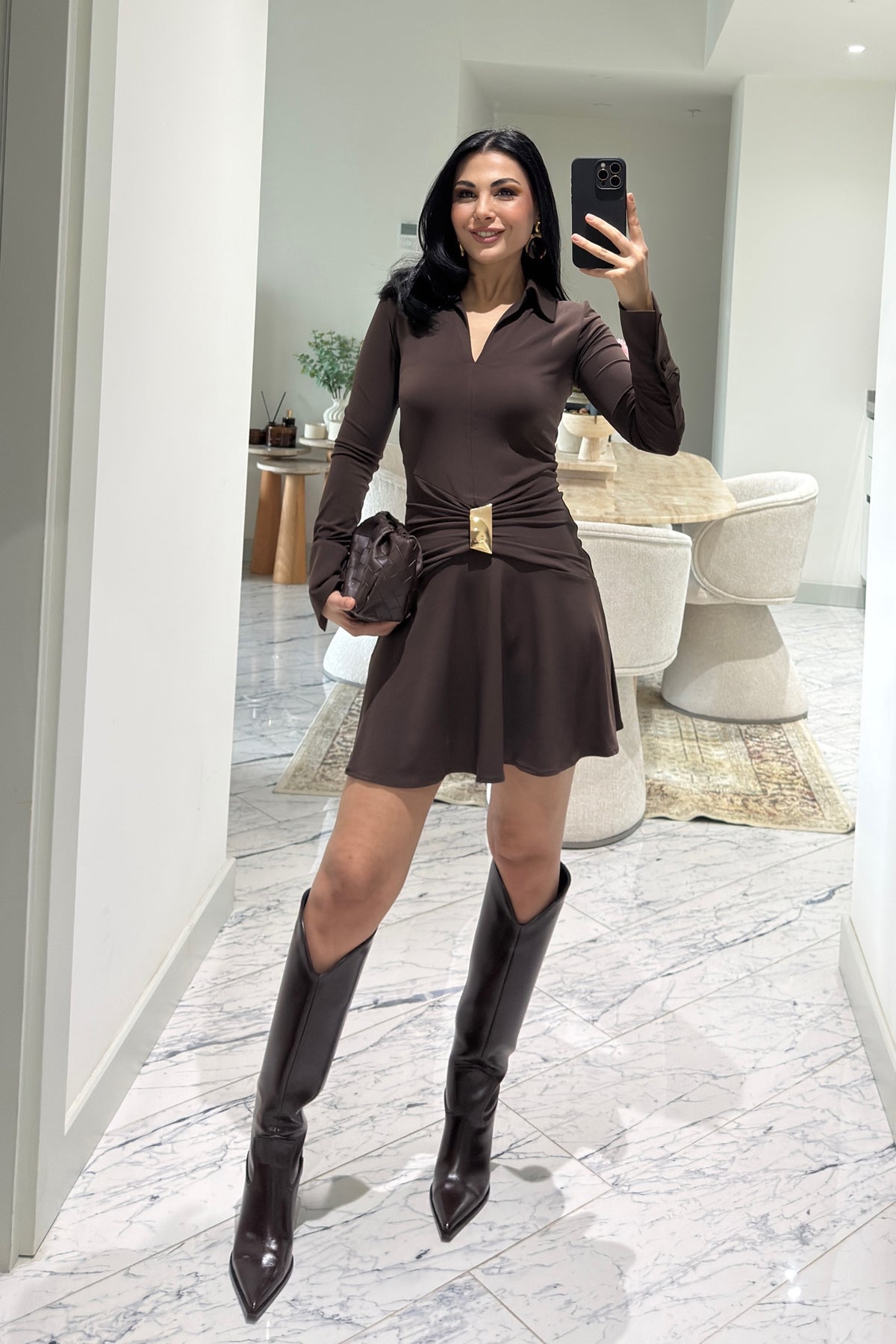 Toka Detaylı Yakalı Elbise Kahve SY-3623-Kahve