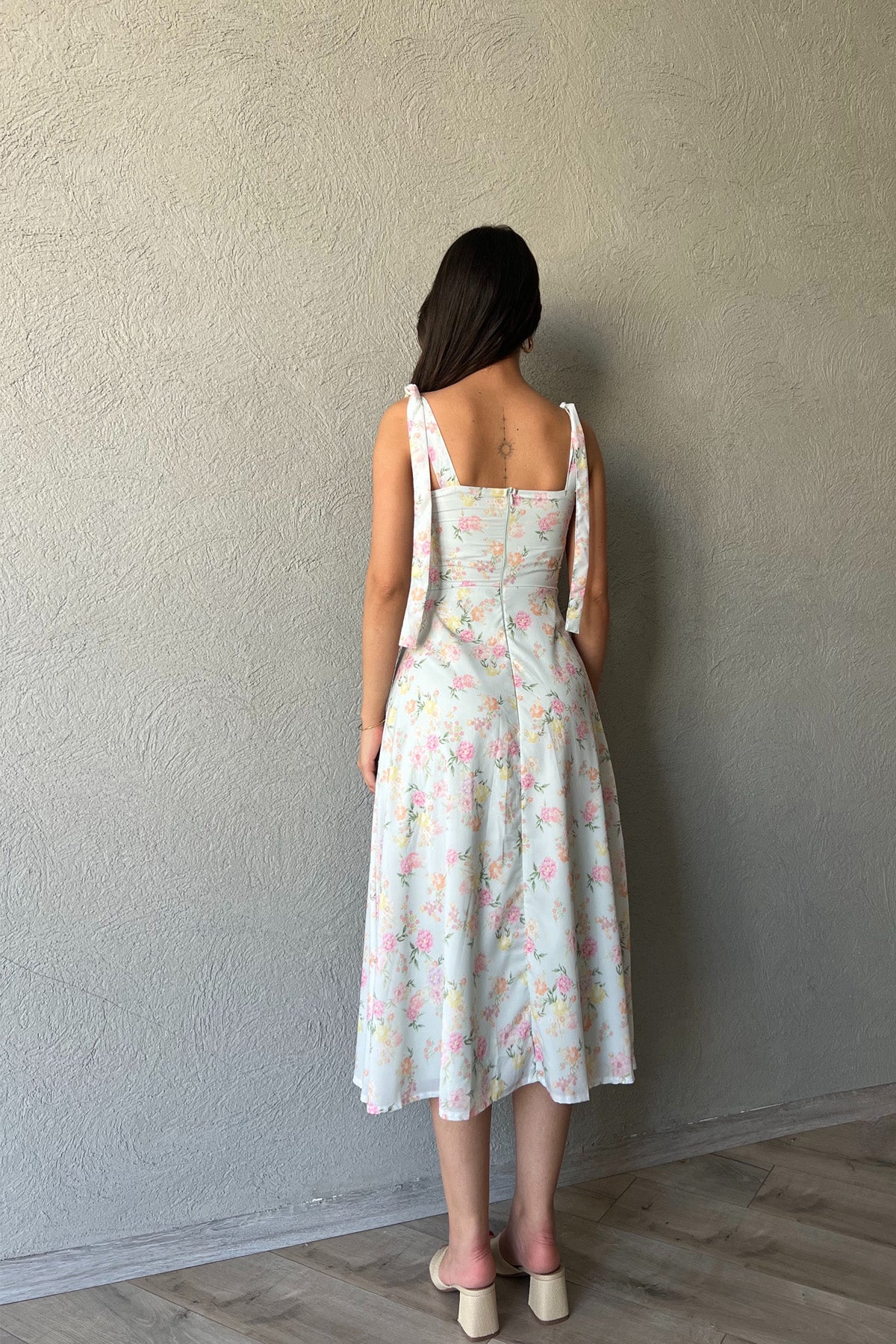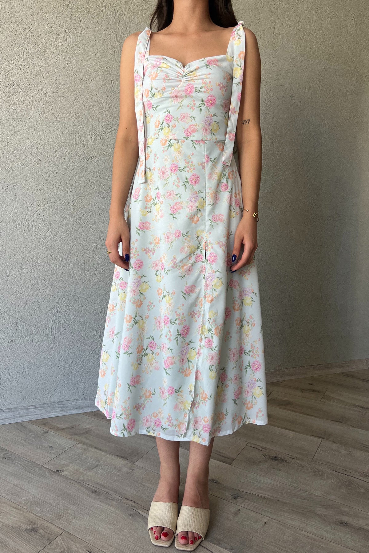 Ürün Detayları ; Çiçek Desenli Omuzdan Bağlamalı Elbise