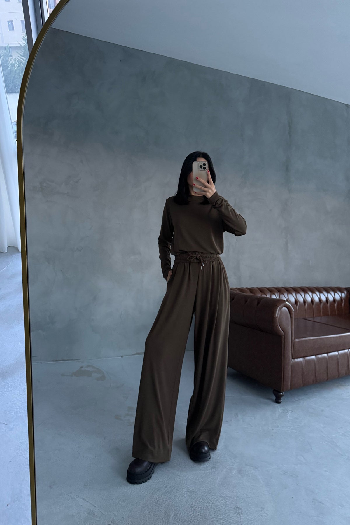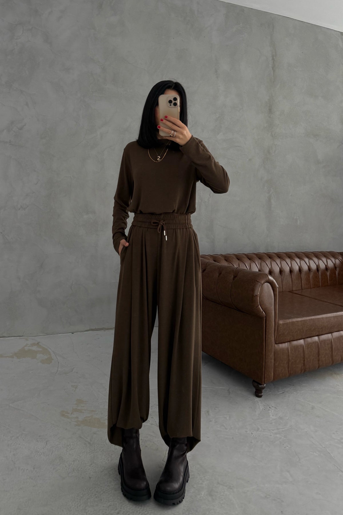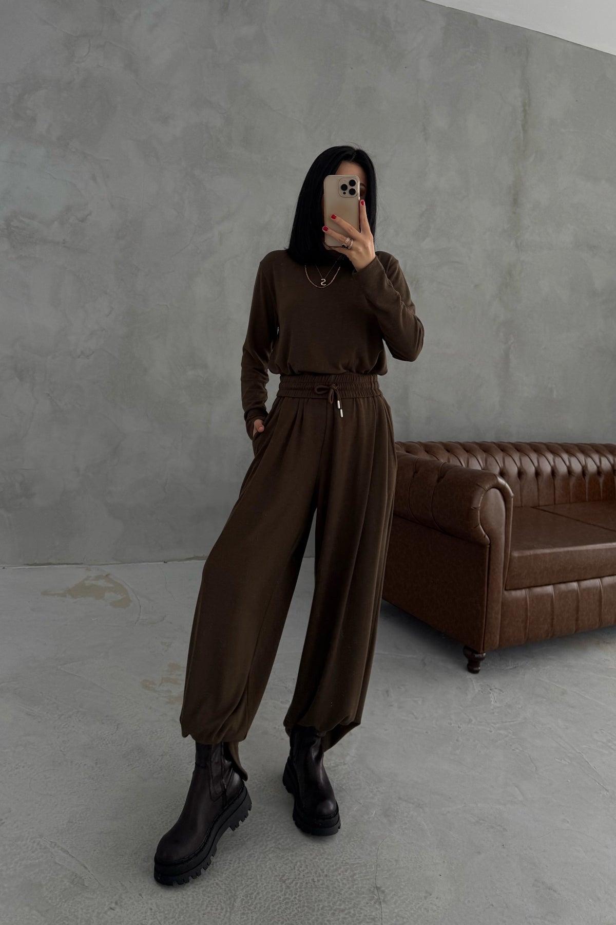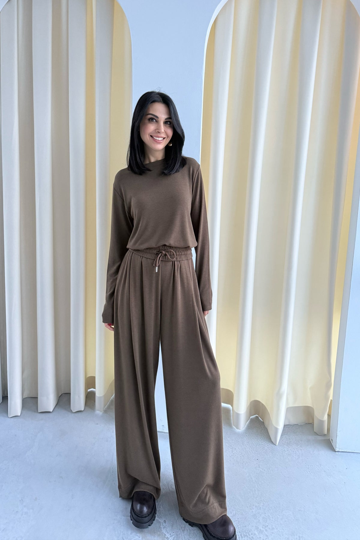 Ürün Detayları: Kahverengi Rahat Kesim Pile Detaylı Eşofman Alt Ve üst Takım