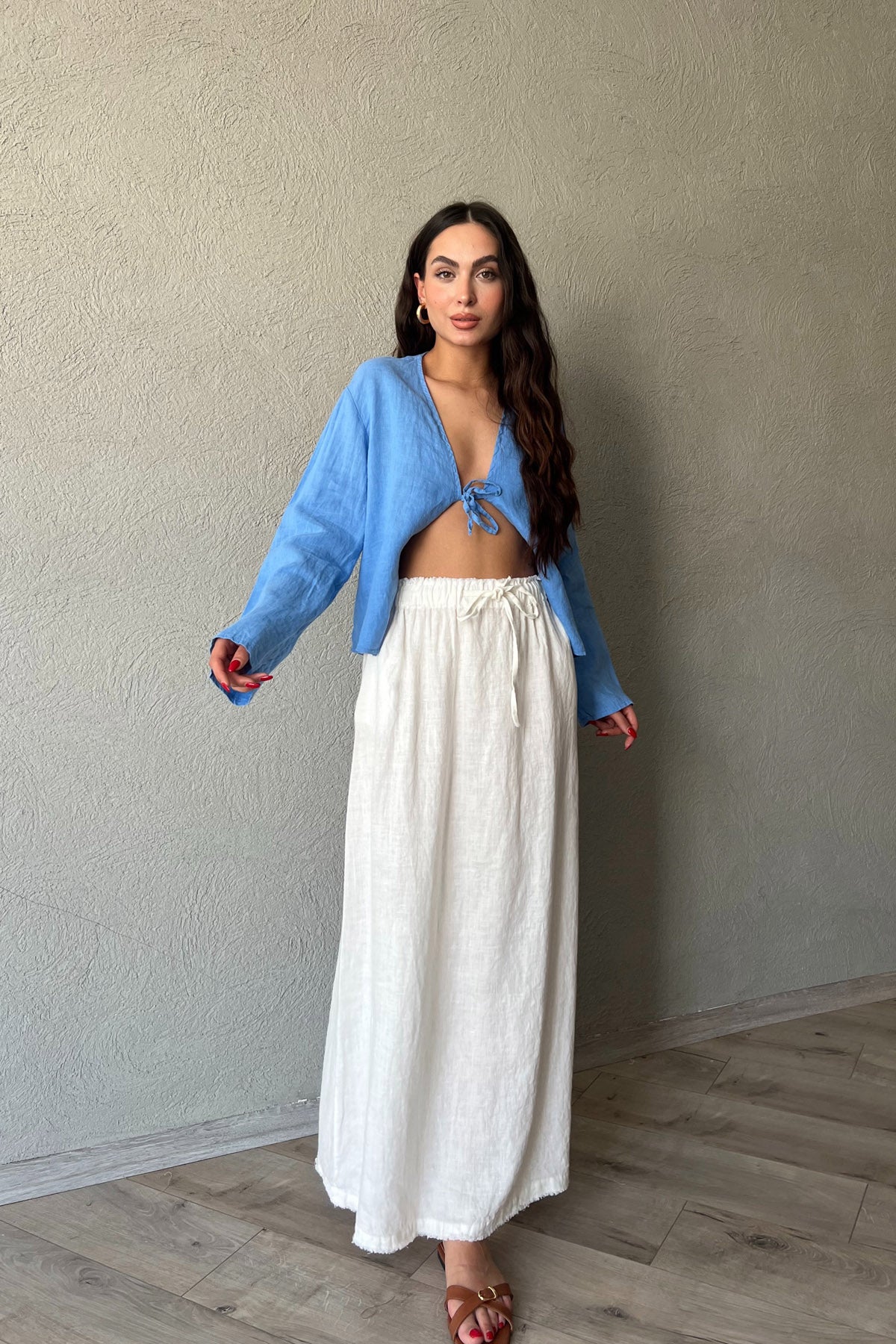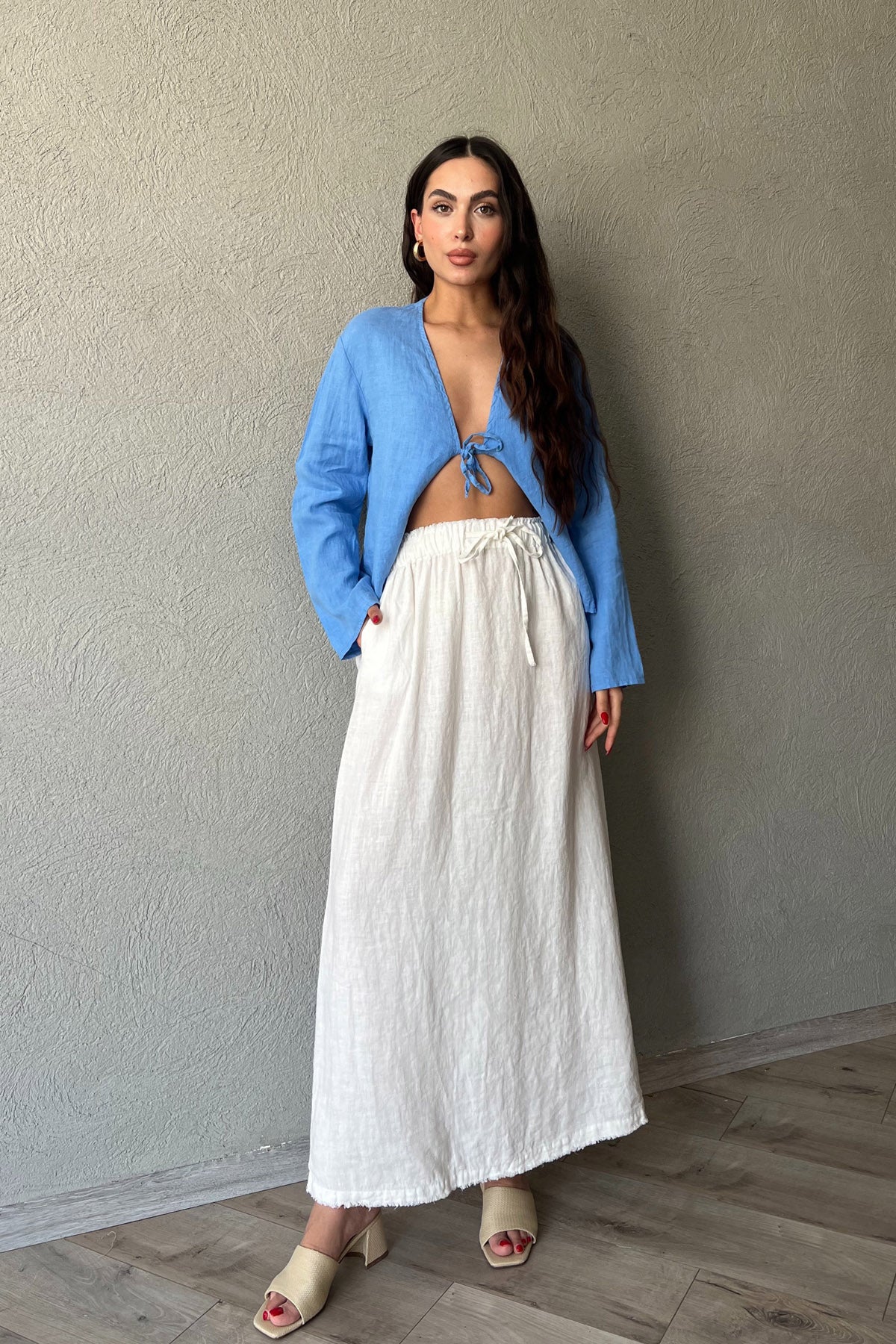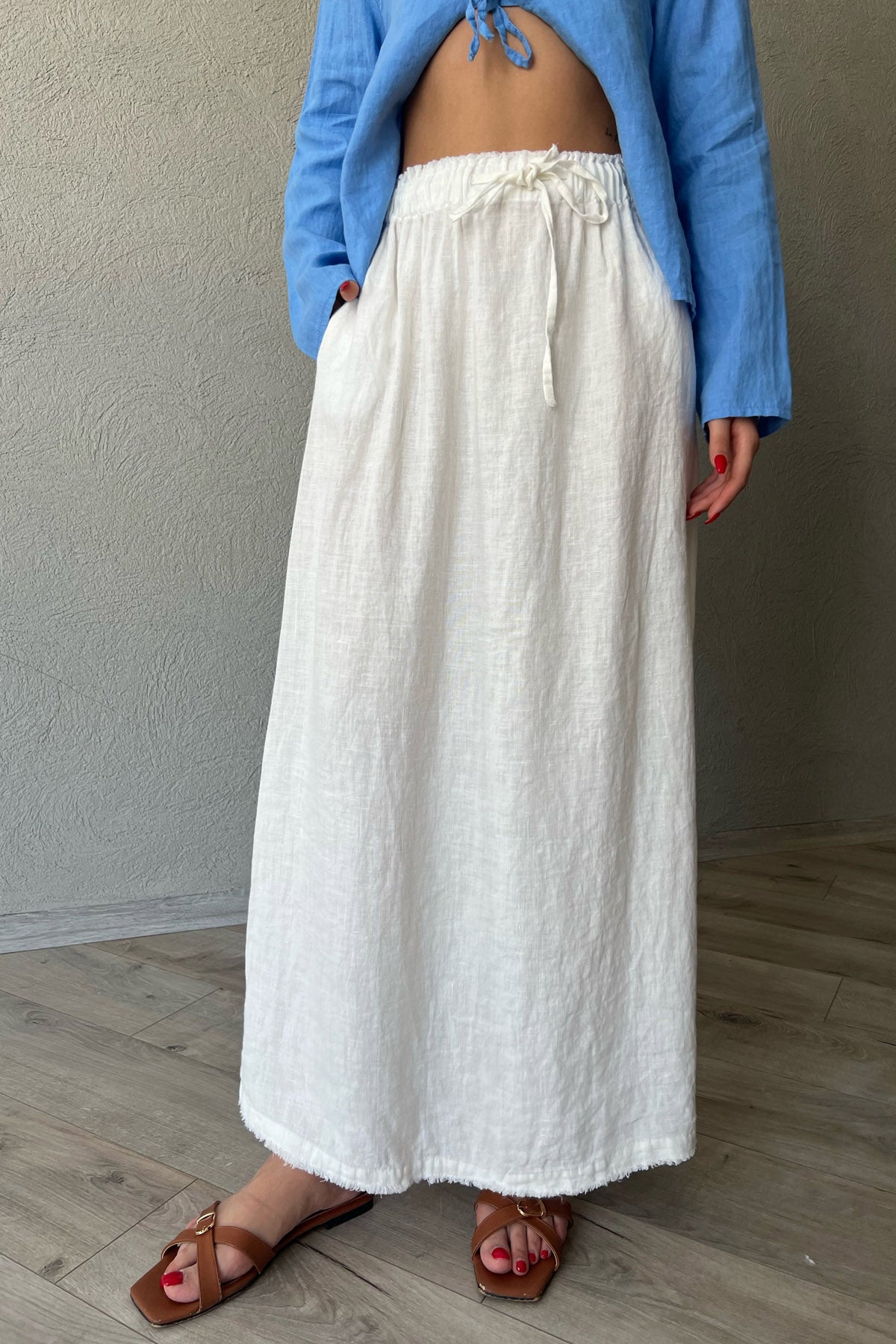 Ekru Beli Bağlama Detaylı Uzun Keten Etek SY-2154-Ekru