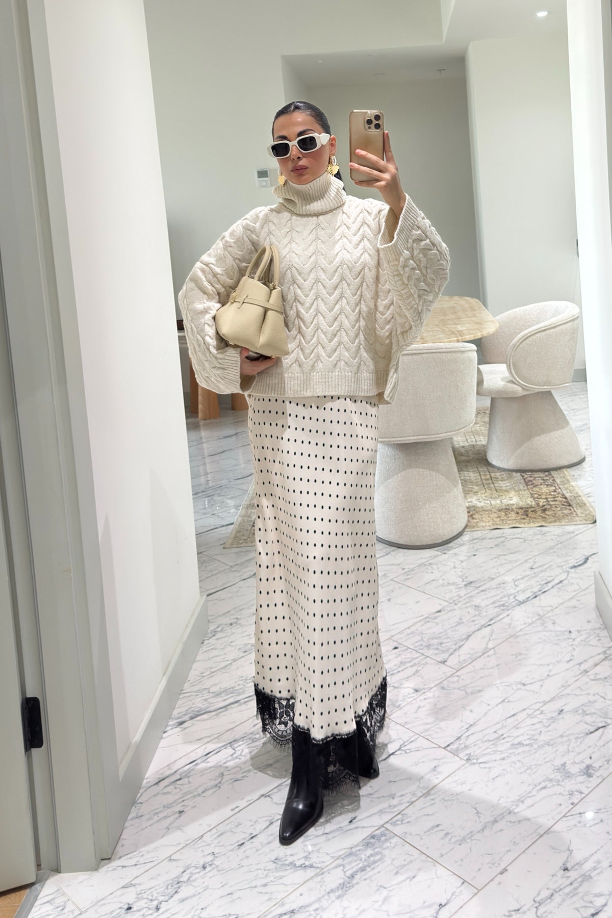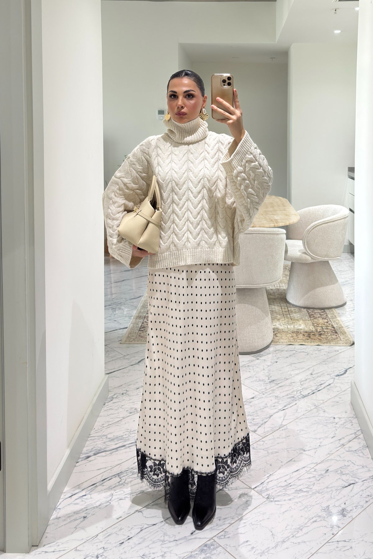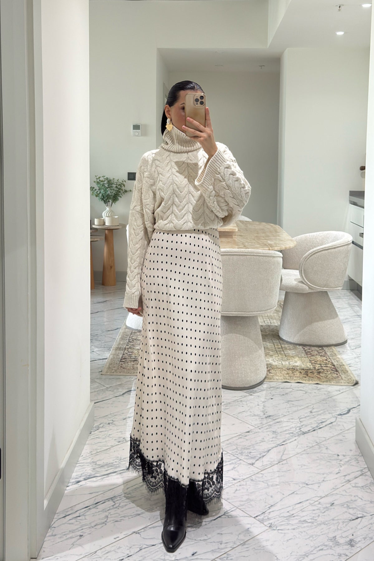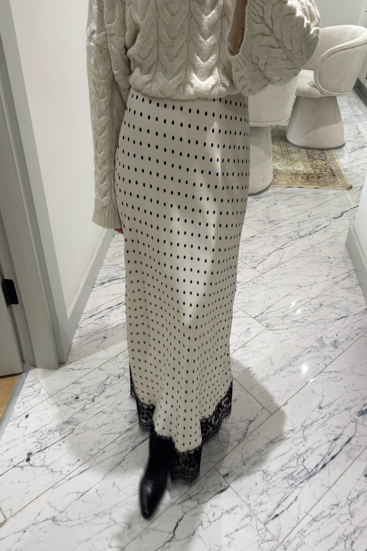 Ekru Puantiyeli Dantel Detaylı Maxi Saten Etek SY-3600-Ekru