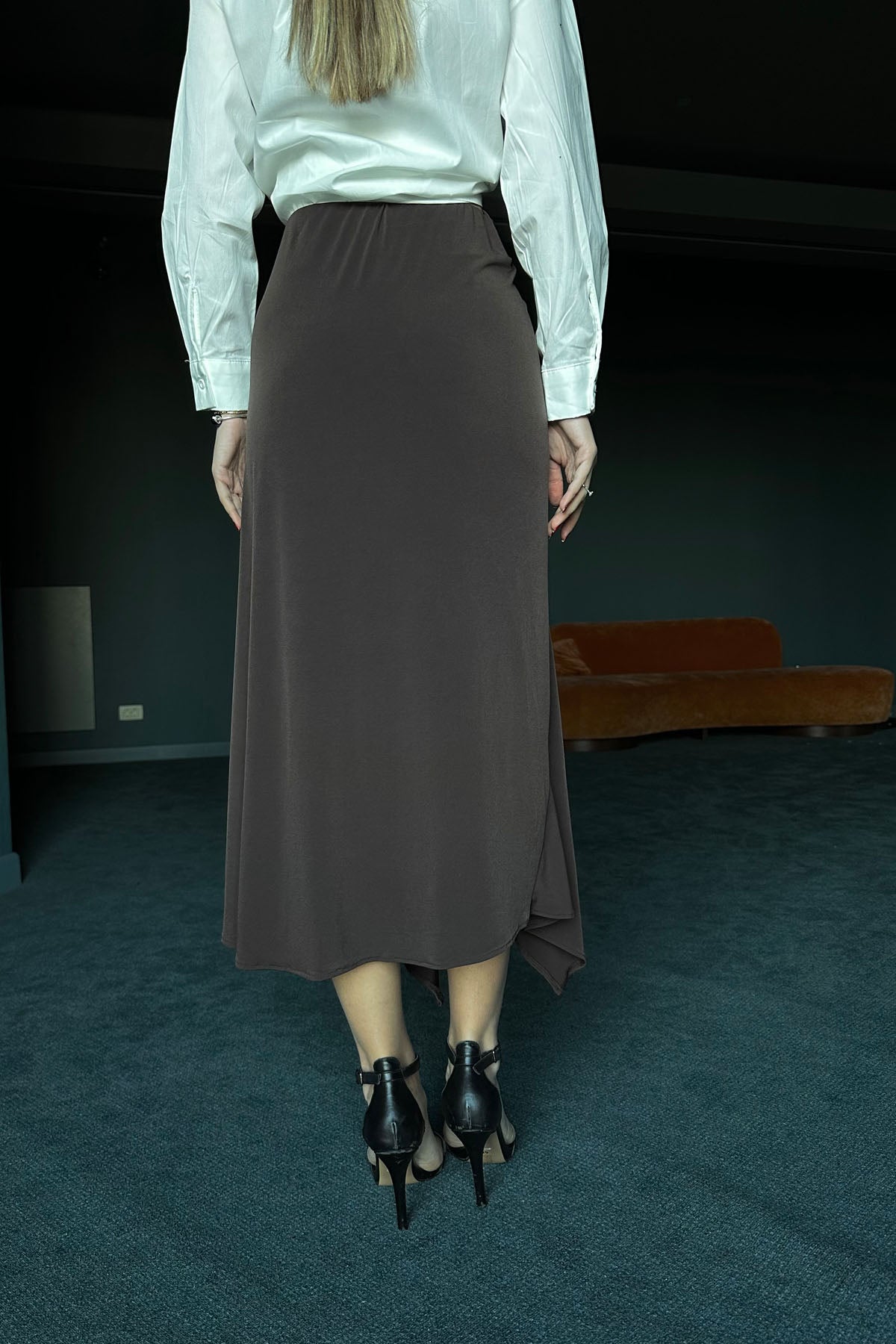 Kahverengi Önü Büzgülü Midi Etek SY-0013-Kahvarengi