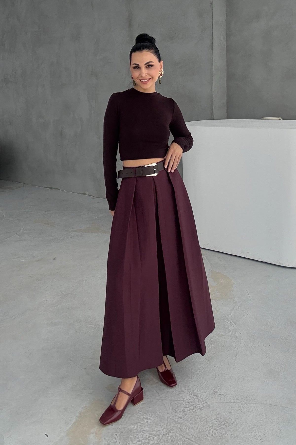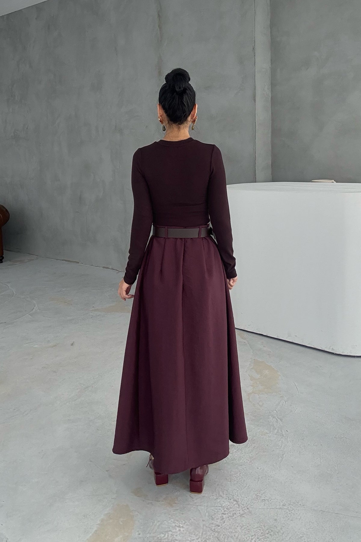 Ürün Detayları ; Mürdüm Kemer Detaylı Etek