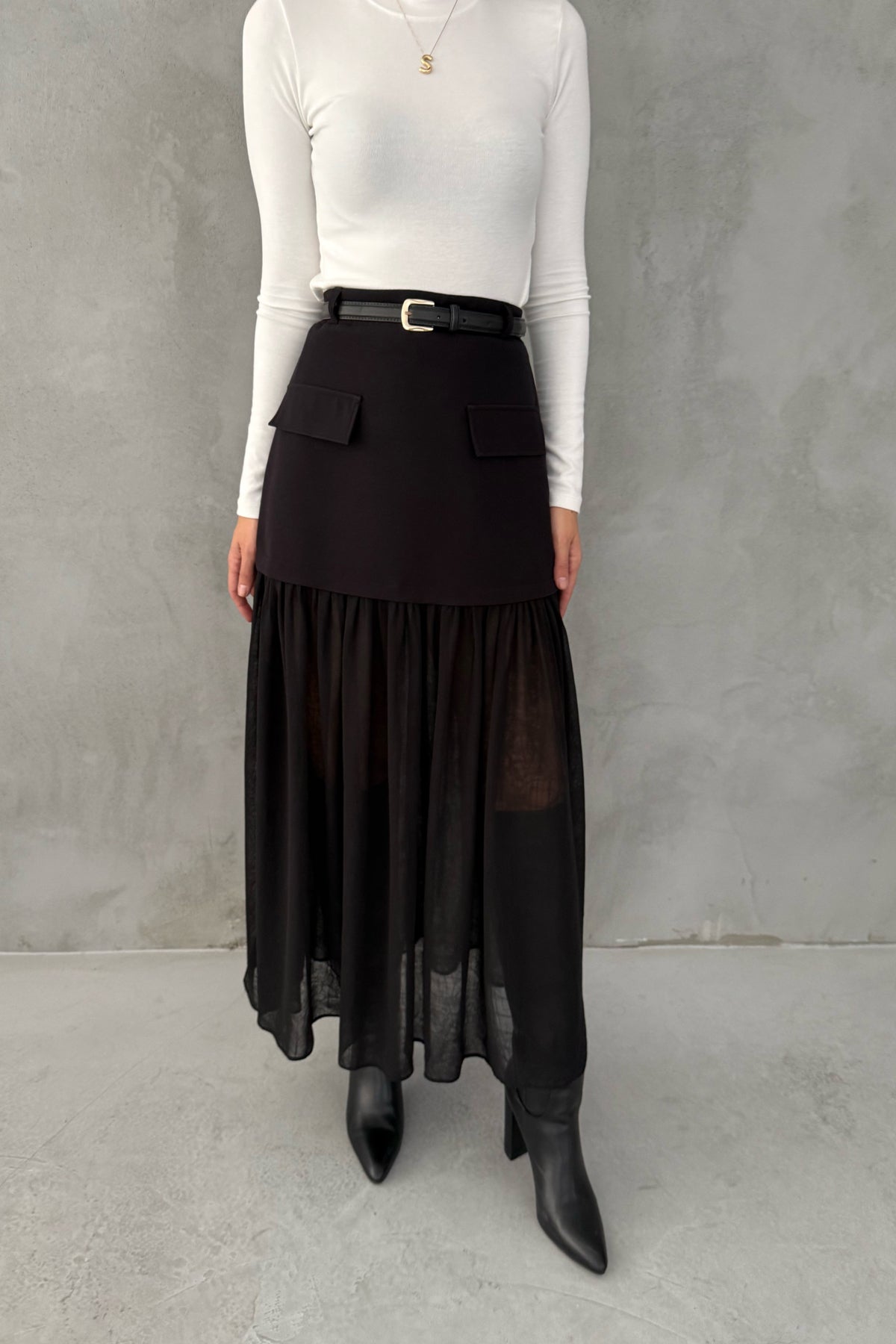 Siyah Tül Garnili Kemerli Midi Etek SY-3394-Siyah