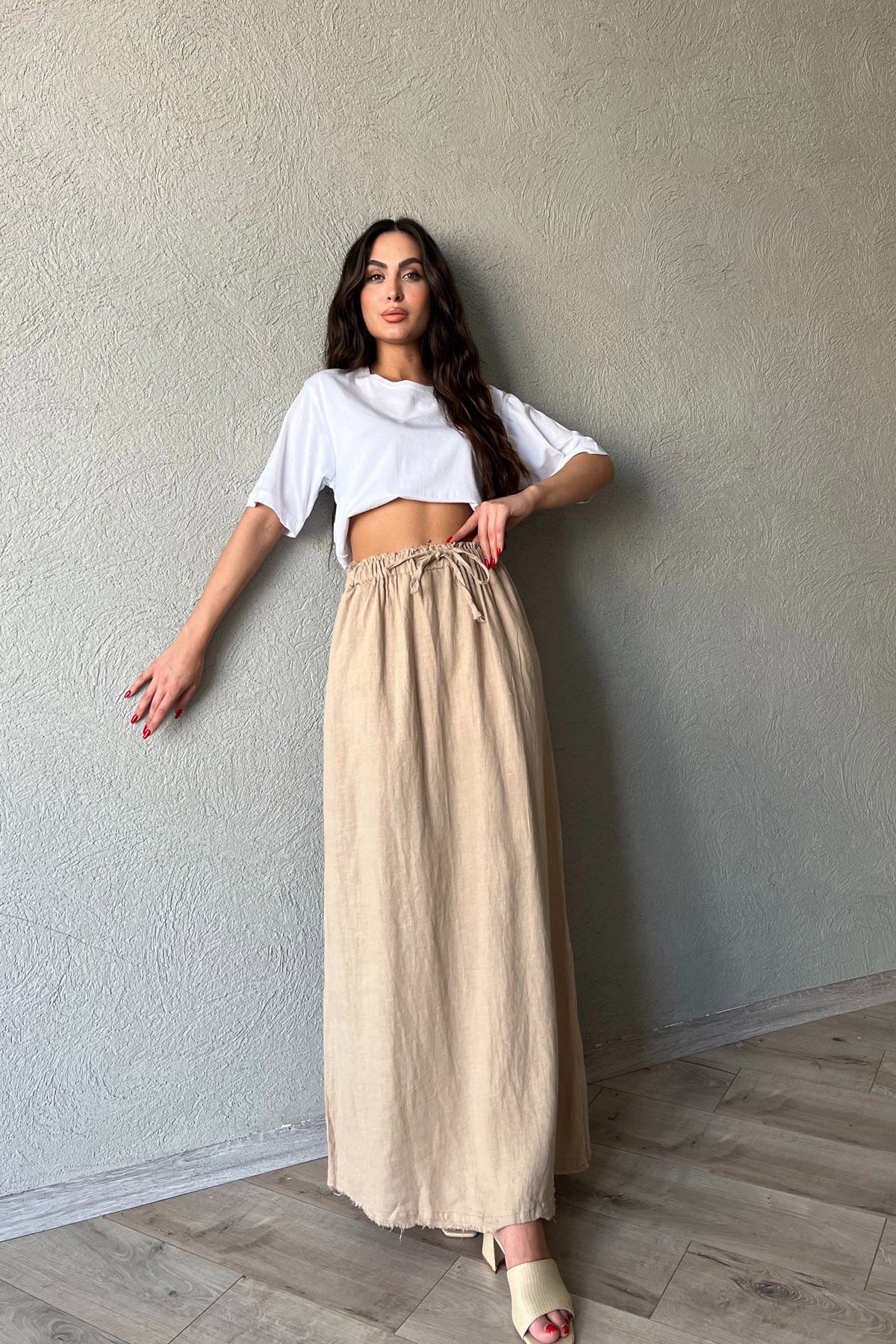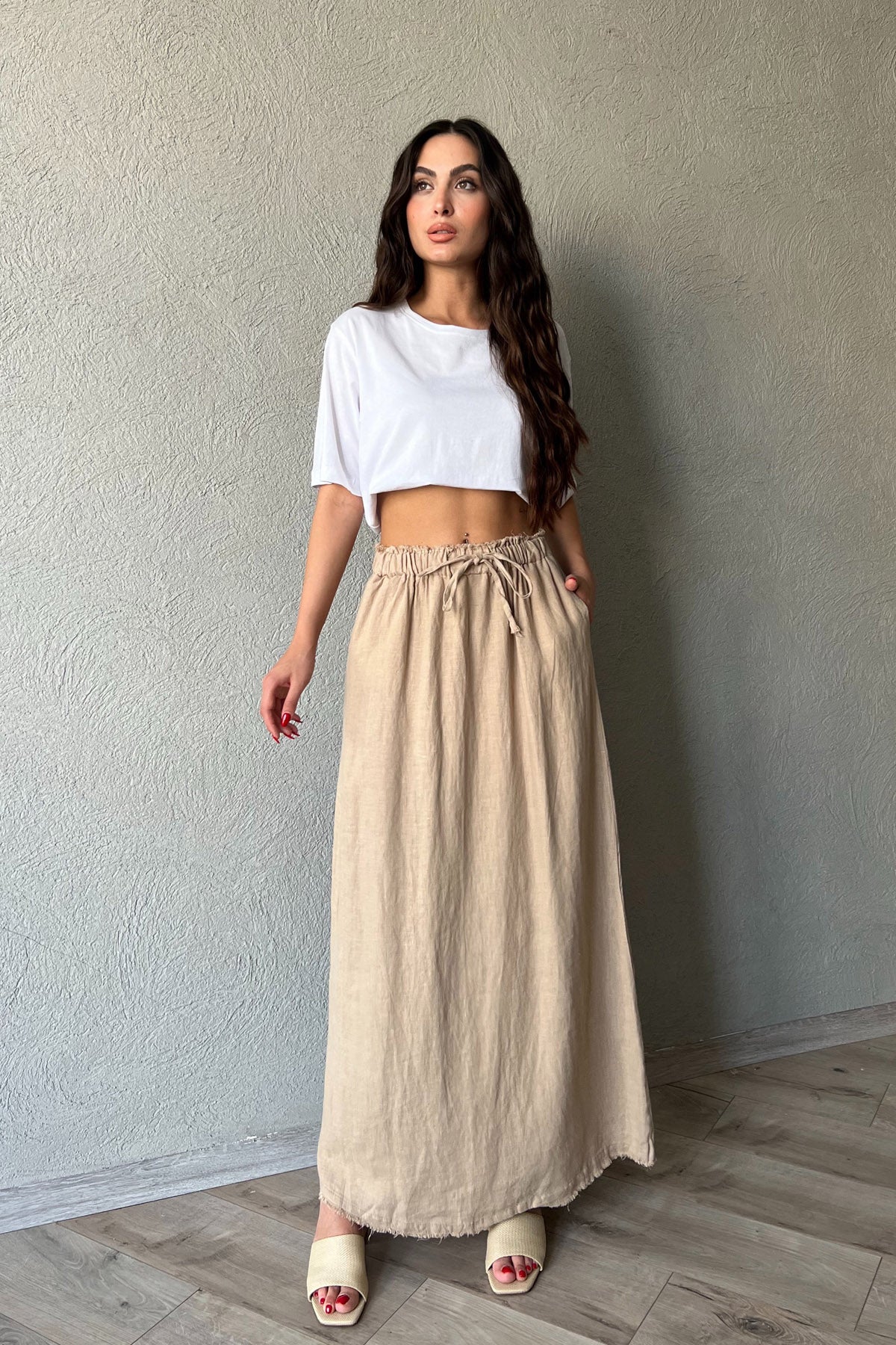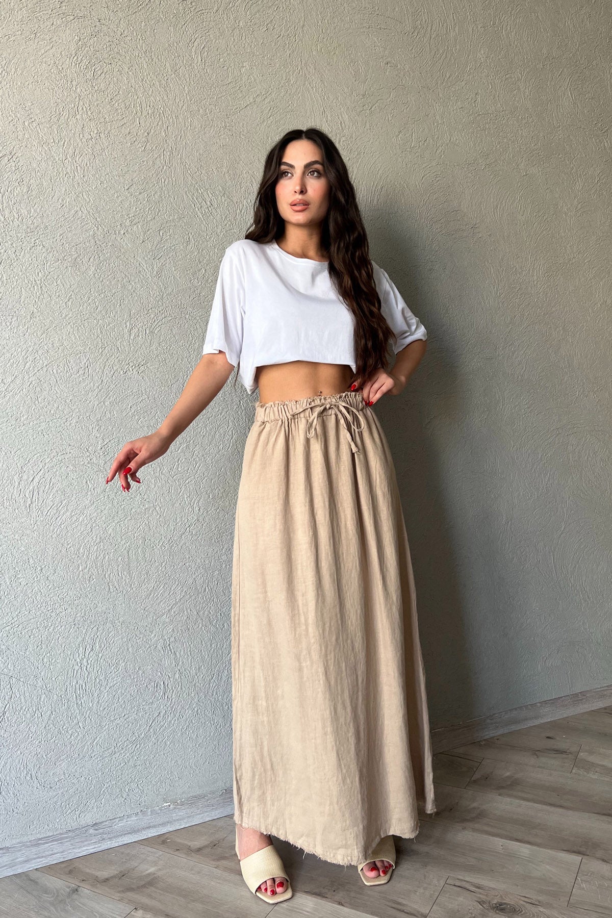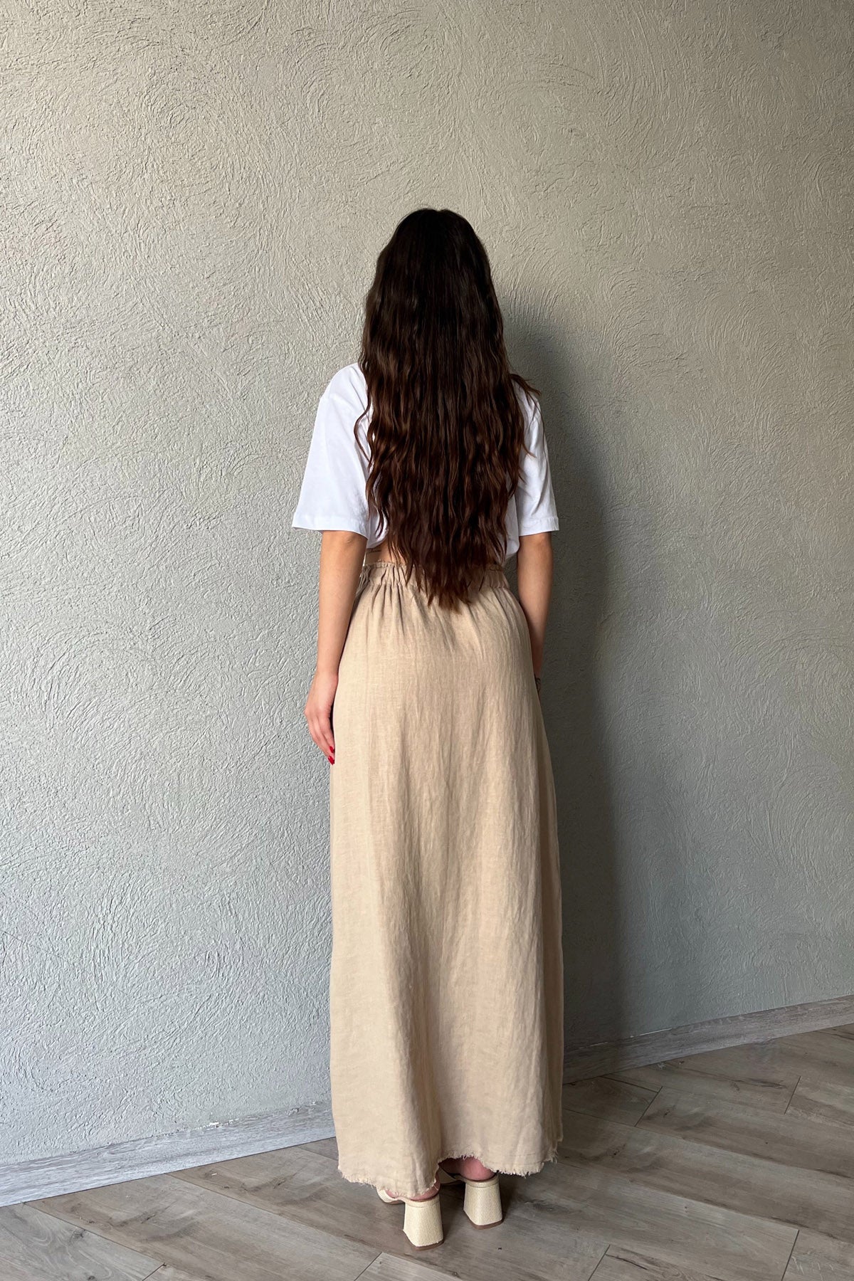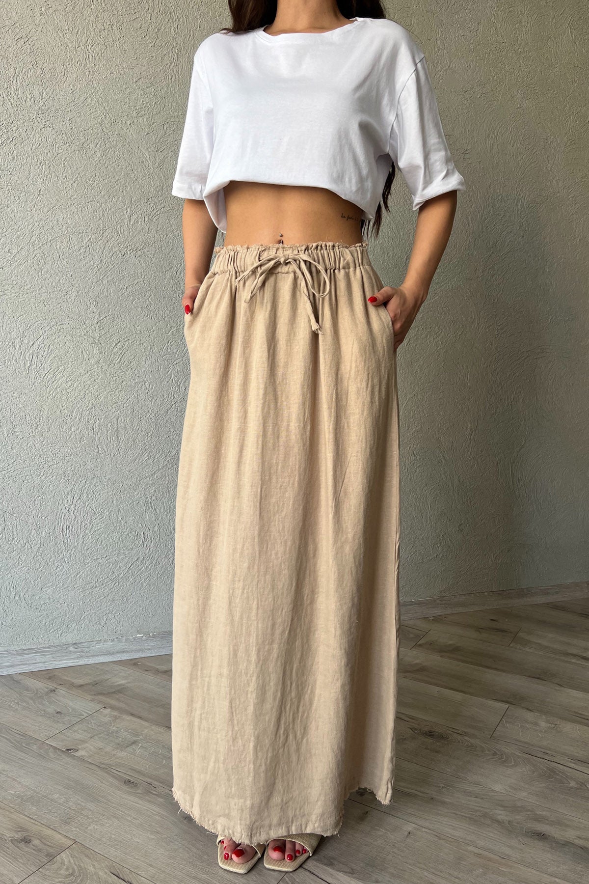 Ürün Detayları ;Beli Bağlama Detaylı Uzun Keten Etek