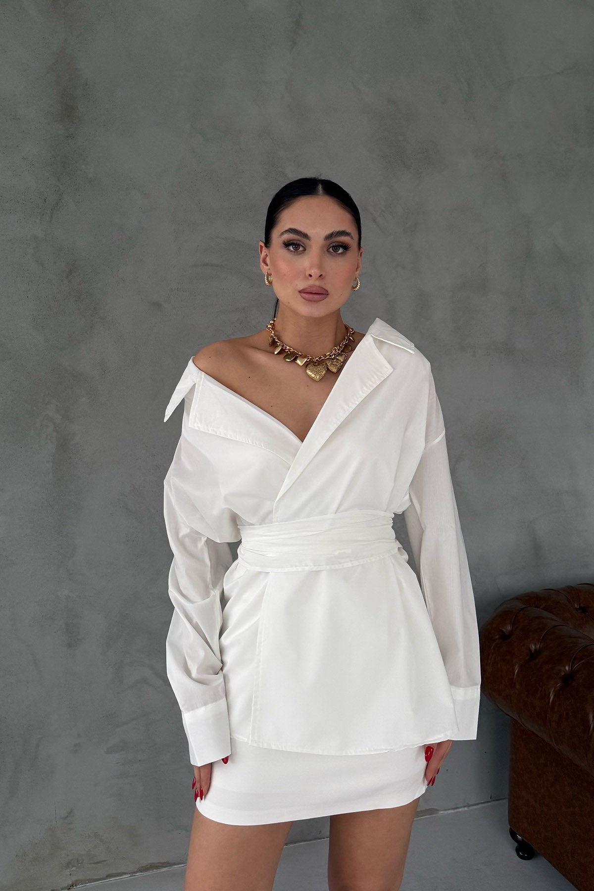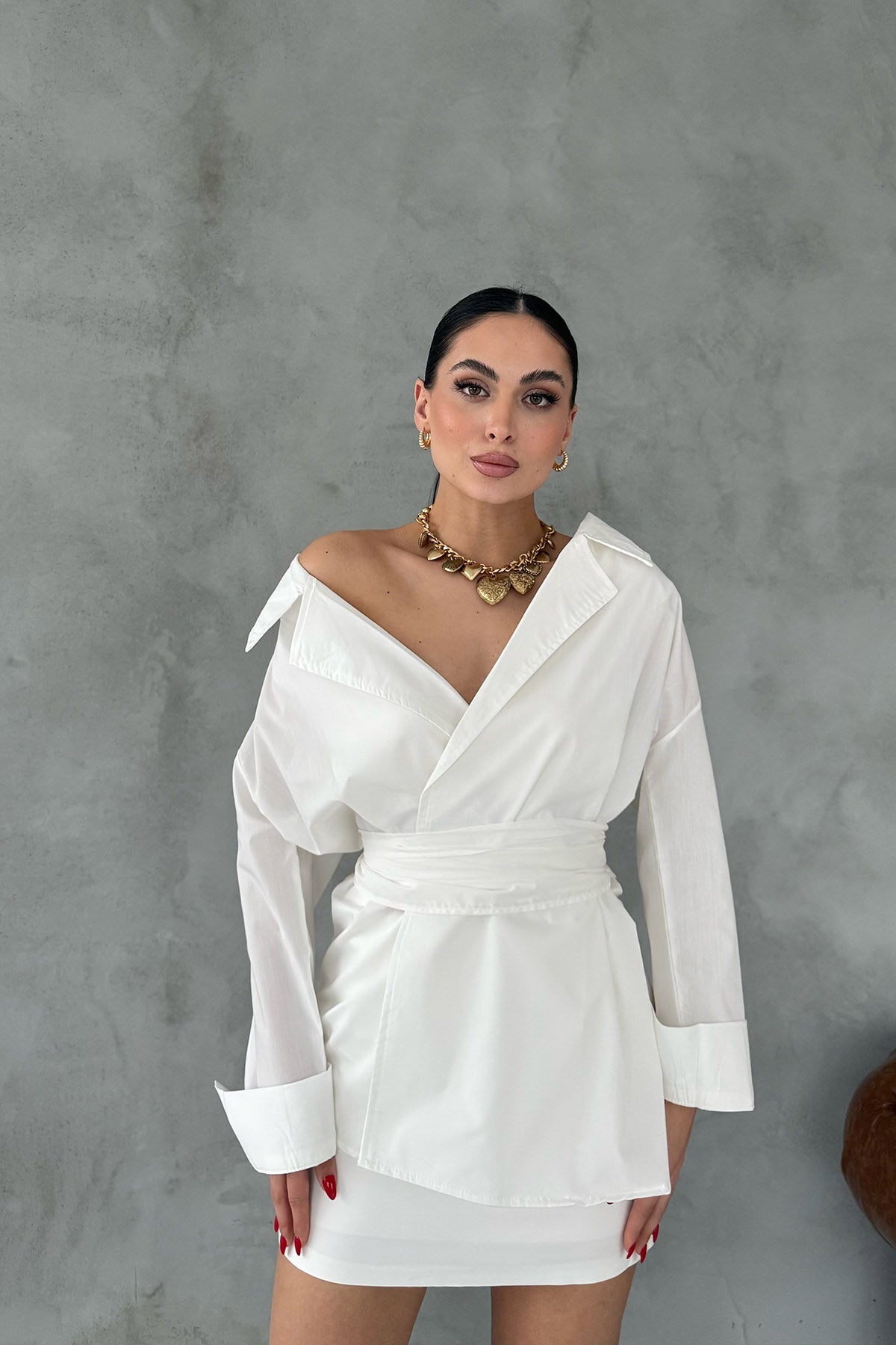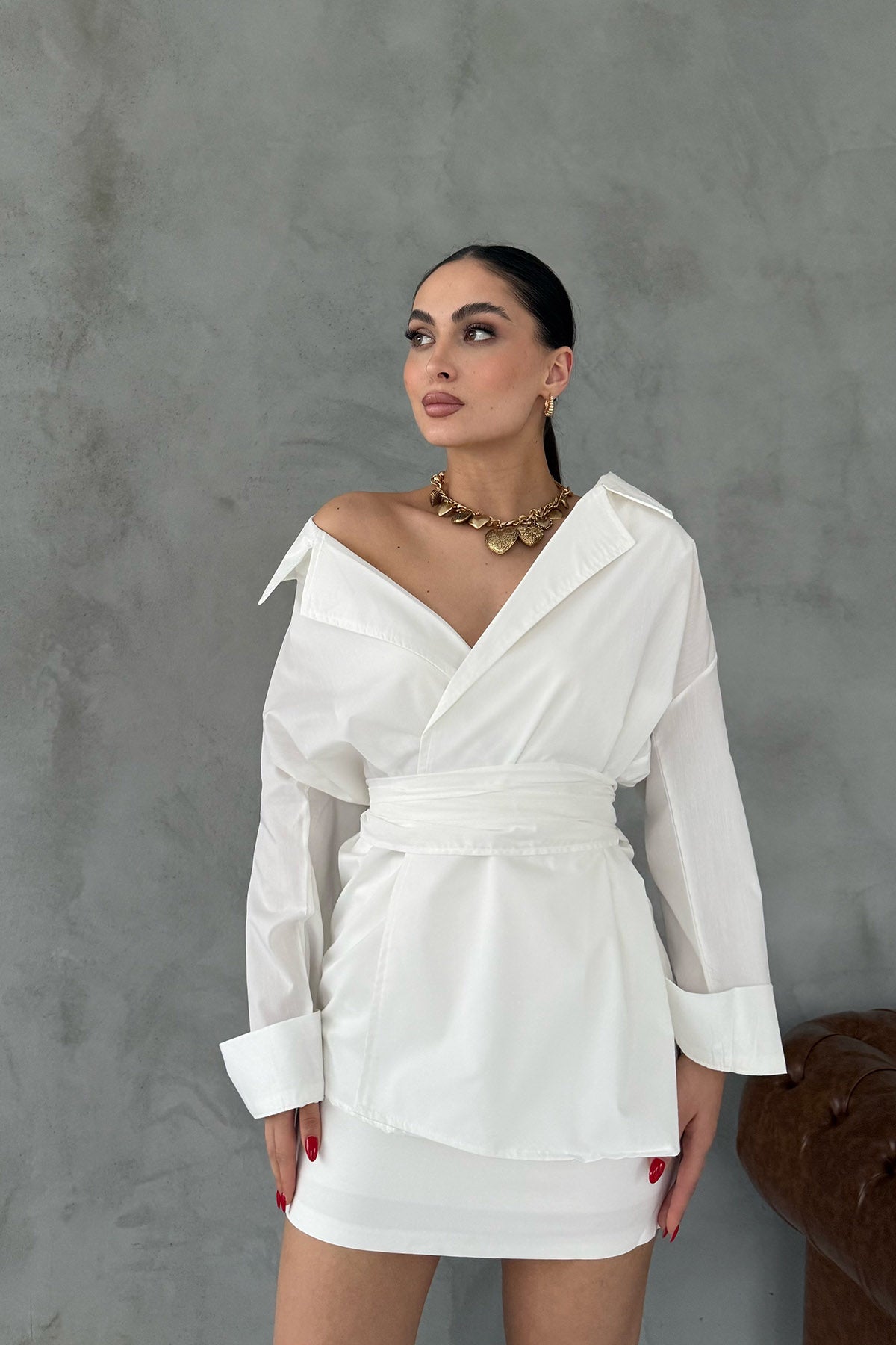 Beyaz Önü Bağlamalı Tasarım Gömlek SY-3023-Beyaz