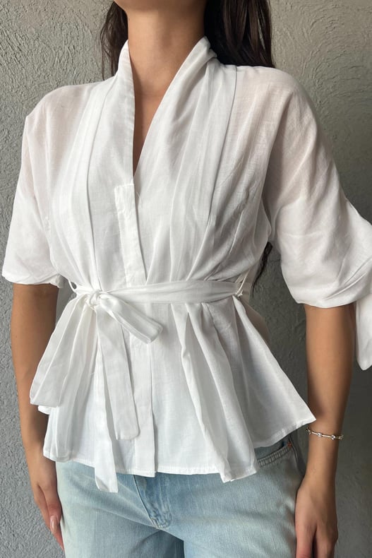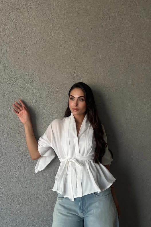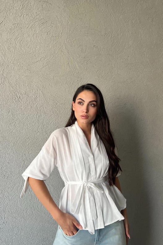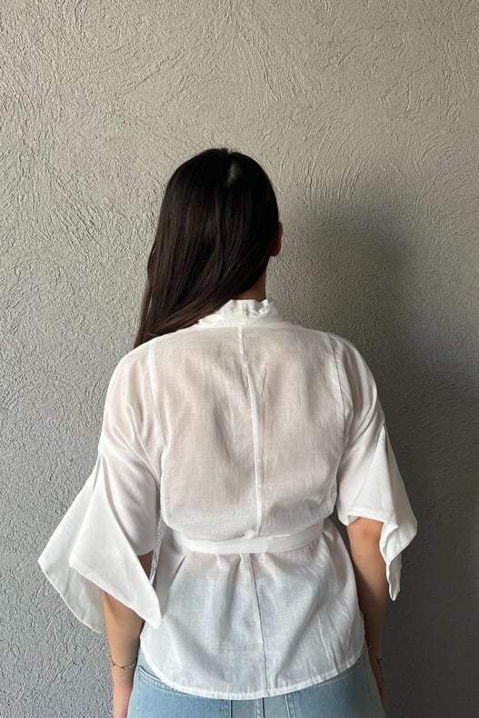 Beyaz Pens Detaylı Vual Kumaş Gömlek (Kemersiz) SY-2850-Beyaz