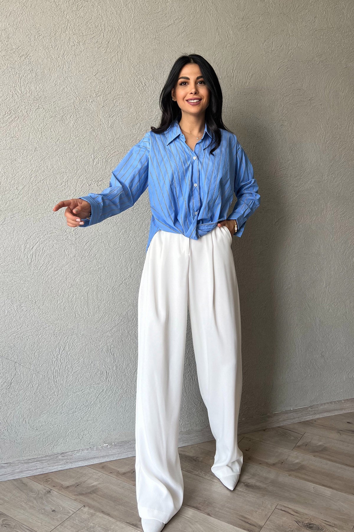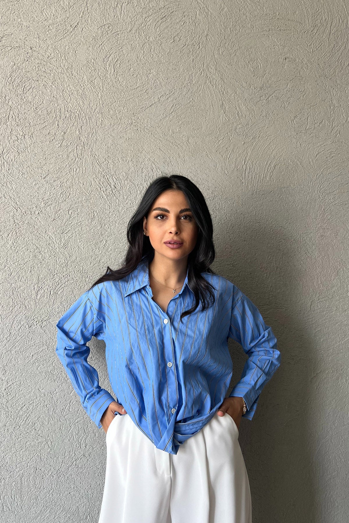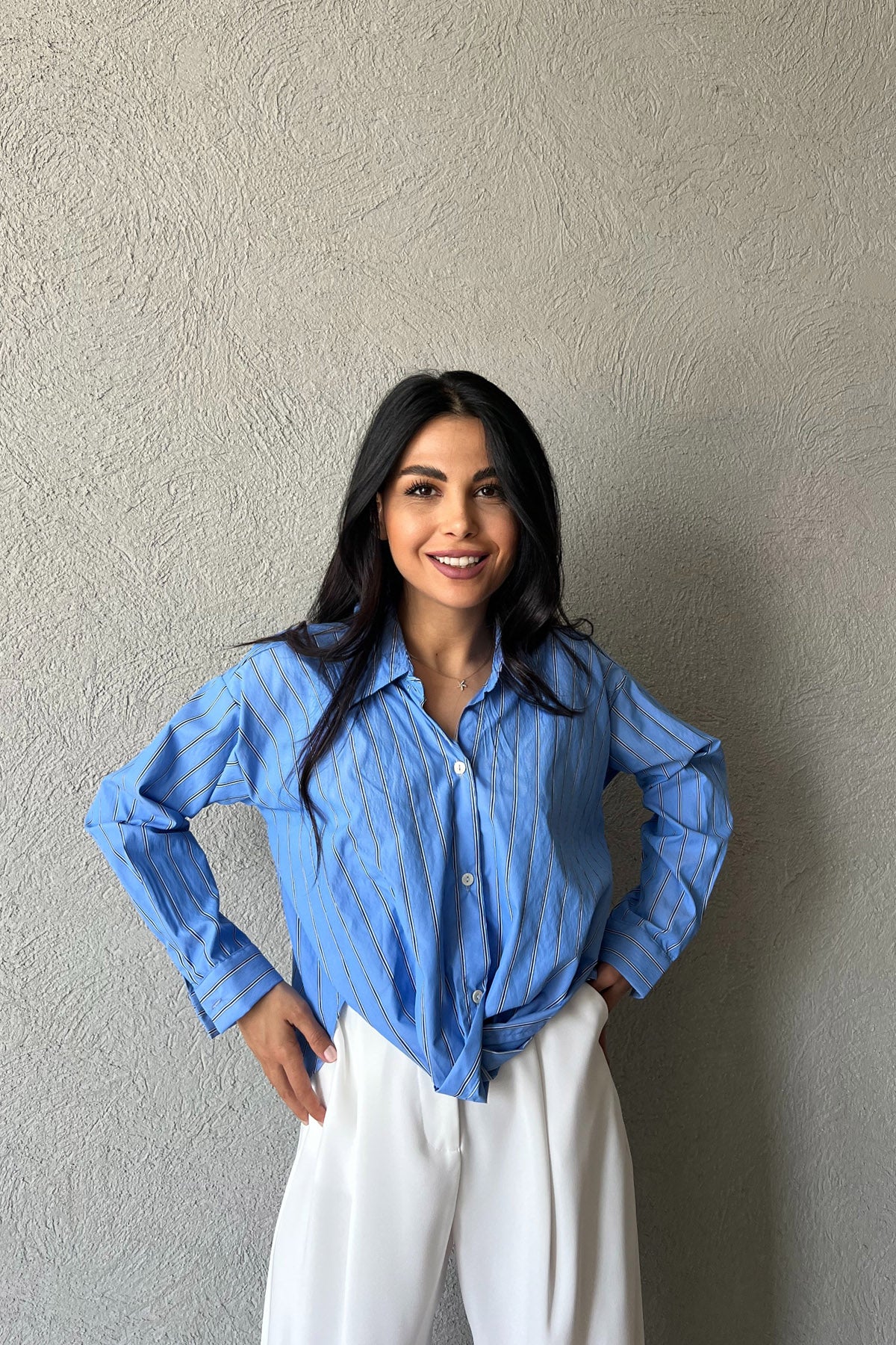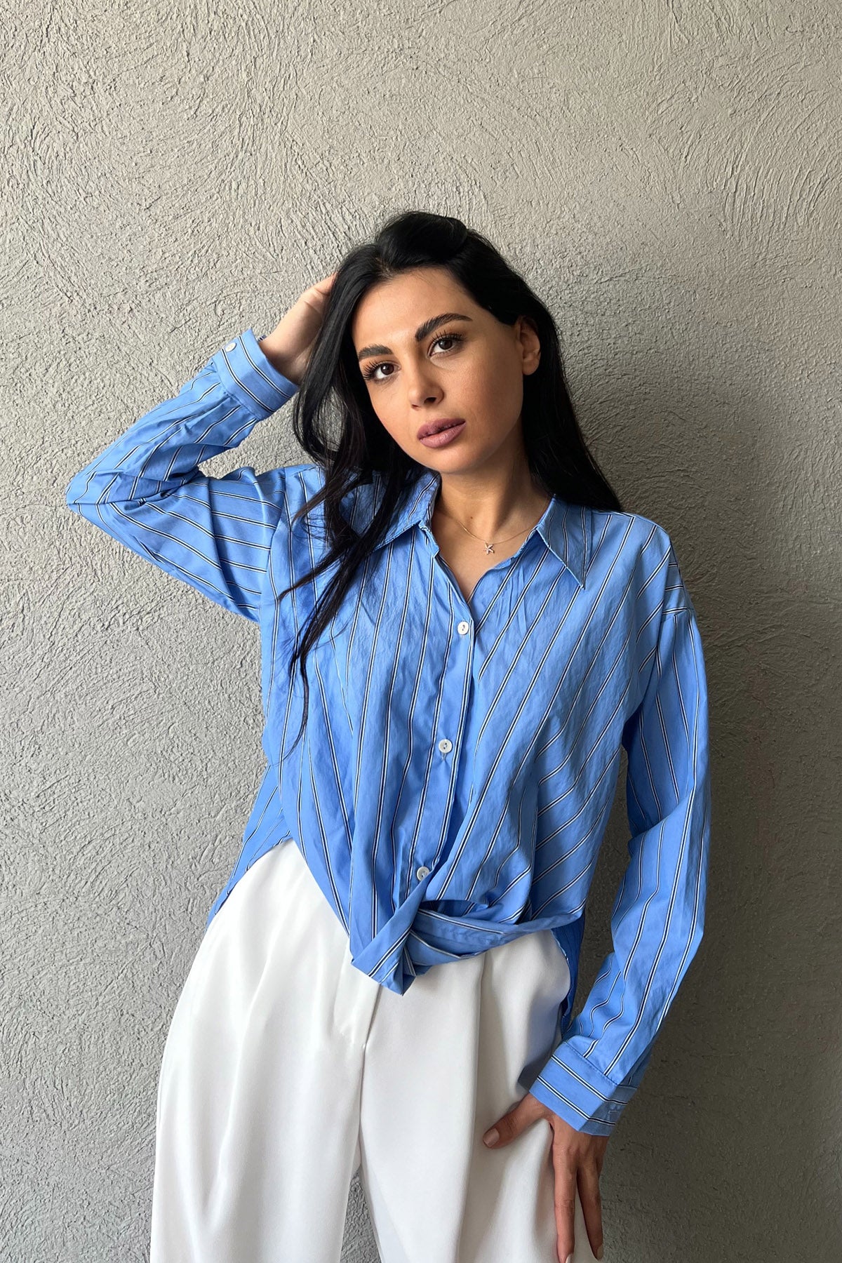 Mavi Çizgili Önü Tasarım Bağlamalı Gömlek SY-2046-Mavi