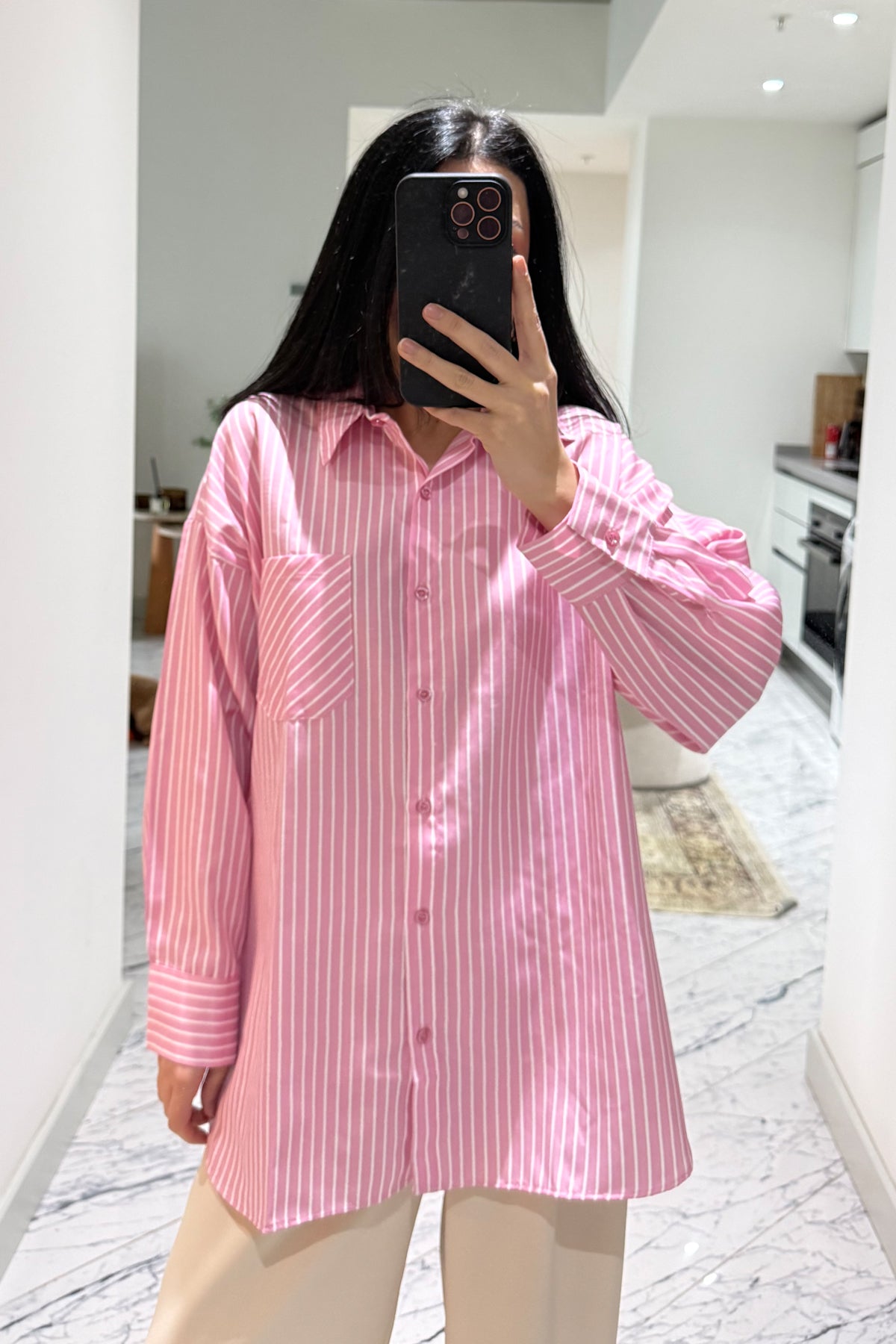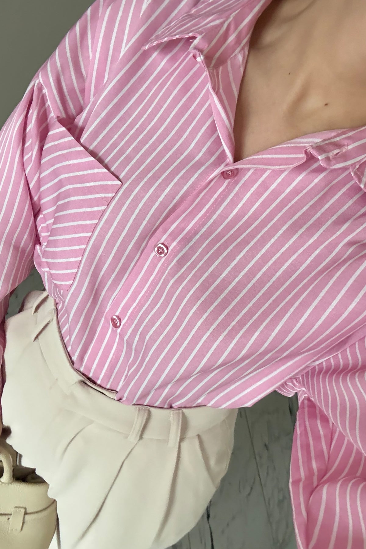 Pembe Çizgili Kadın Gömlek SYM-3428-Pembe