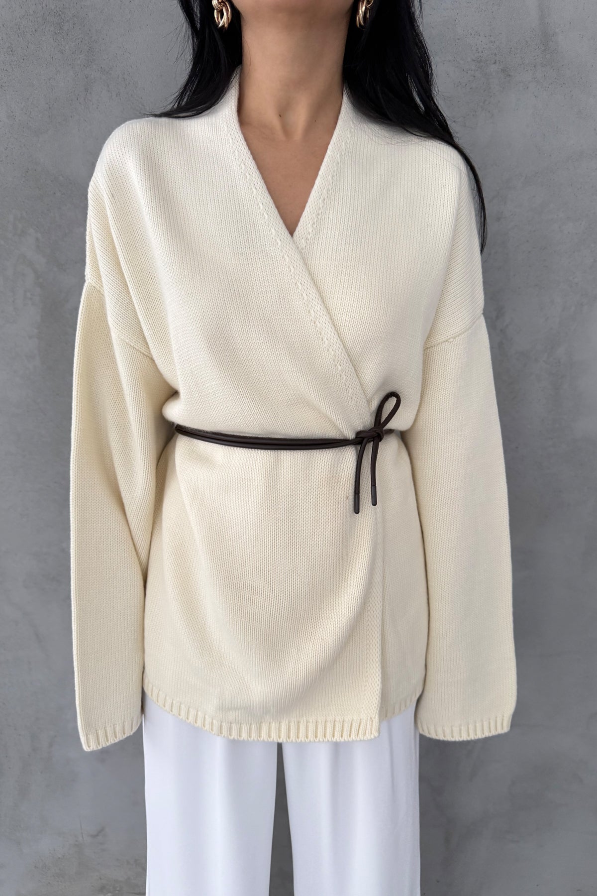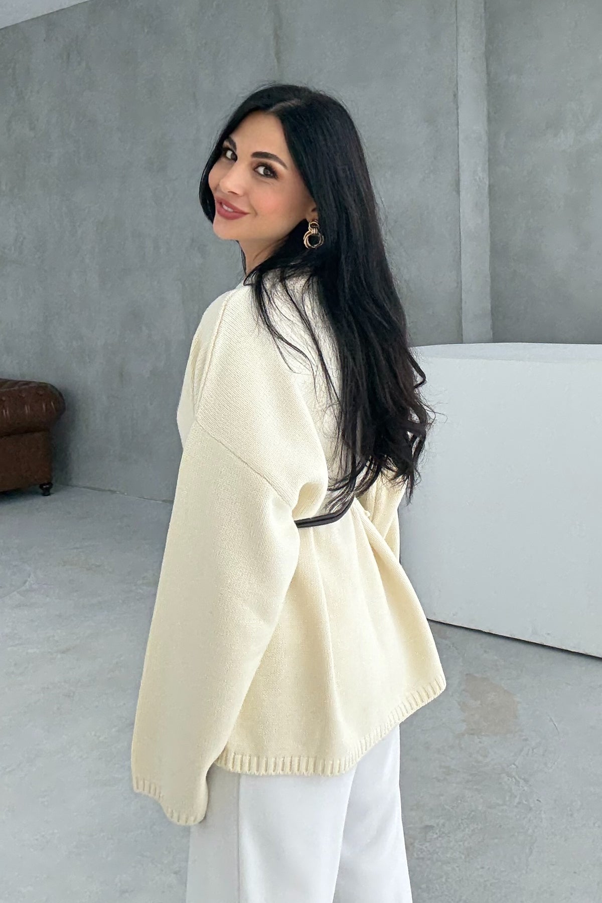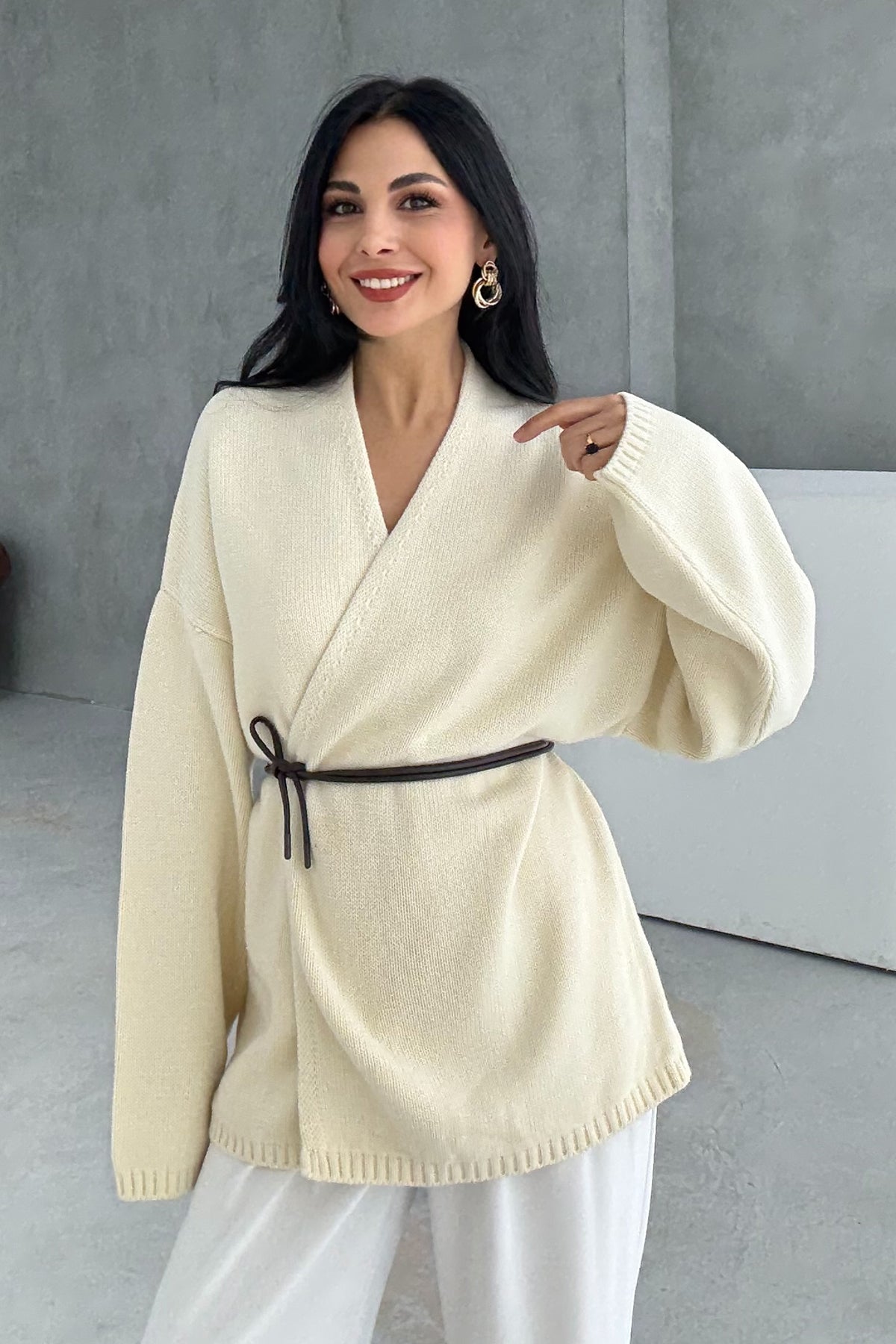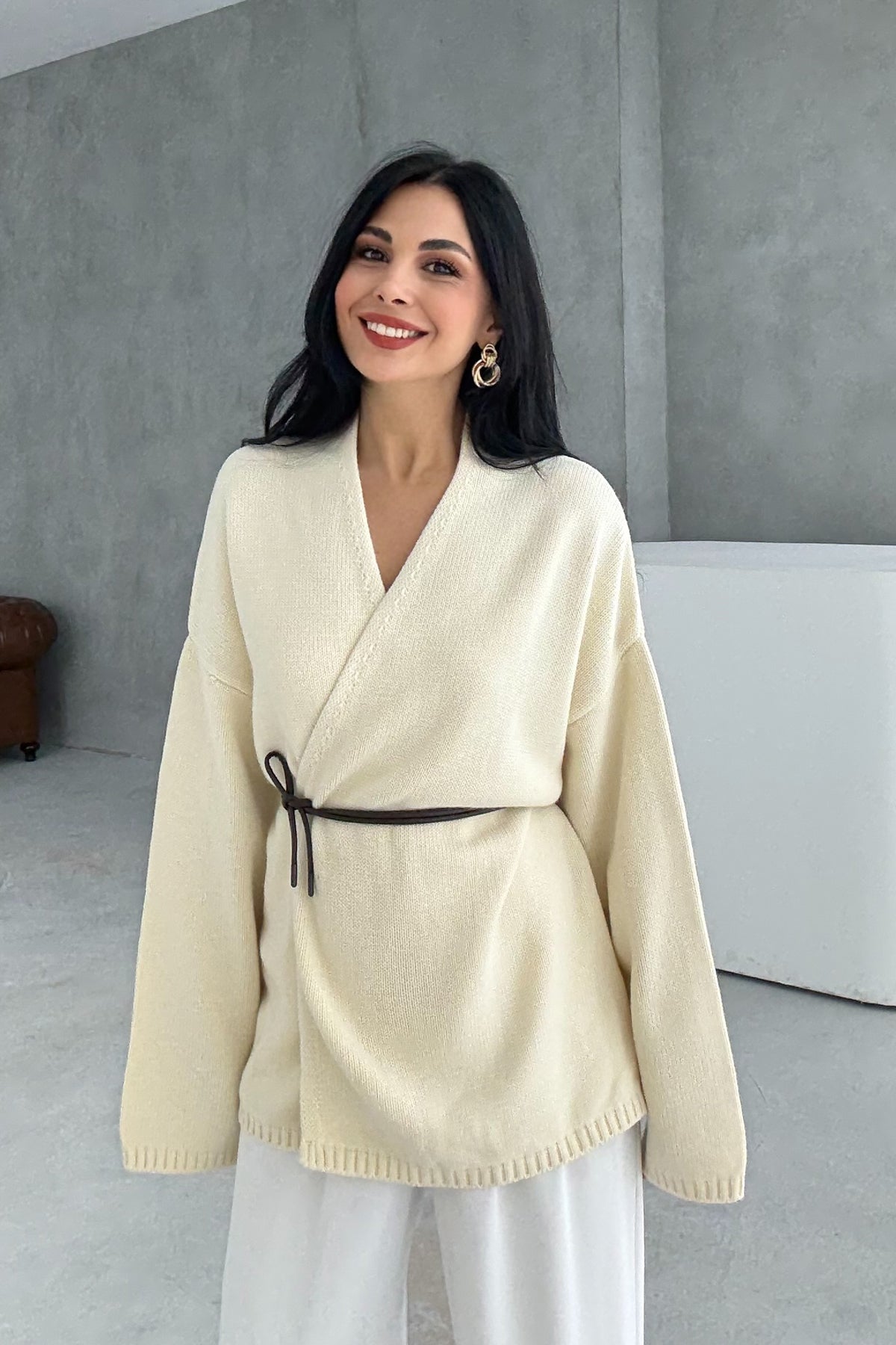 Ürün Detayları ;Krem Deri Kemerli Triko Hırka