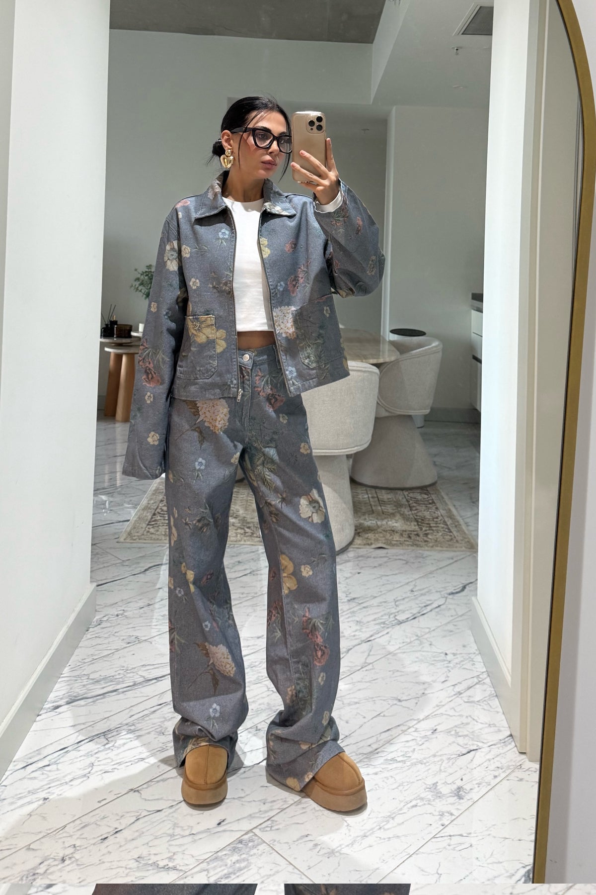 Ürün Detayları:Mavi Çiçek Desenli Yüksek Bel Vintage Denim Pantolon