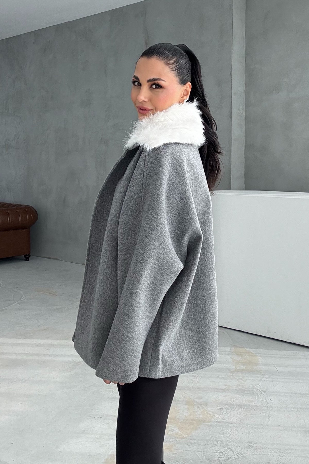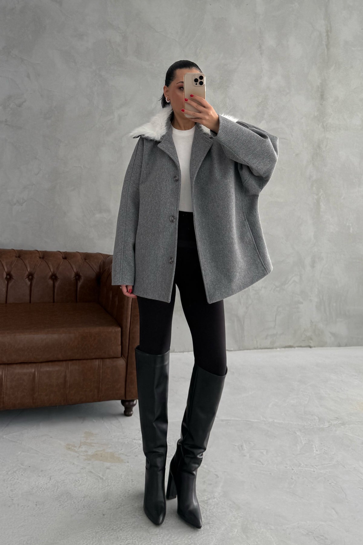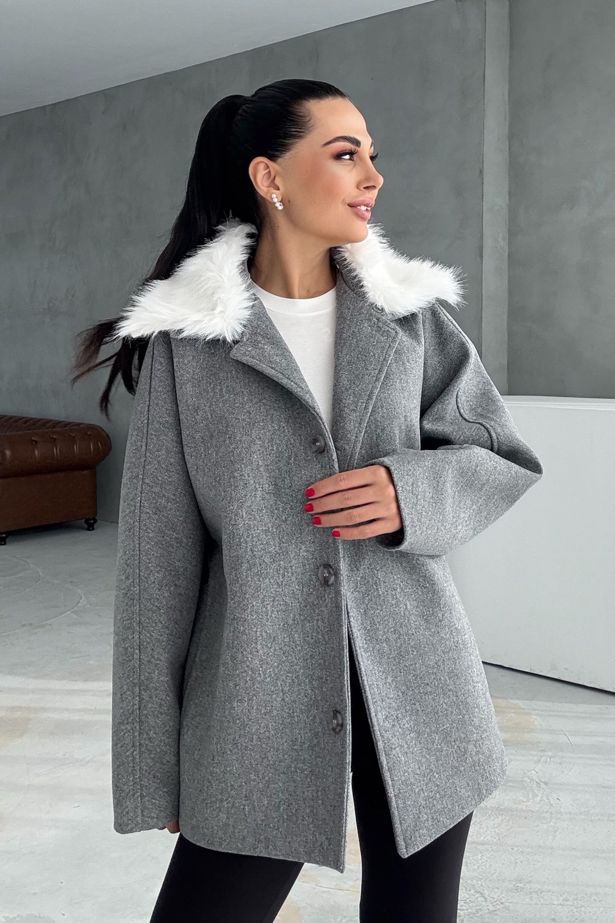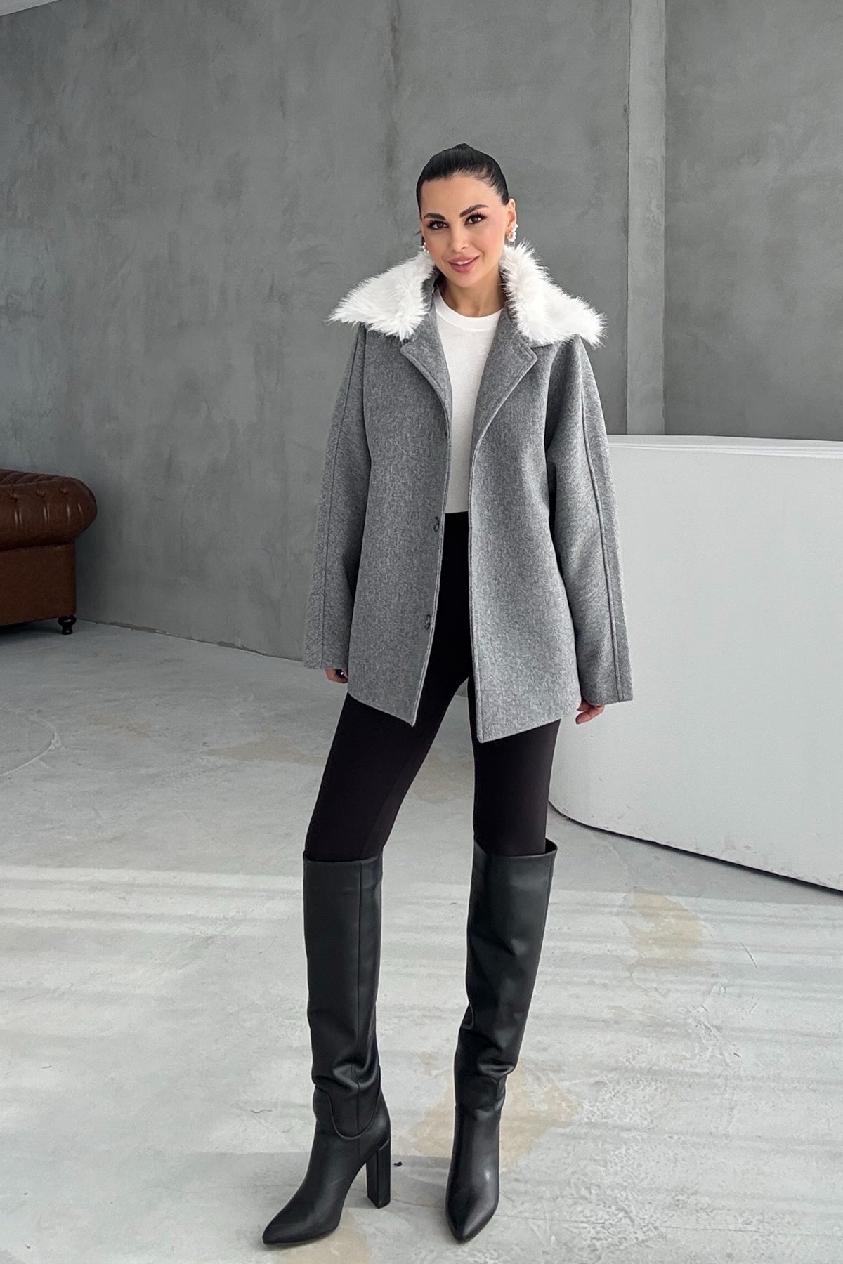 Yakası Kürklü Gri Kaşe Kısa Kaban SY-3442-Gri