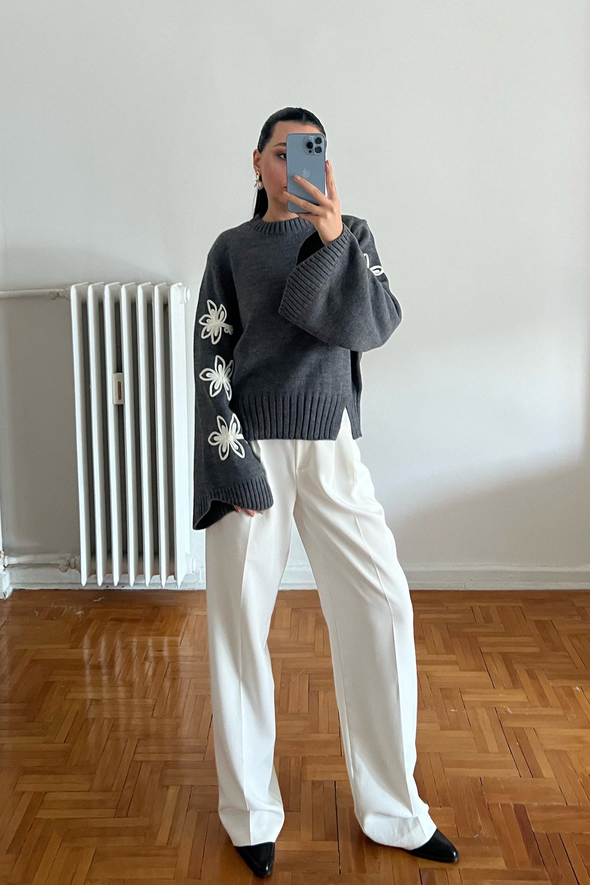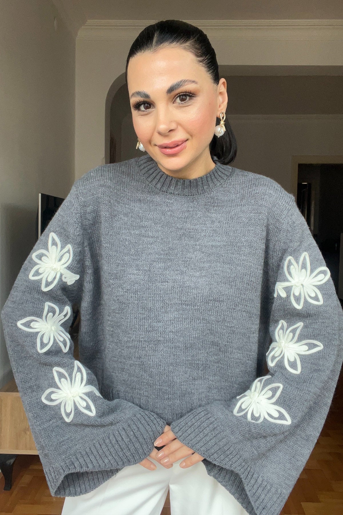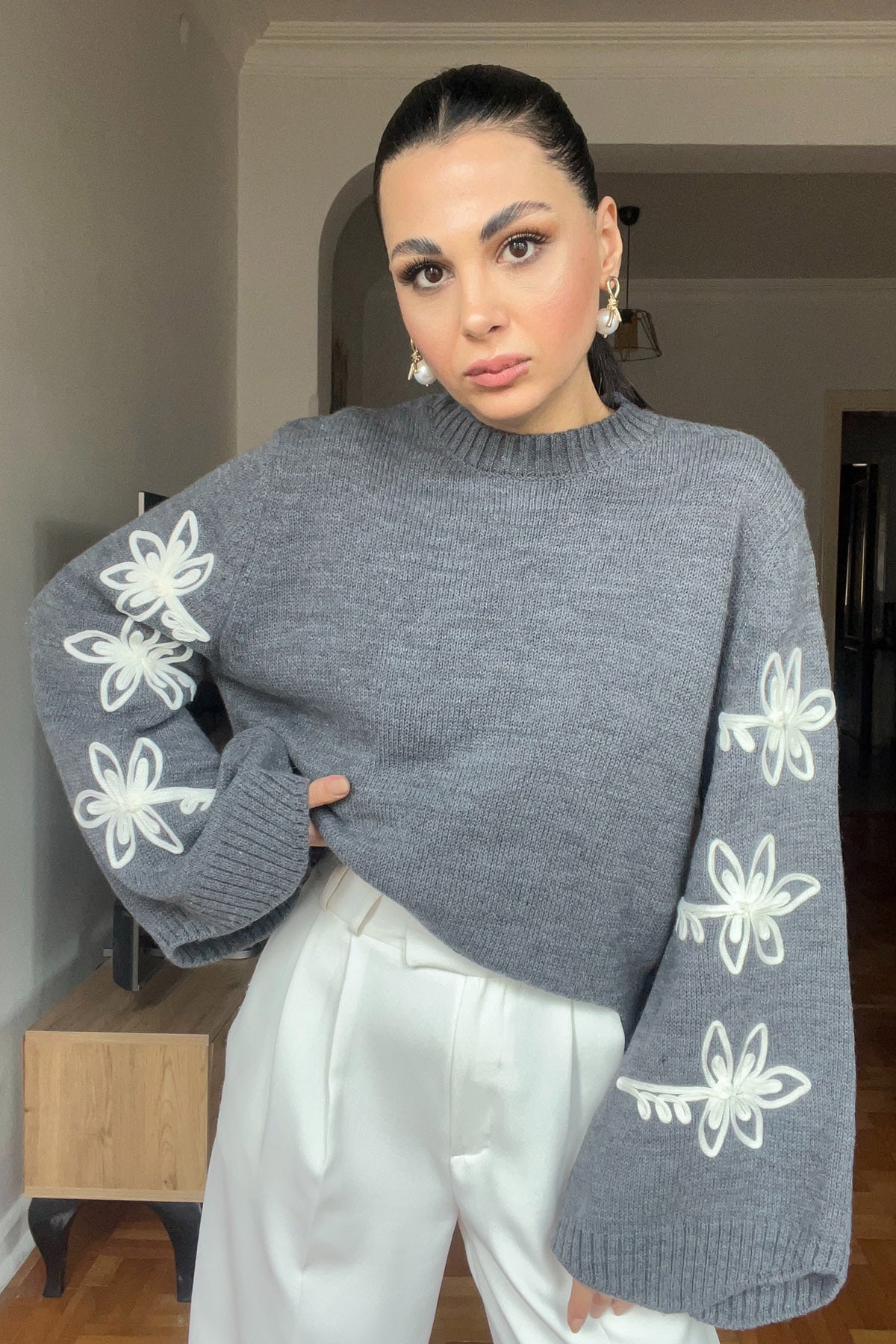 Antrasit Tasarım Kolları Nakışlı Kazak SY-2837-Antrasit