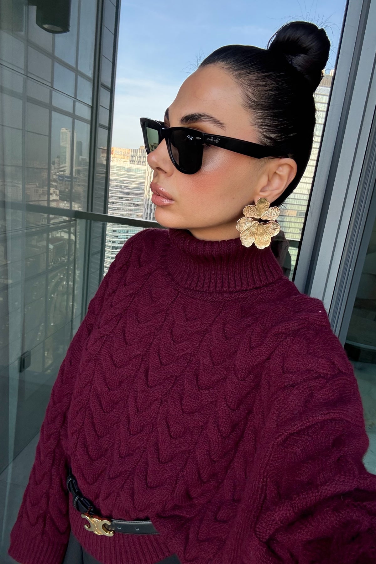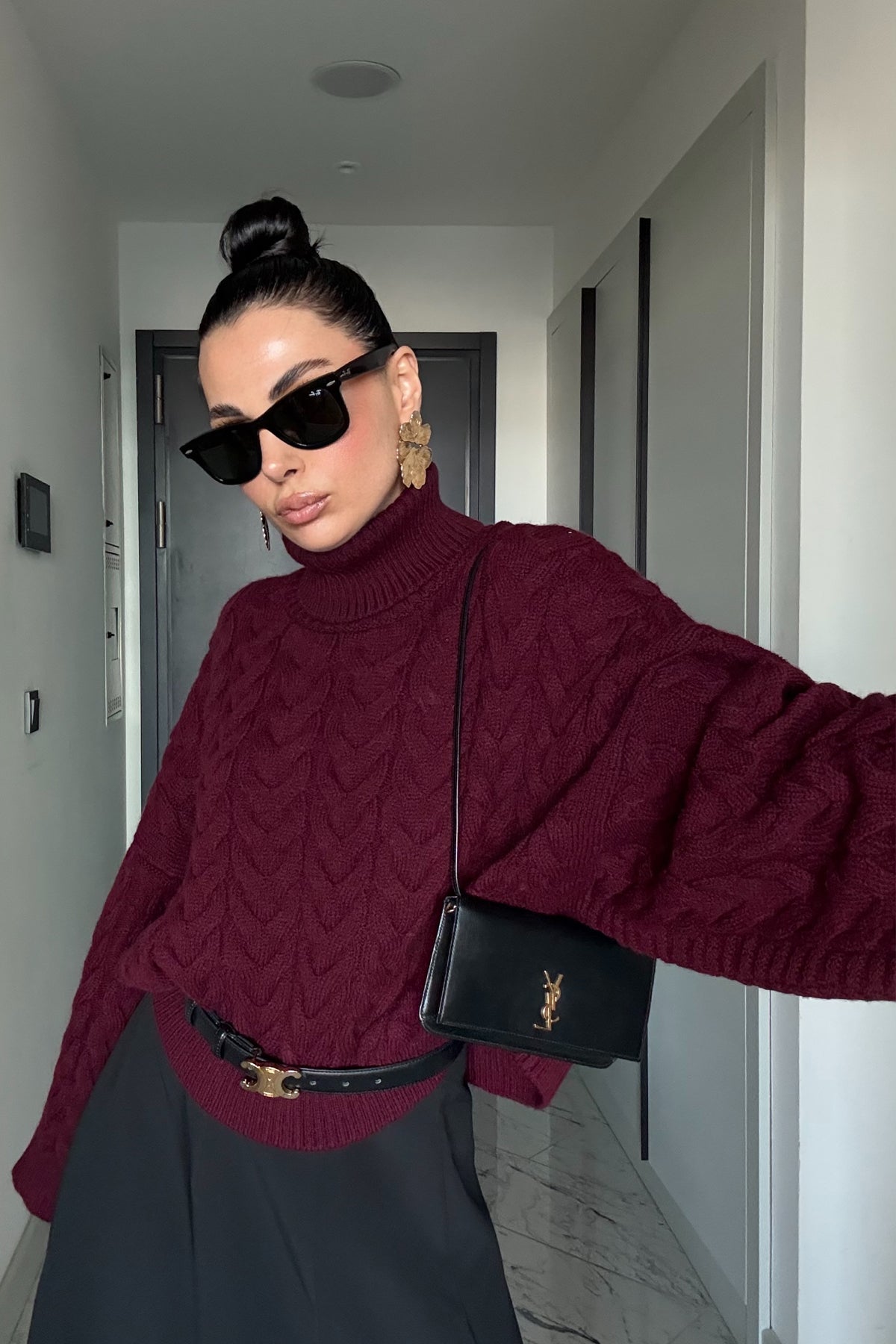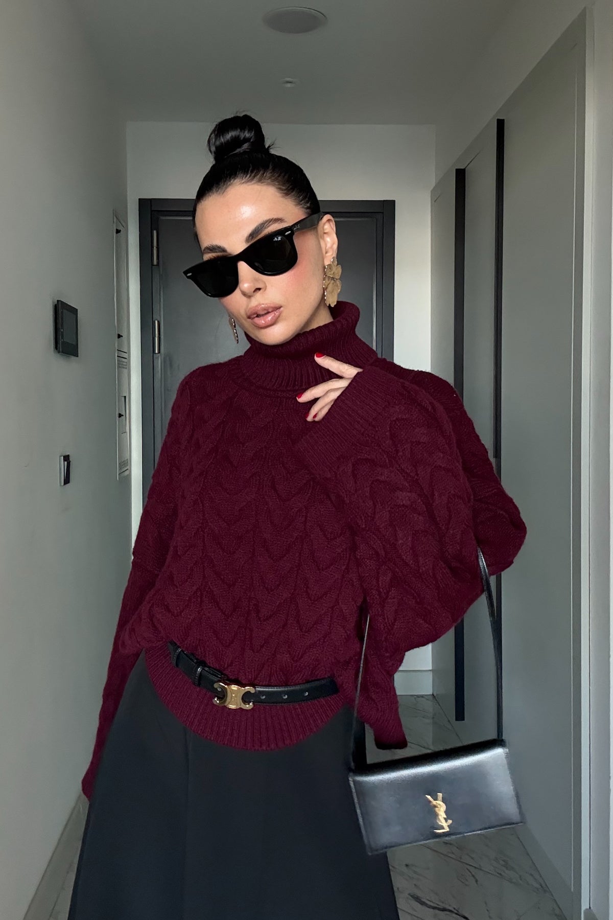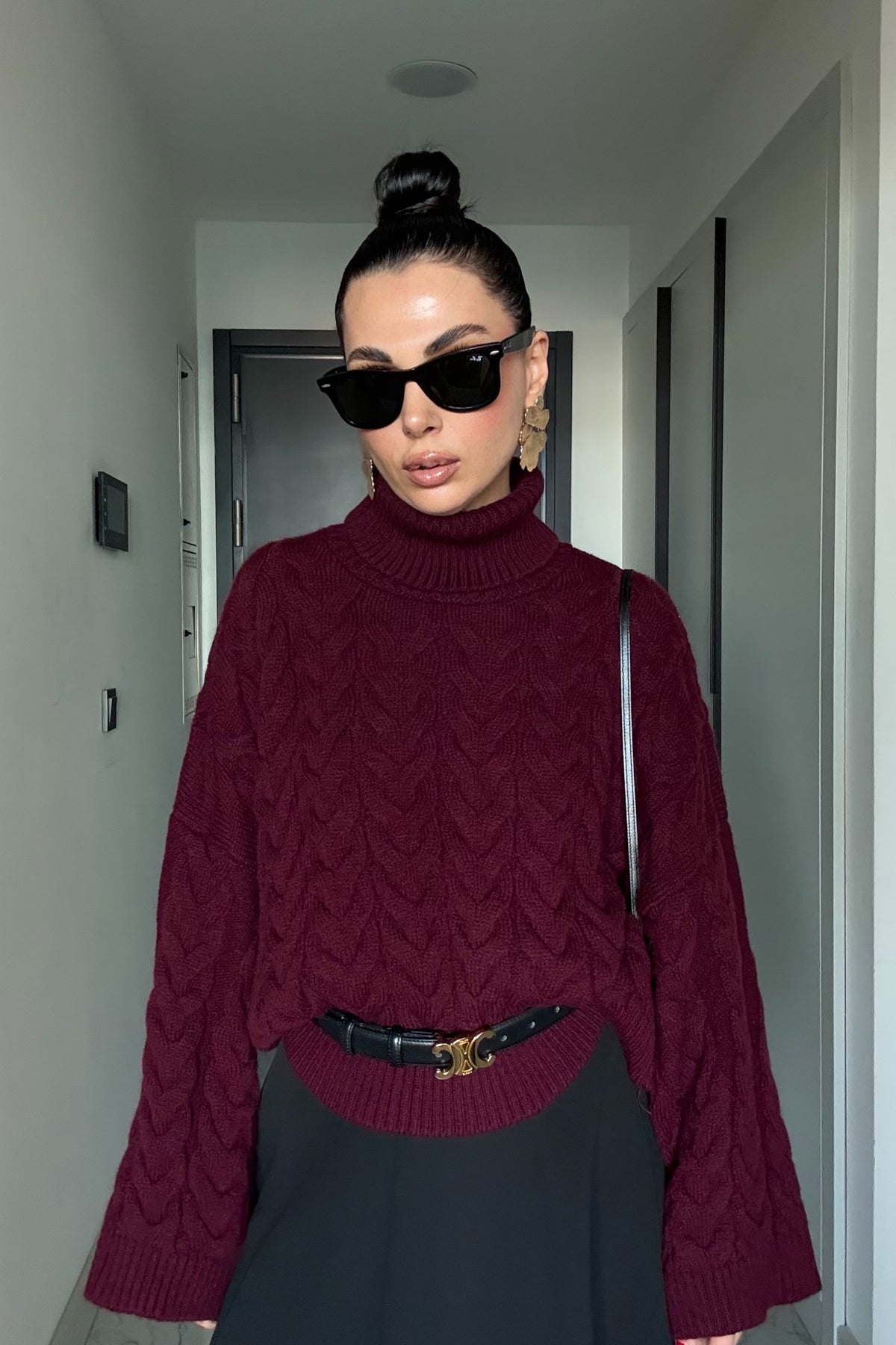 Ürün Detayları ;Bordo Saç Örgü Boğazlı Kazak