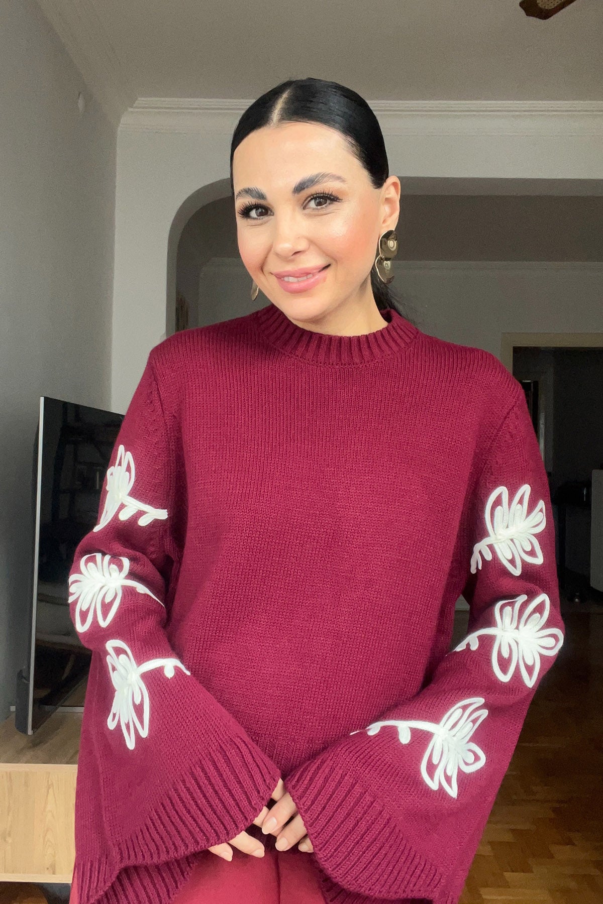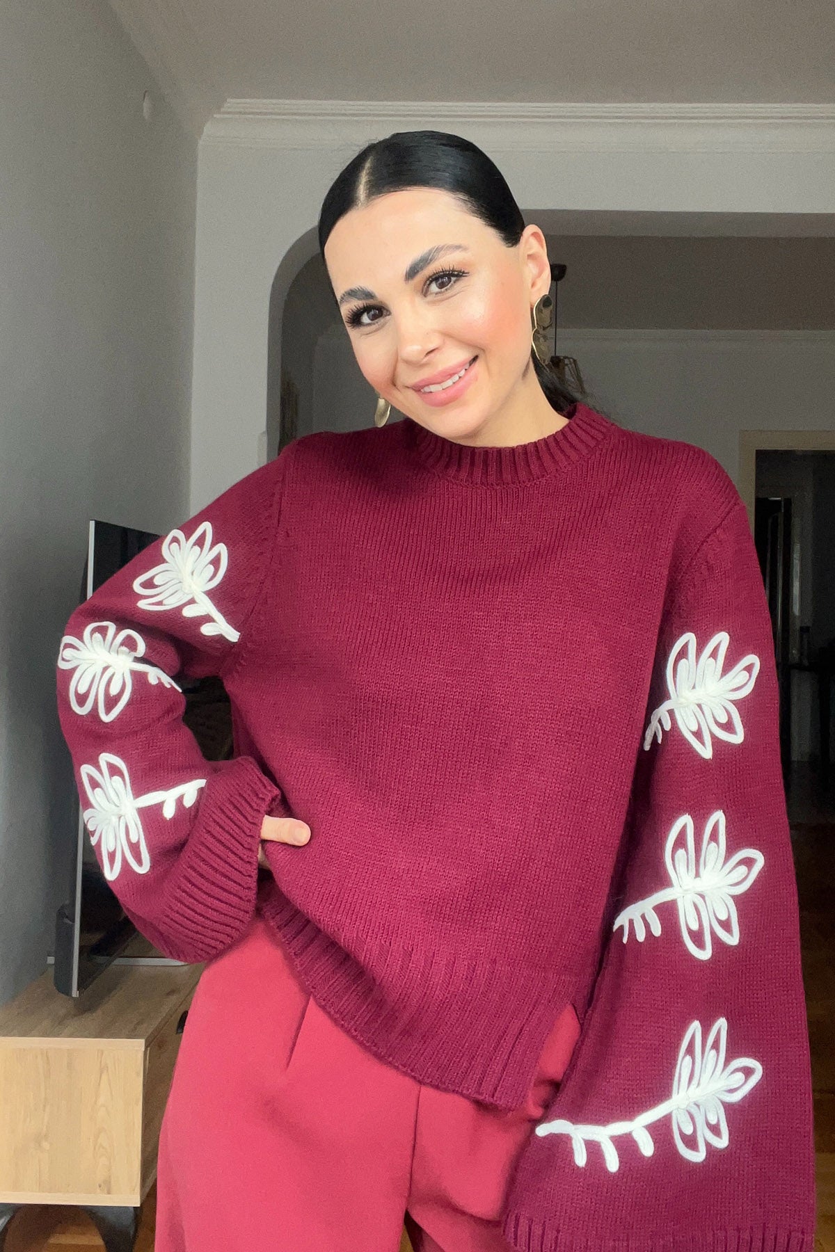 Bordo Tasarım Kolları Nakışlı Kazak SY-2837-Bordo