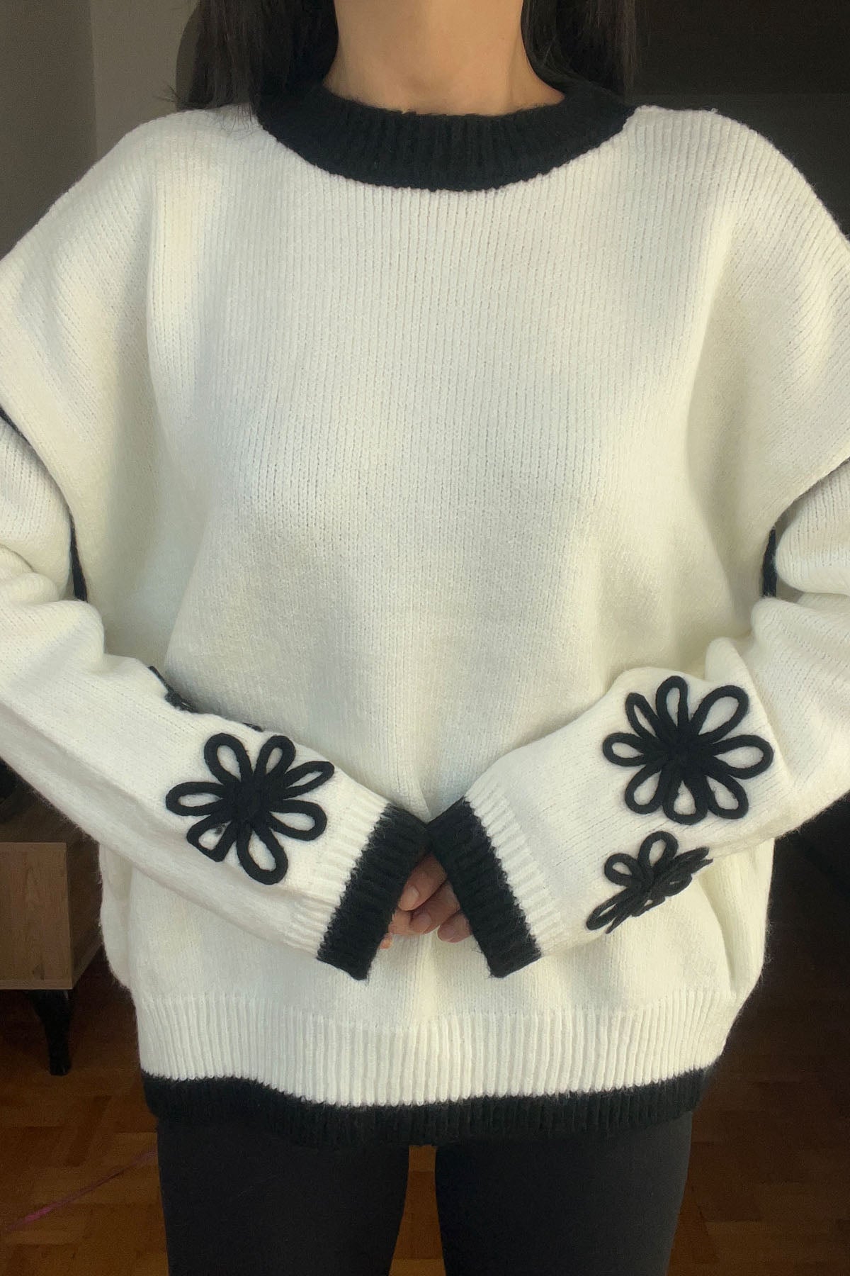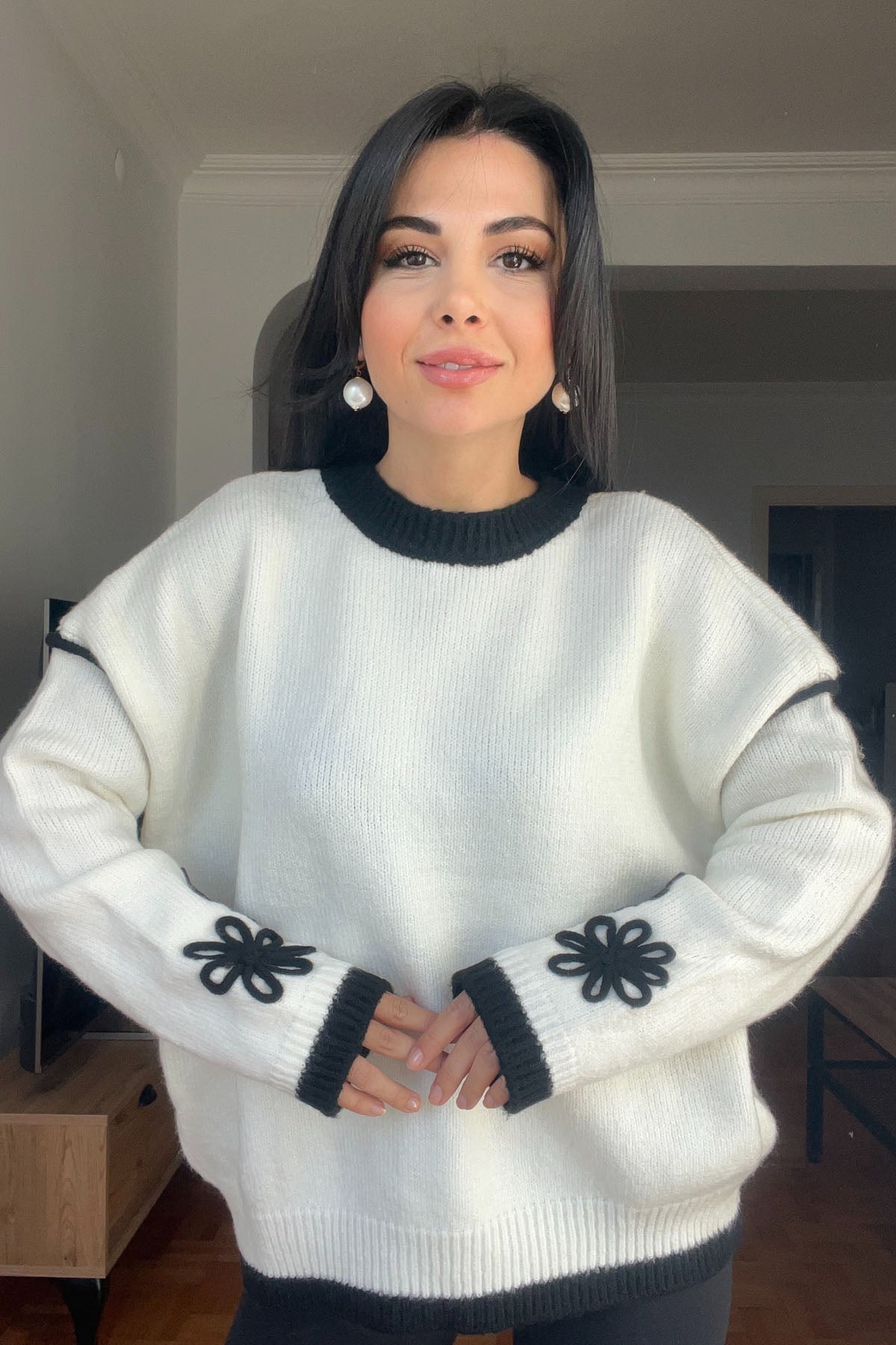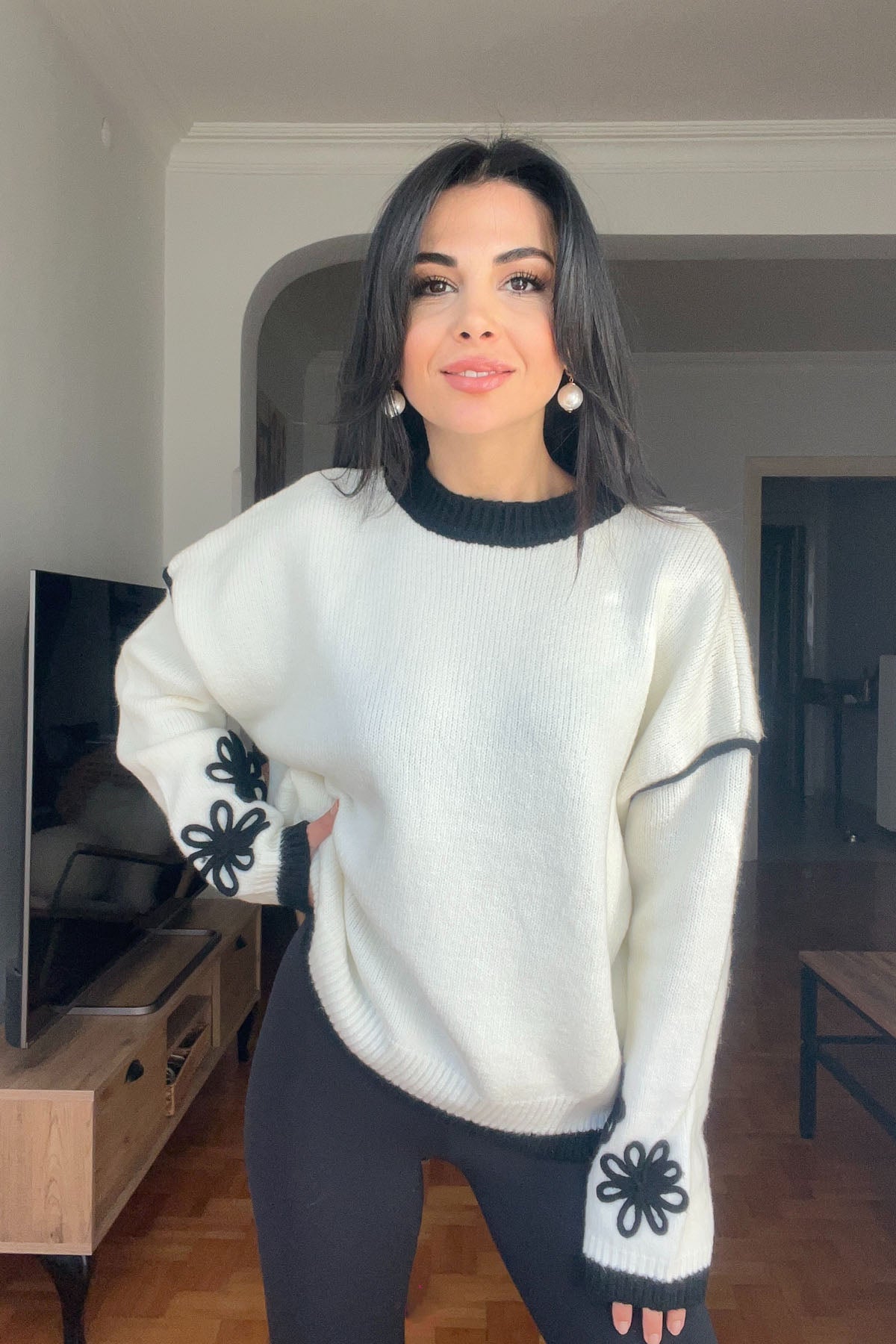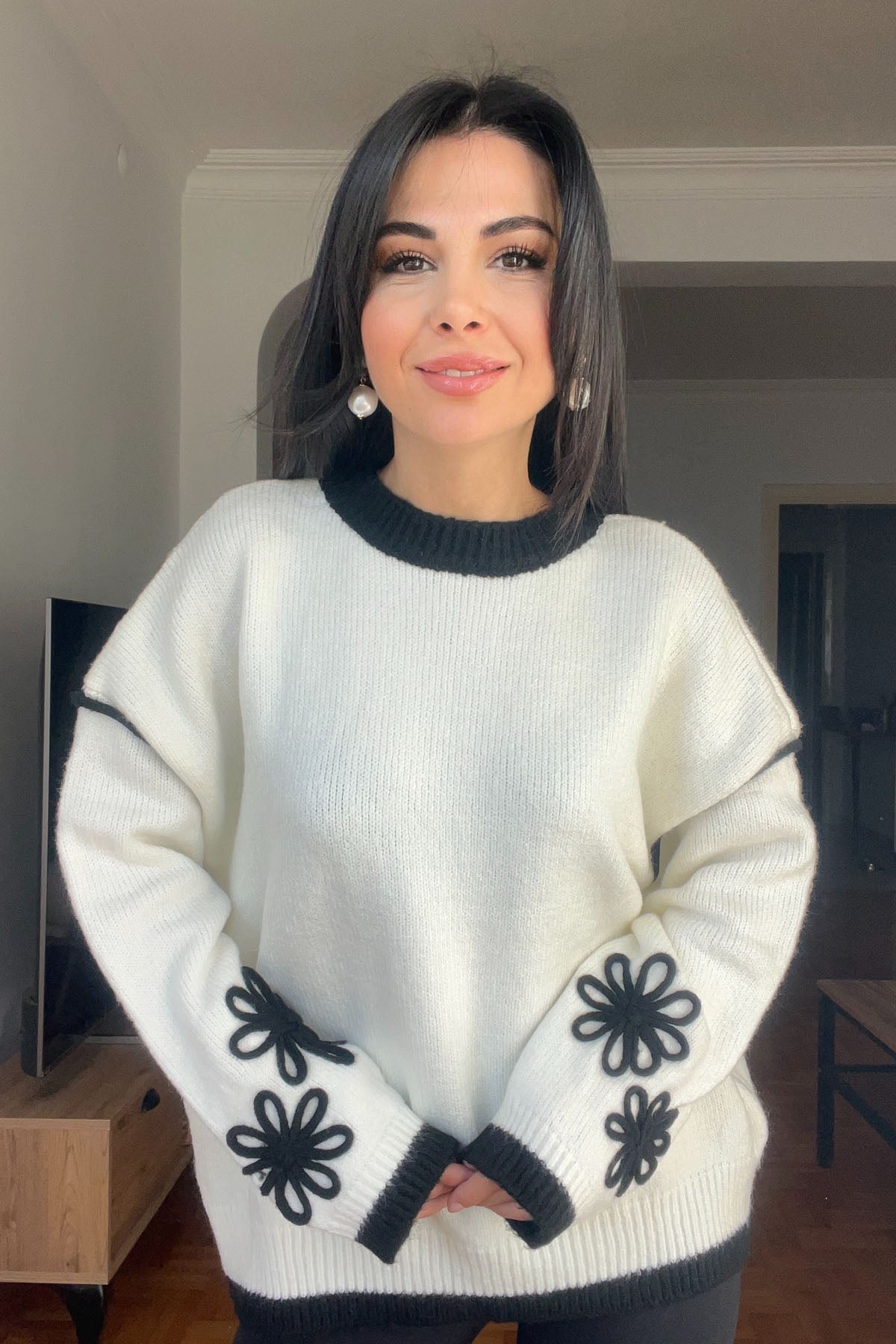 Ekru Kolu Çiçek Nakışlı Triko Kazak SY-2730-Ekru