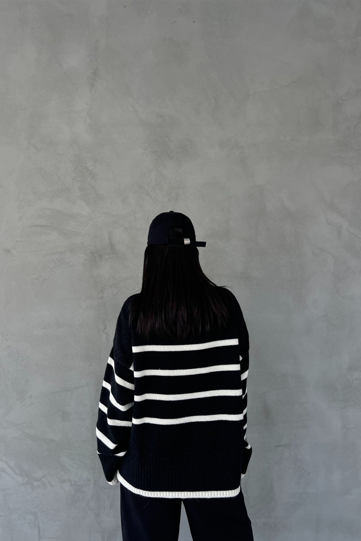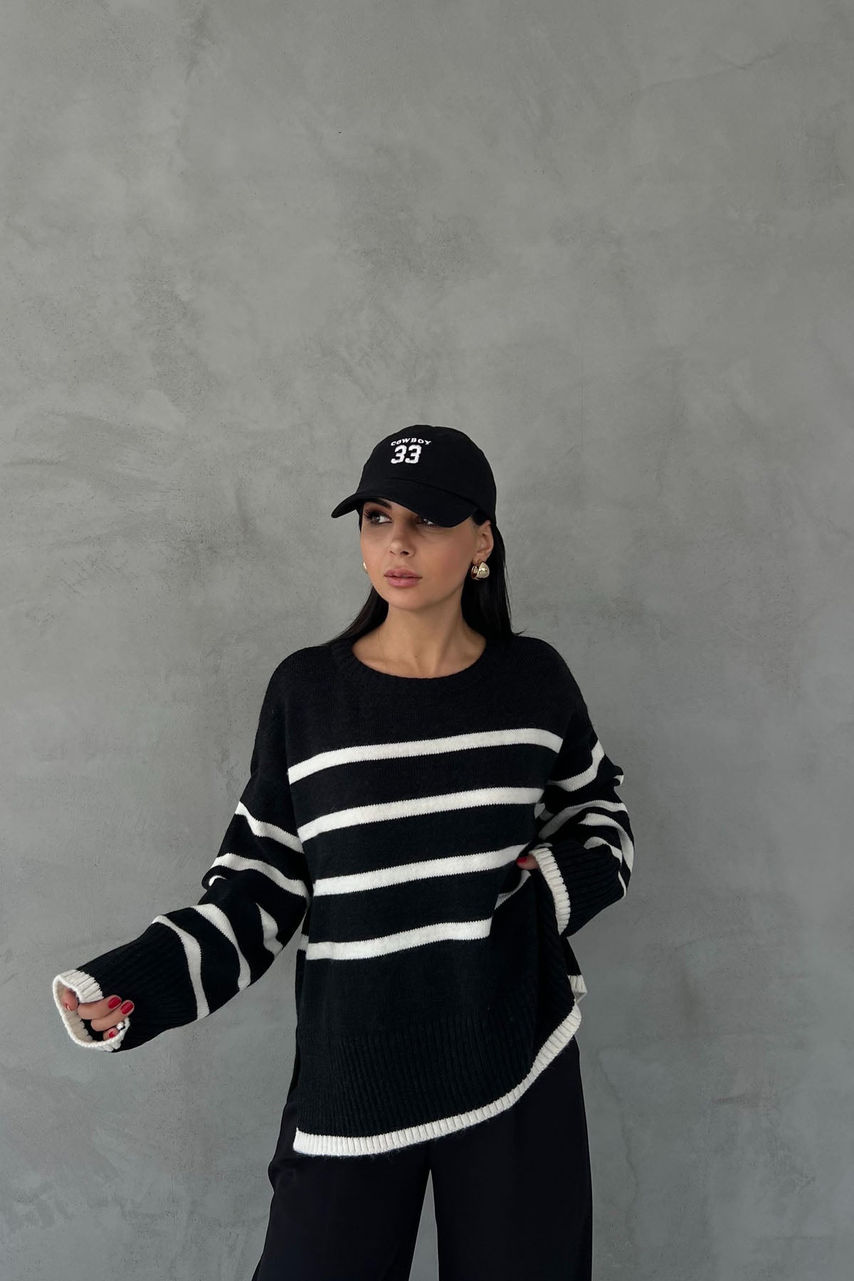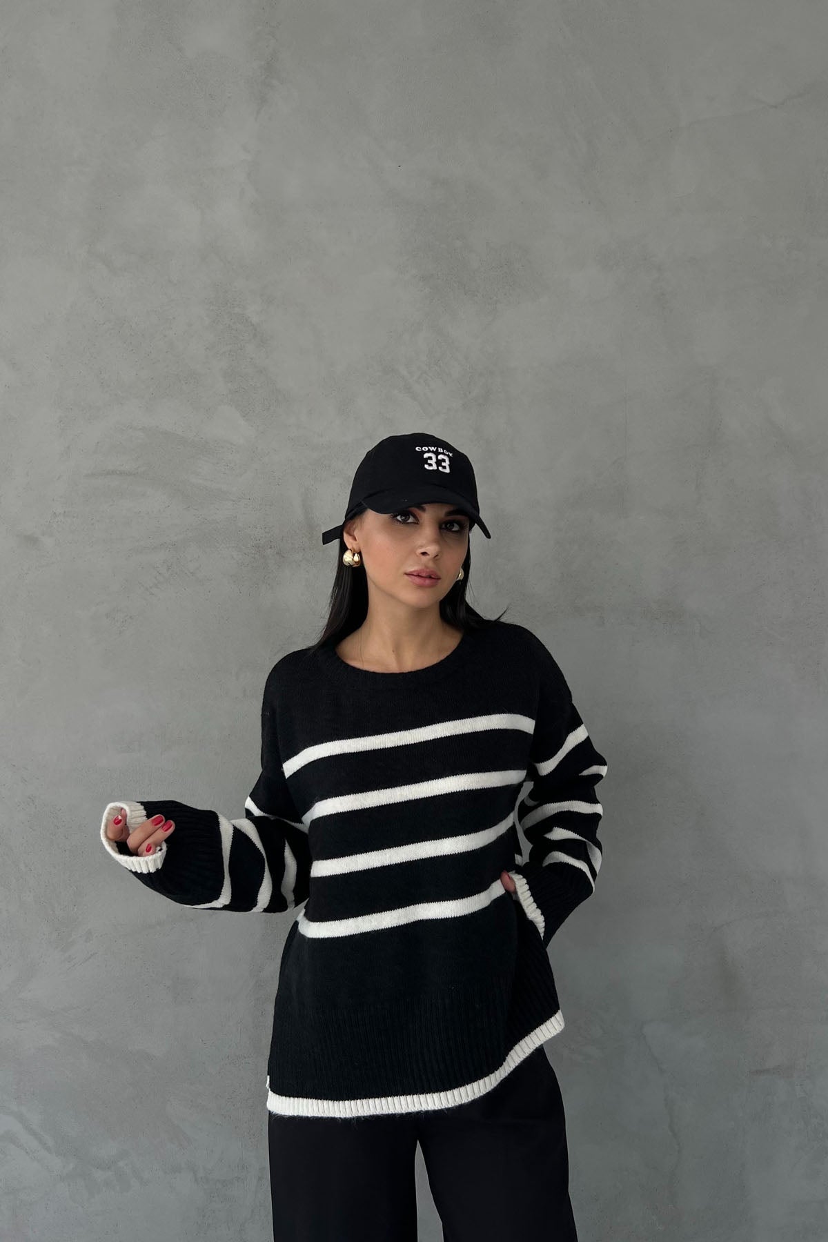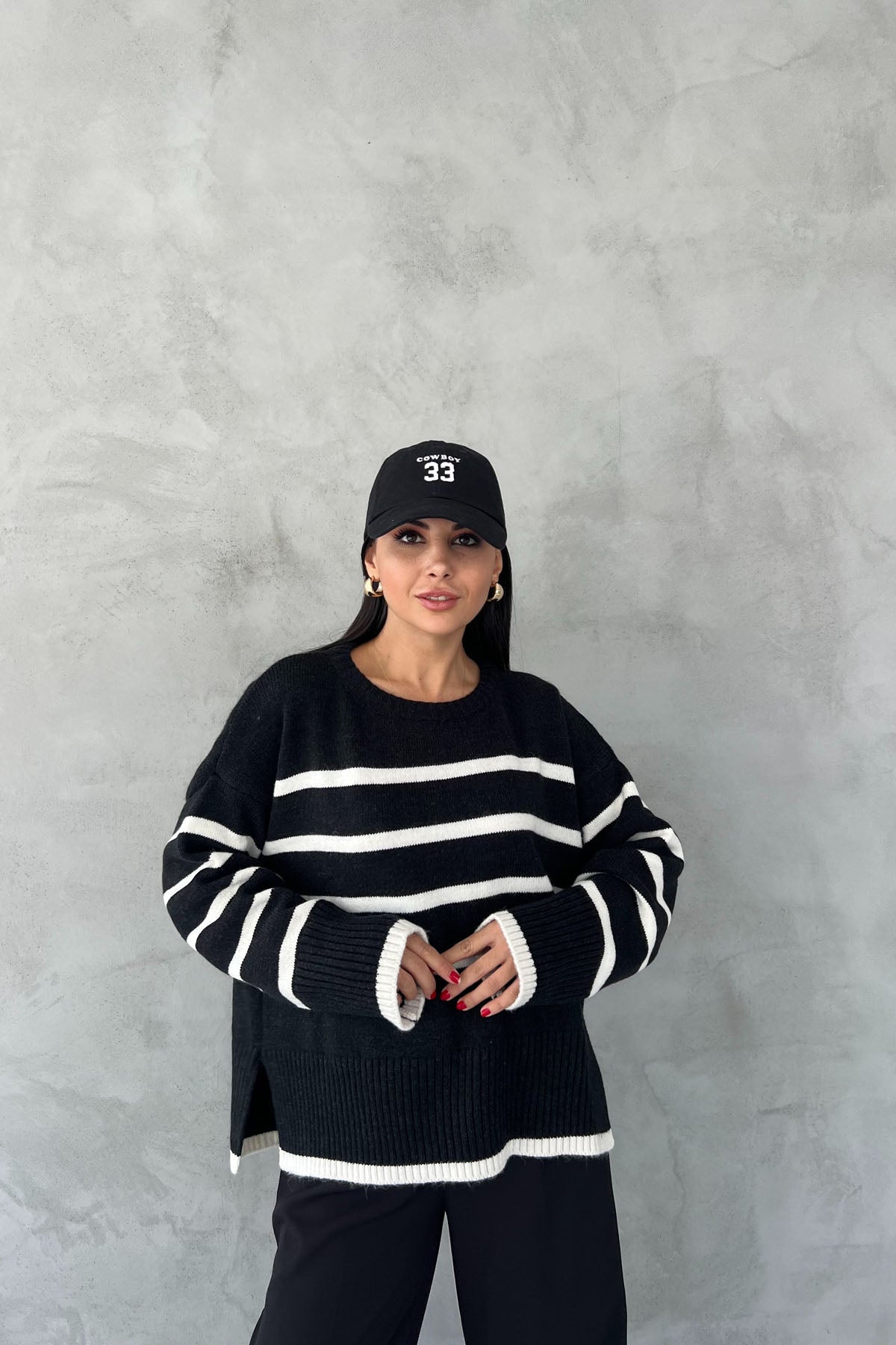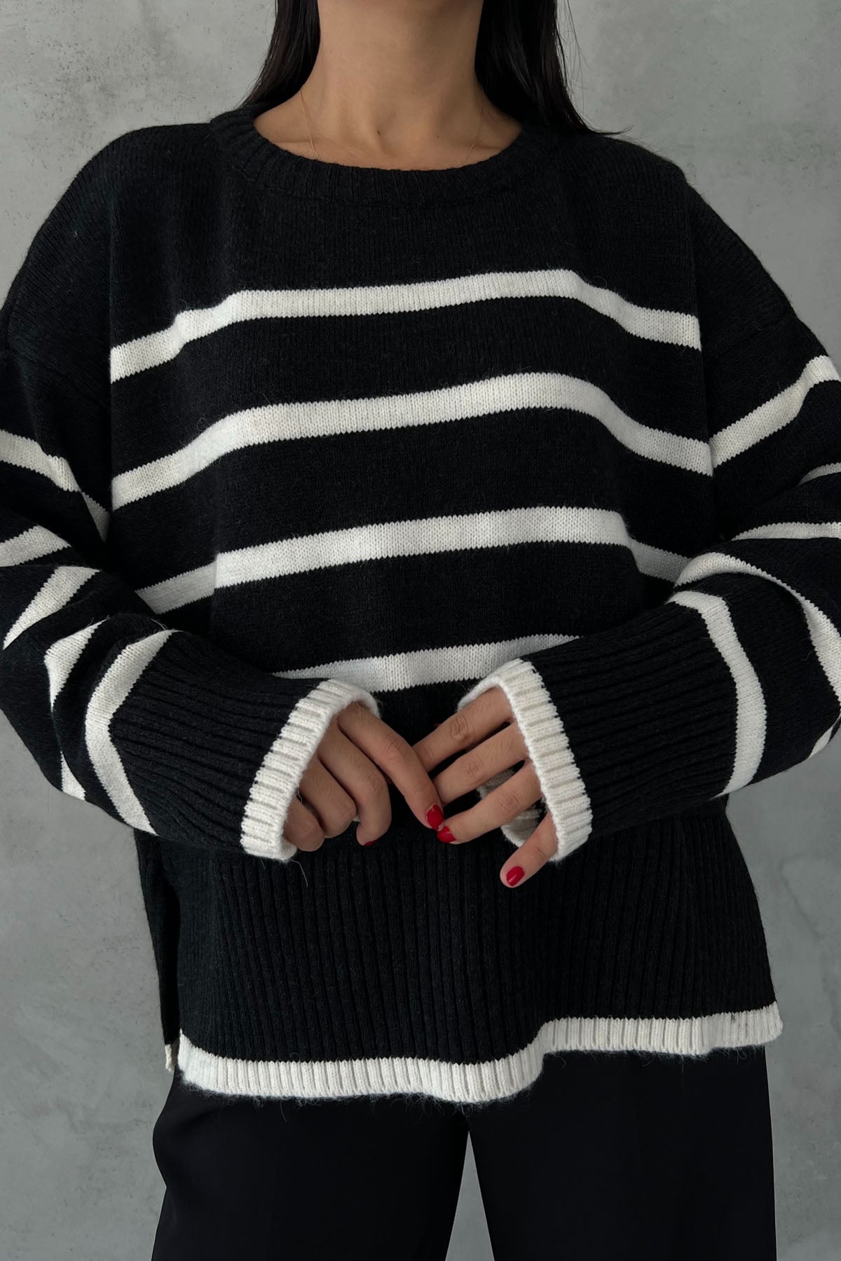 Siyah Beyaz Çizgili Oversize Triko Kazak SY-2401-Siyah