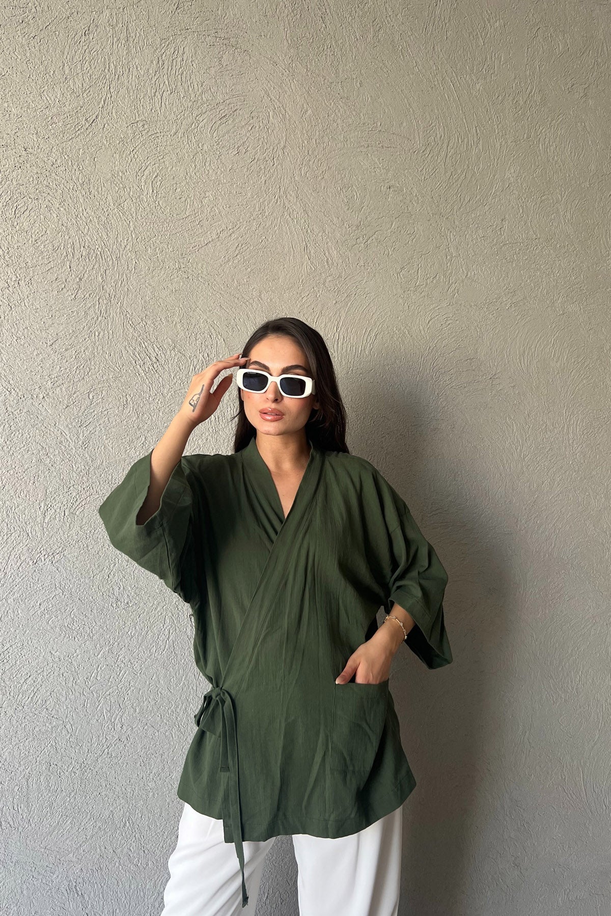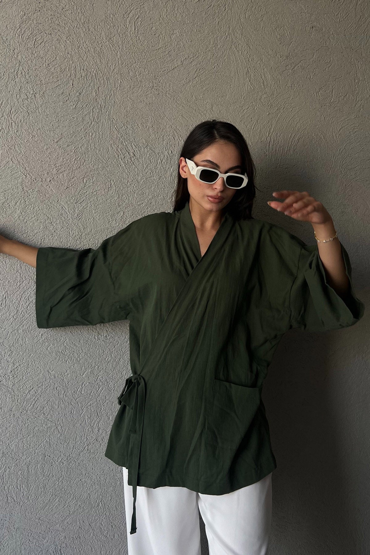Haki Arkası Baskılı Bağlama Detaylı Keten Kimono SY-1613-Haki