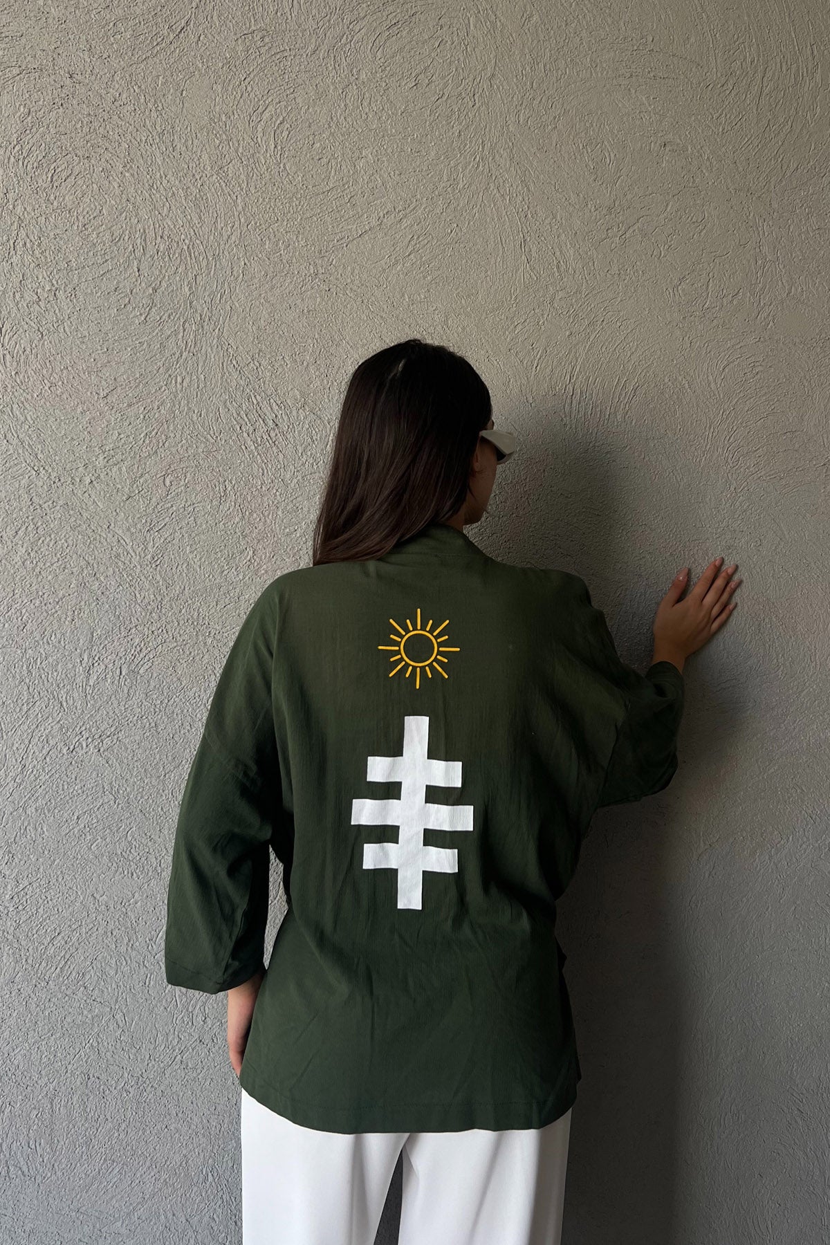 Ürün Detayları ; Haki Arkası Baskılı Bağlama Detaylı Kimono