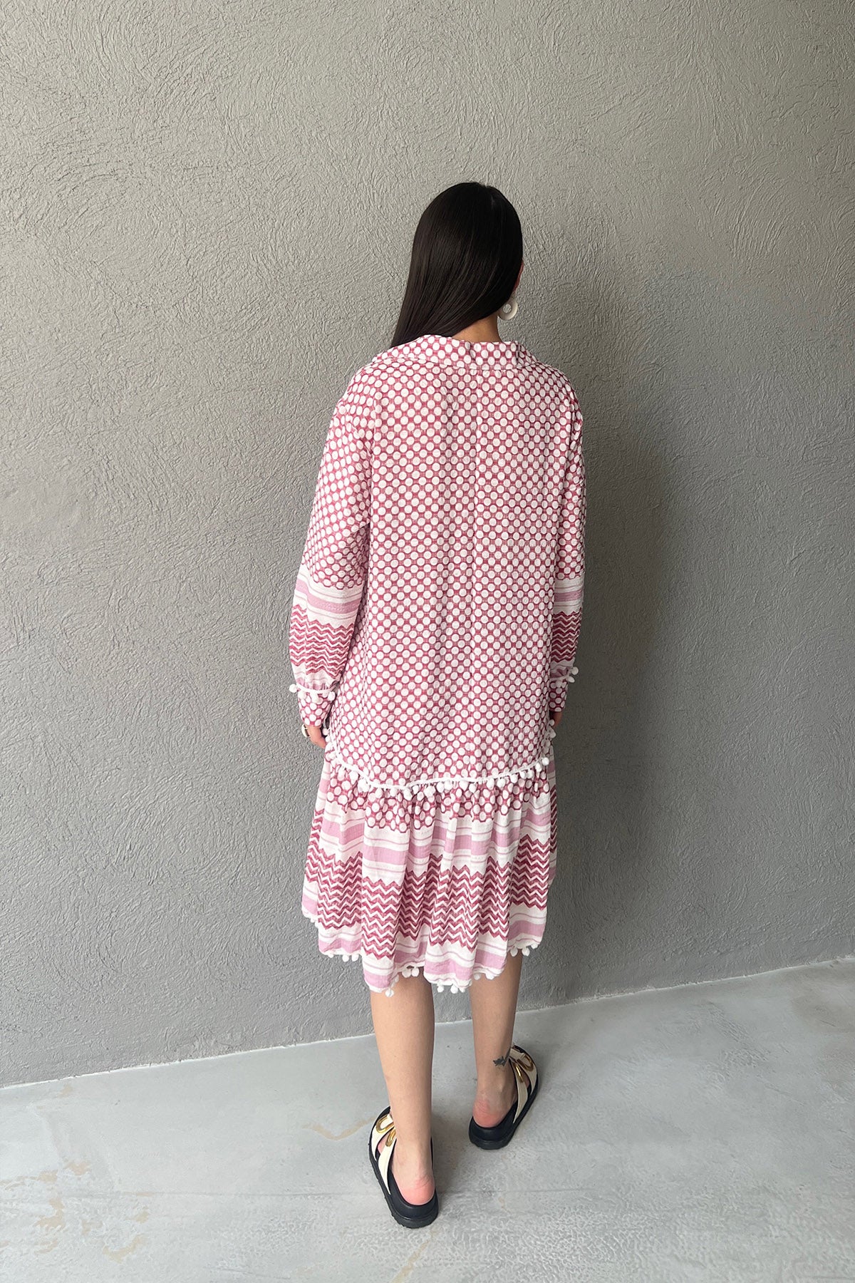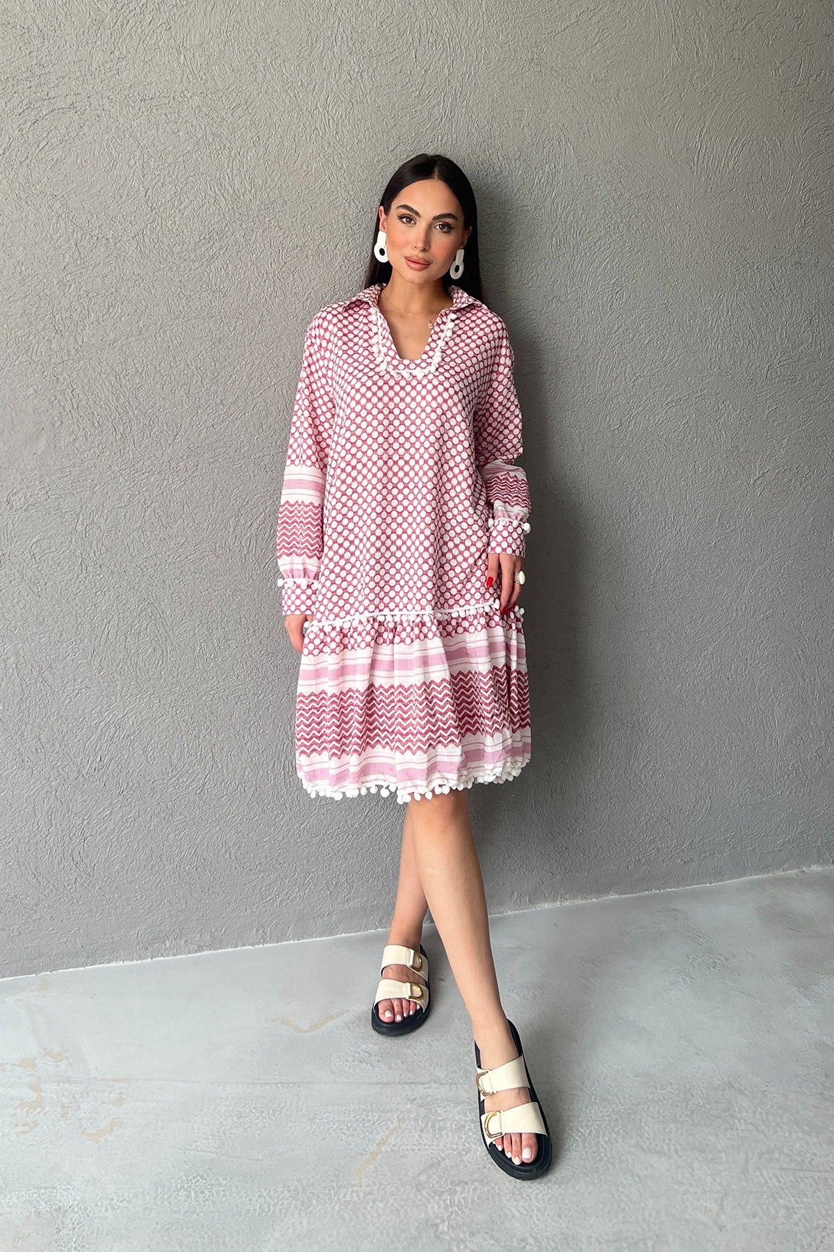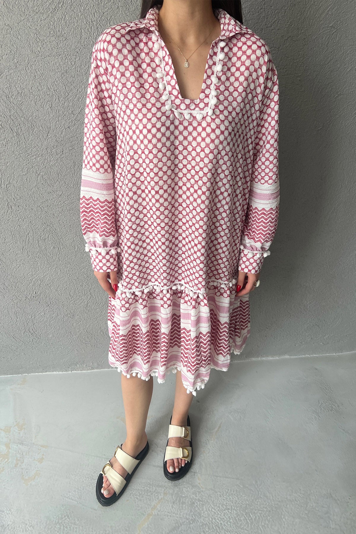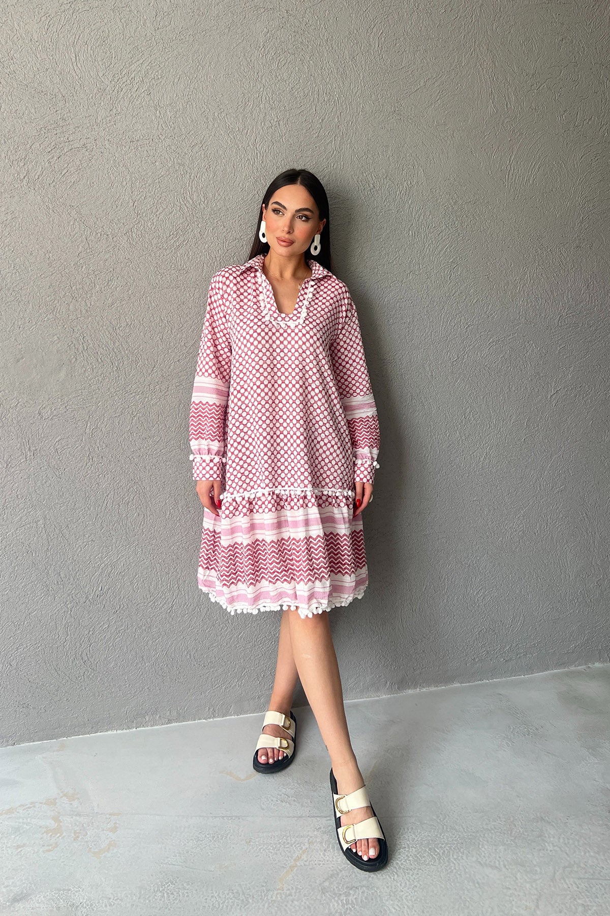 Kırmızı Desenli Gofre Kısa Elbise SY-3036-Kırmızı