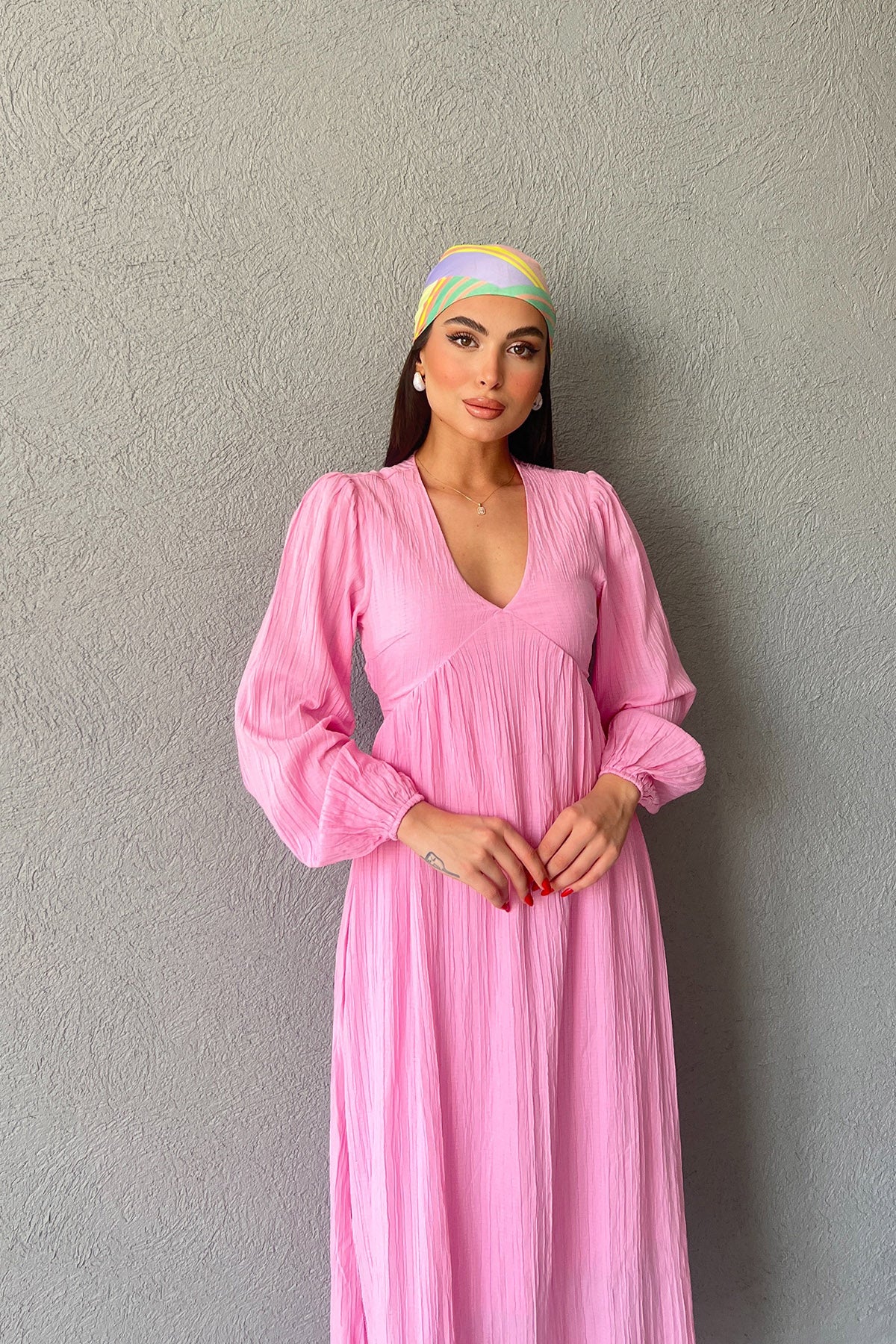 Pembe Gofre V Yaka Uzun Elbise SY-3031-Pembe