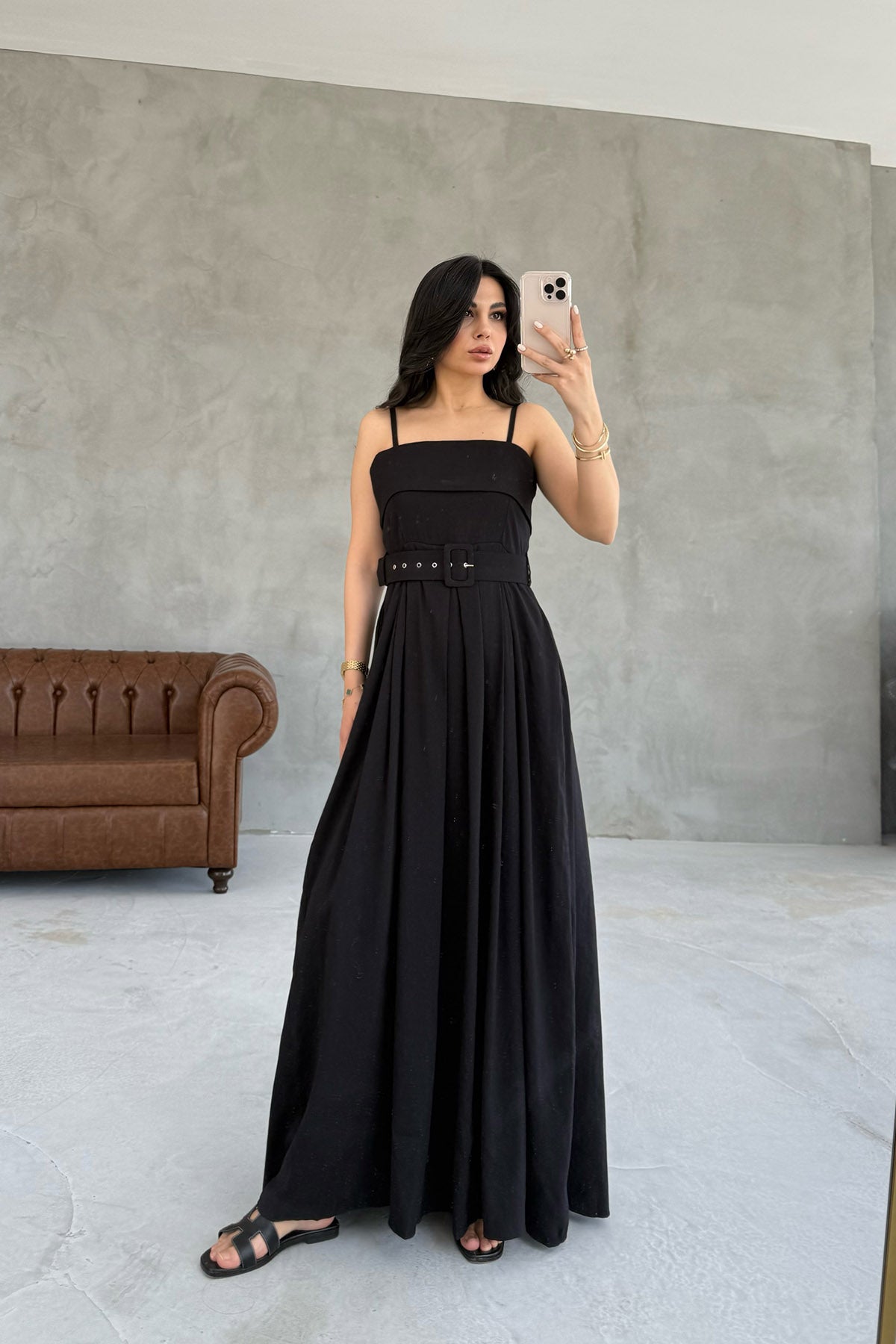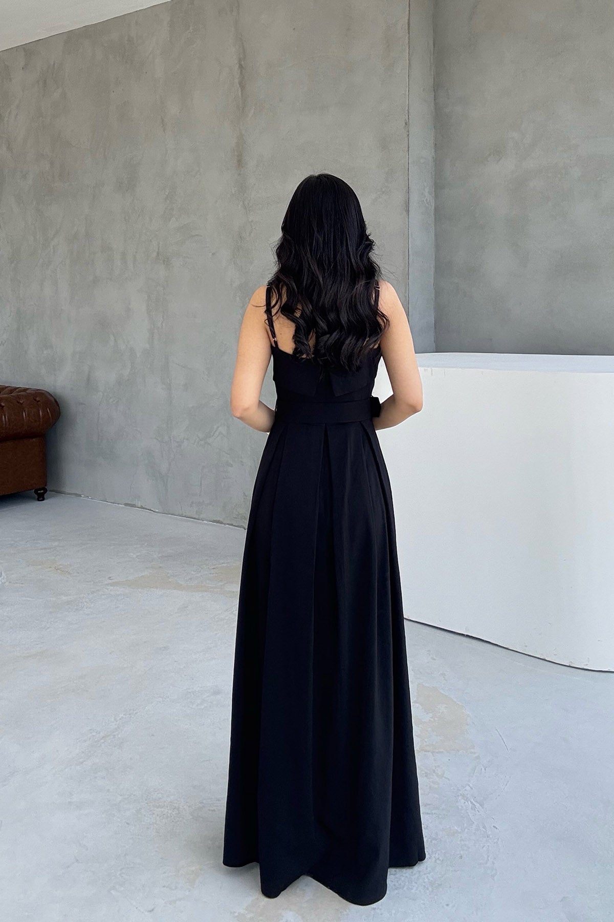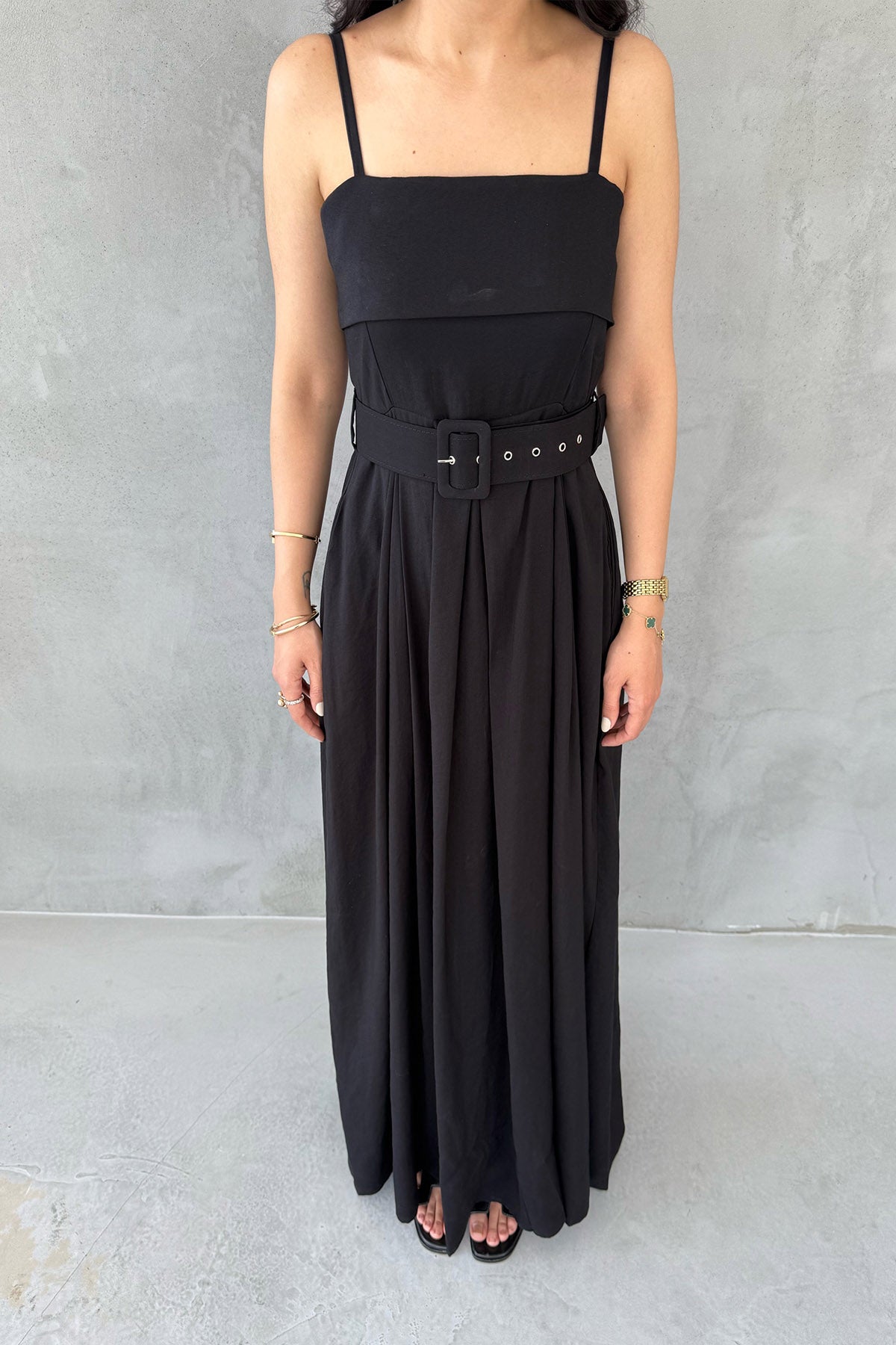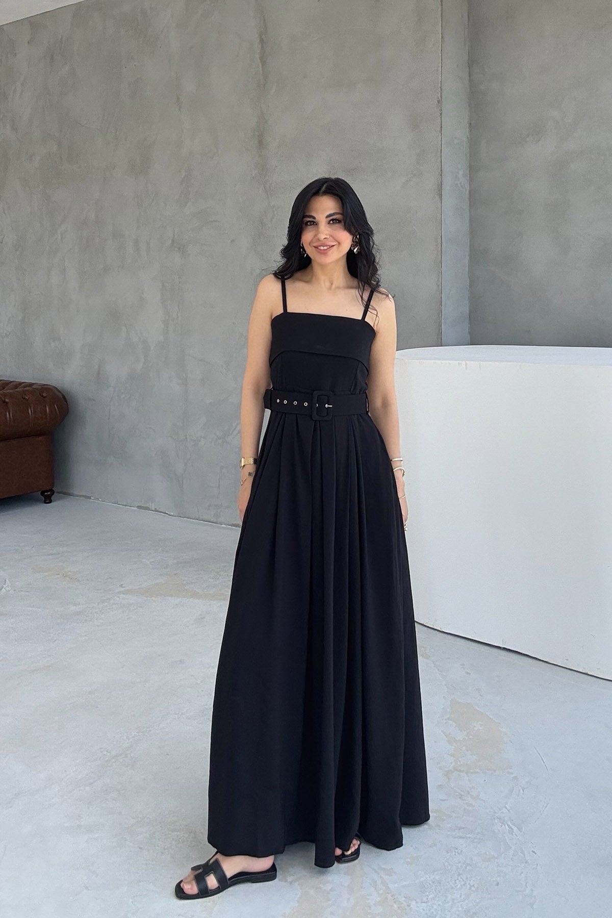 Siyah Geniş Pileli Kemerli Elbise SY-3070-Siyah