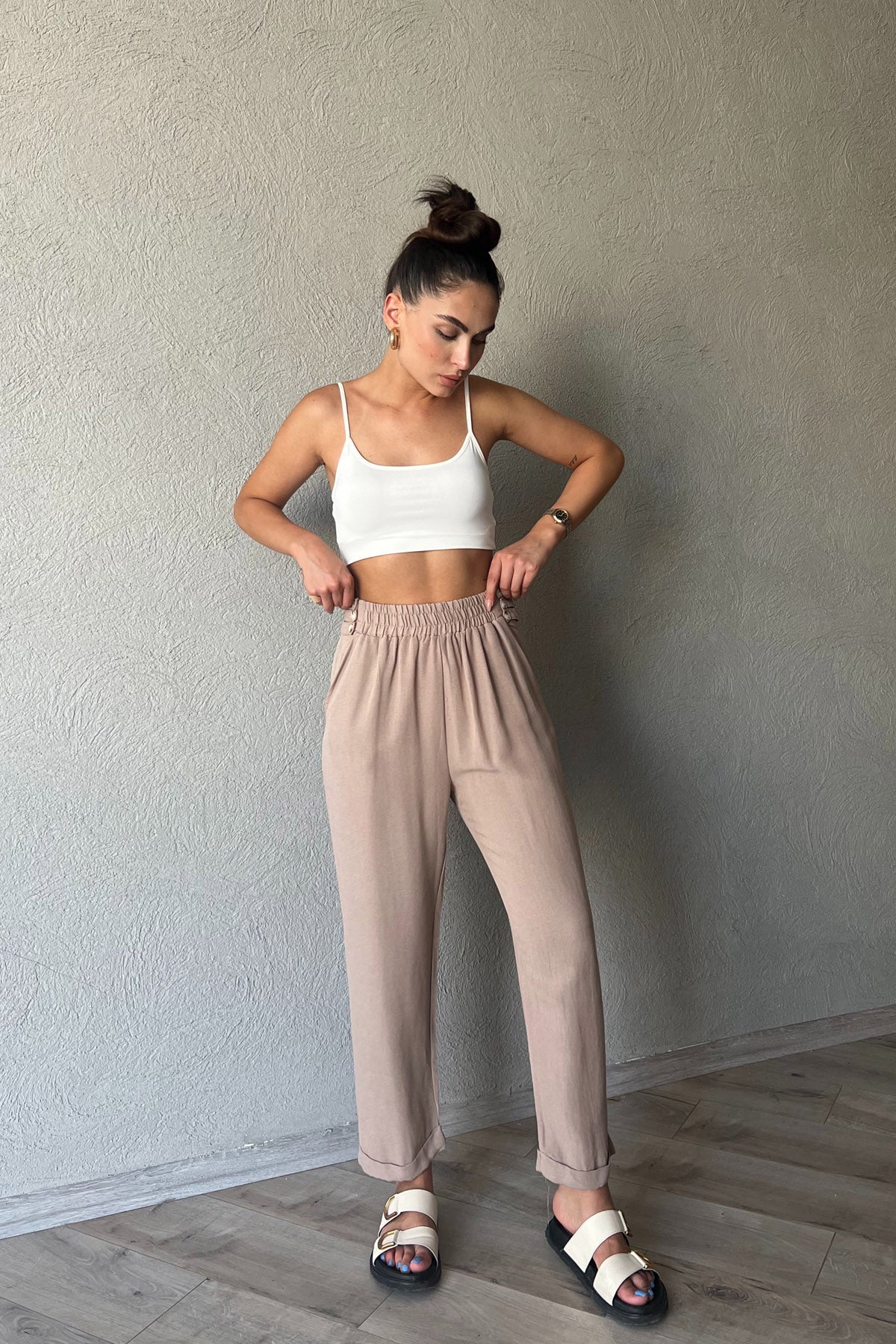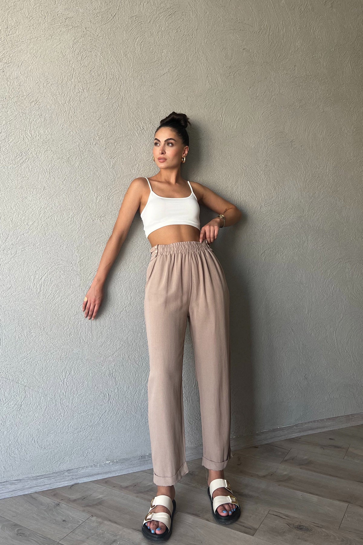 Ürün Özellikleri:Naturel Bel Detaylı Keten Pantolon