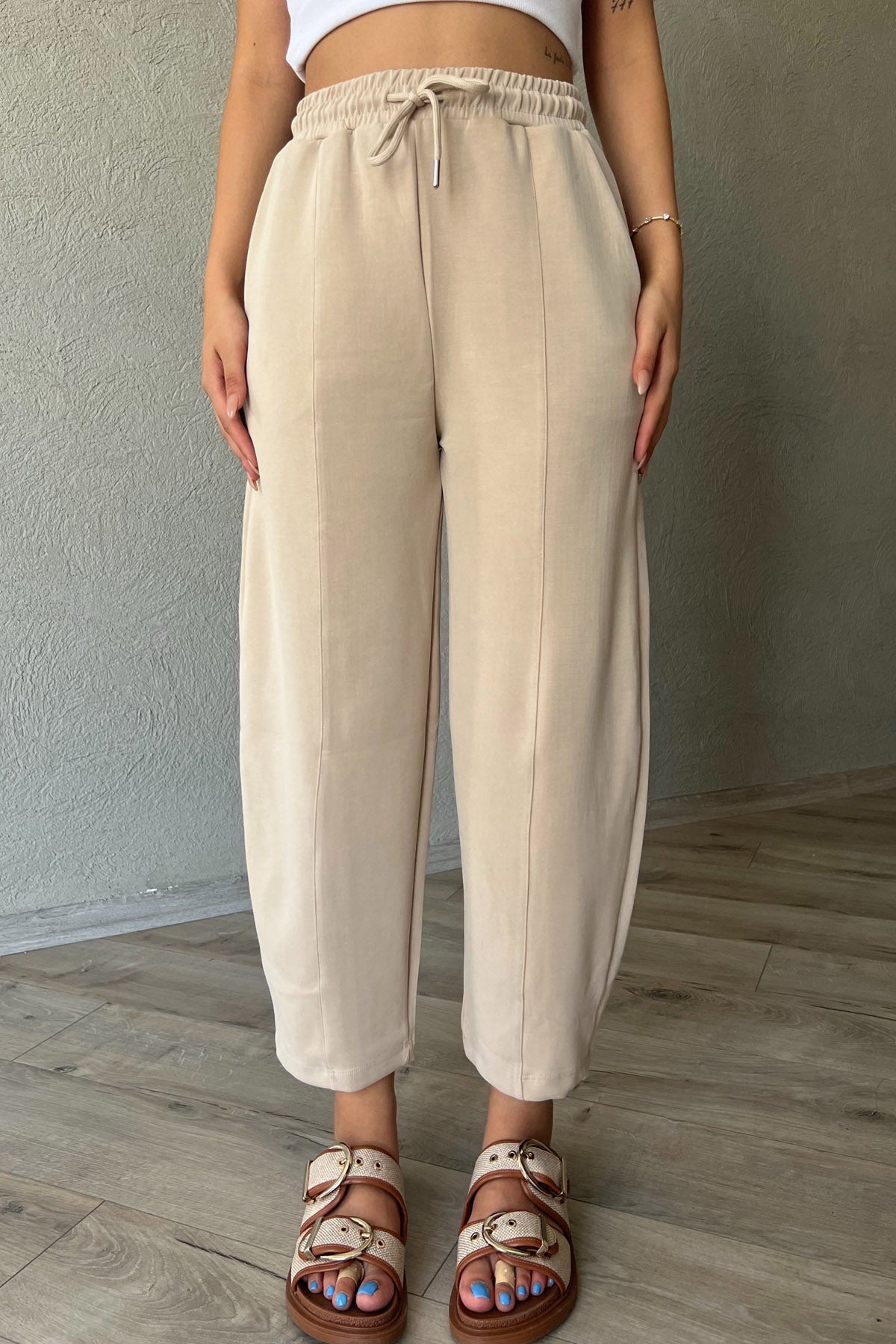 Bej Beli Lastikli Şalvar Pantolon SY-1487-Bej