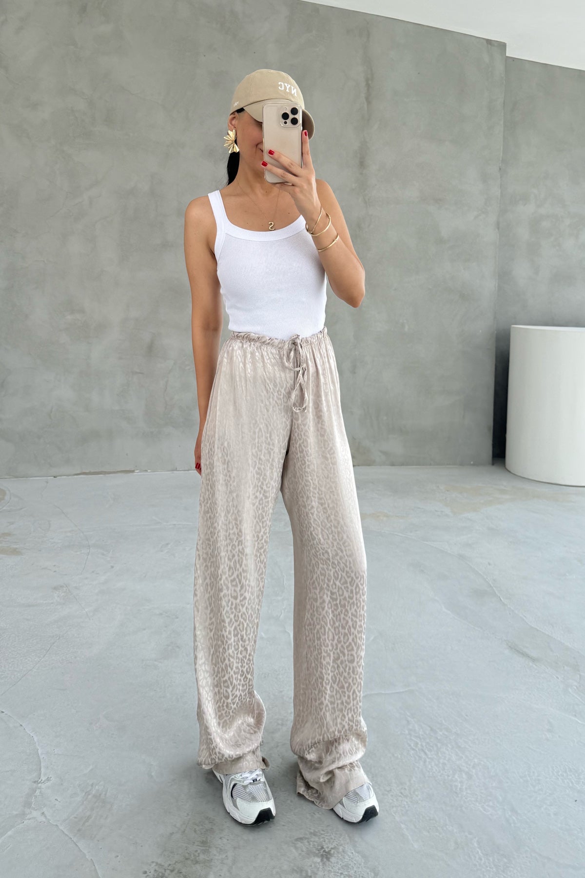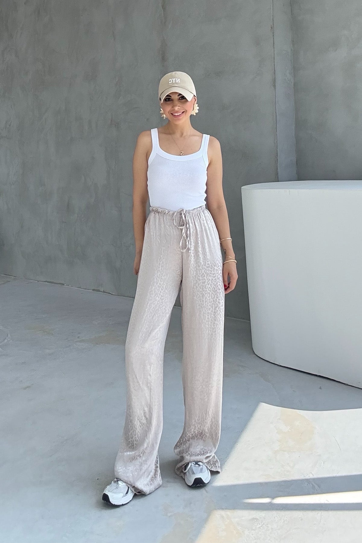 Ürün Detayları ;Bej Leopar Desenli Jakarlı Bol Paça Pantolon