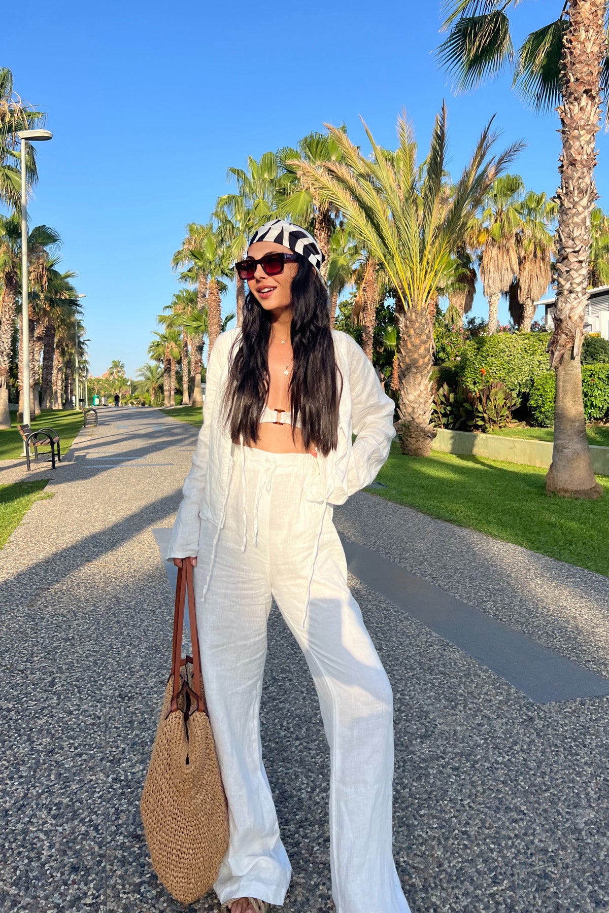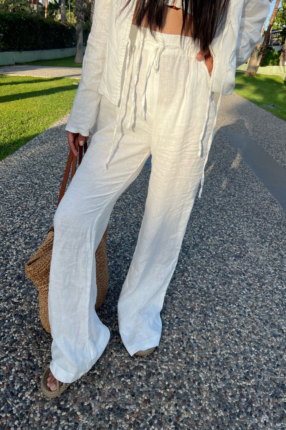 Beyaz Beli Bağcık Detaylı Keten Pantolon SY-2155-Beyaz