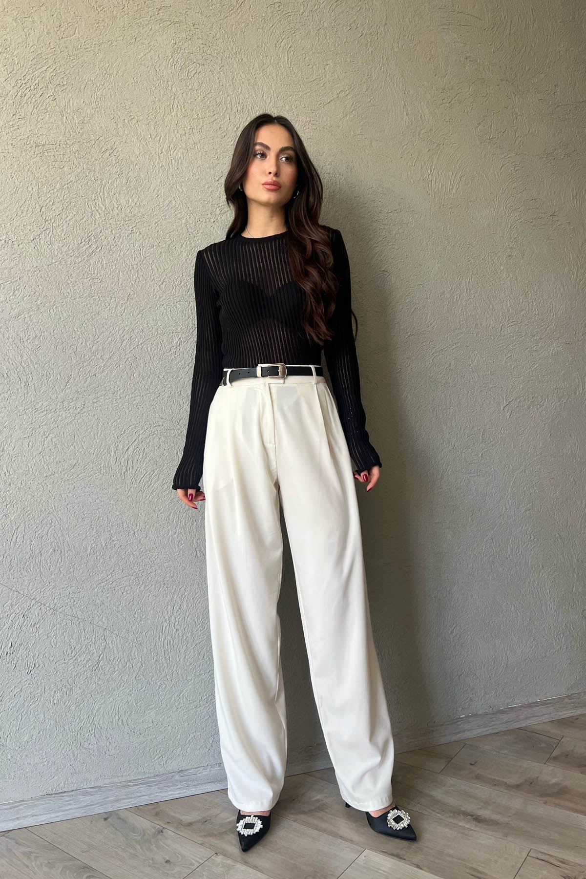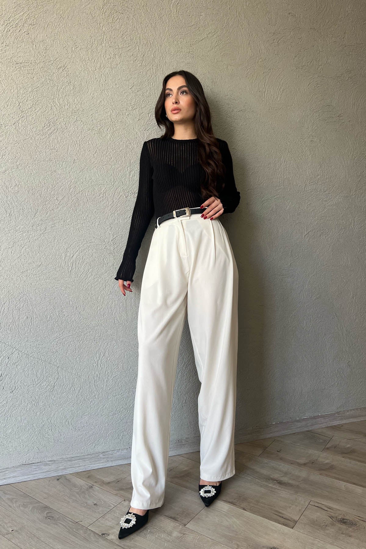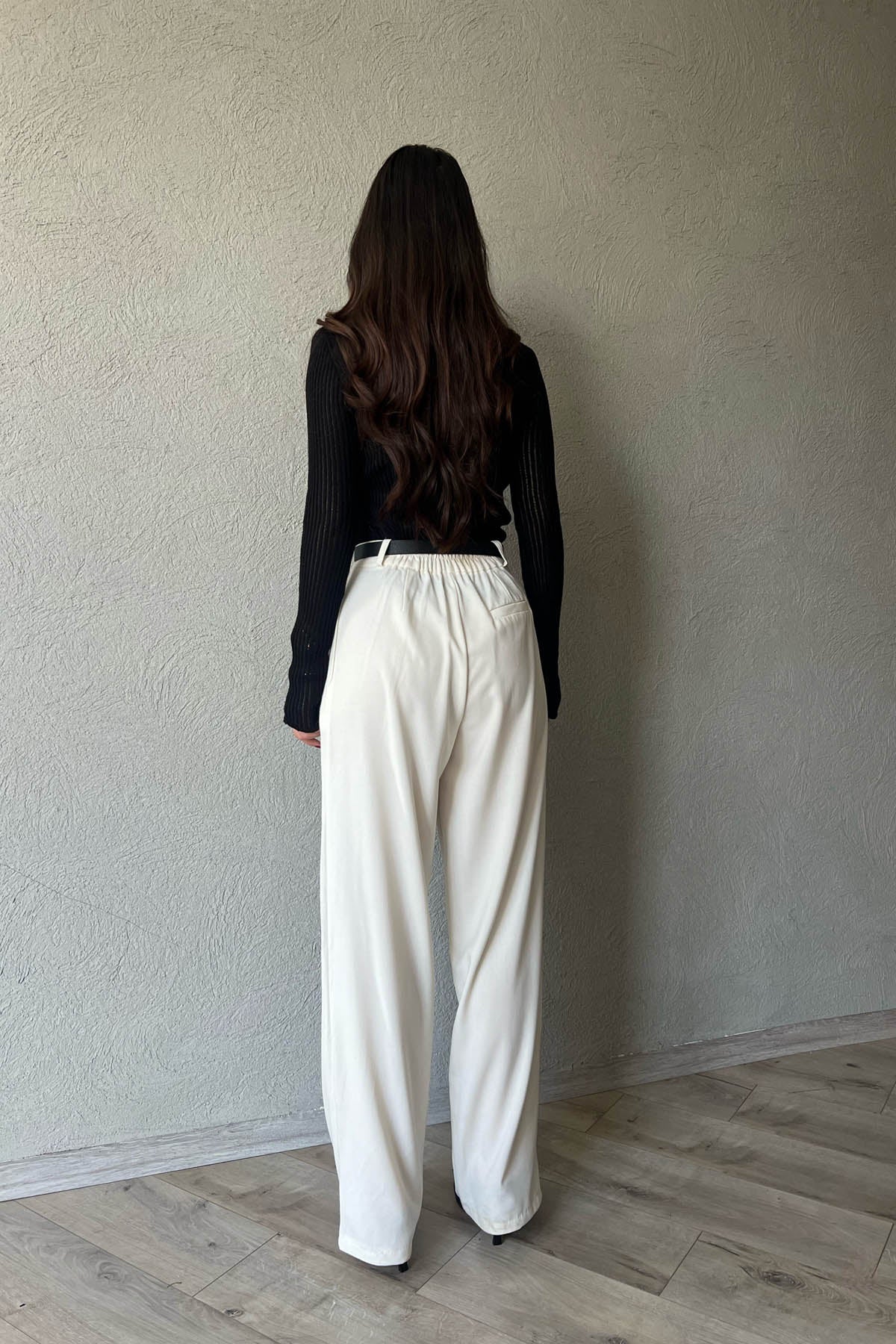 Ürün Detayları ;Ekru Shaggy Beli Lastikli Palazzo Pantolon