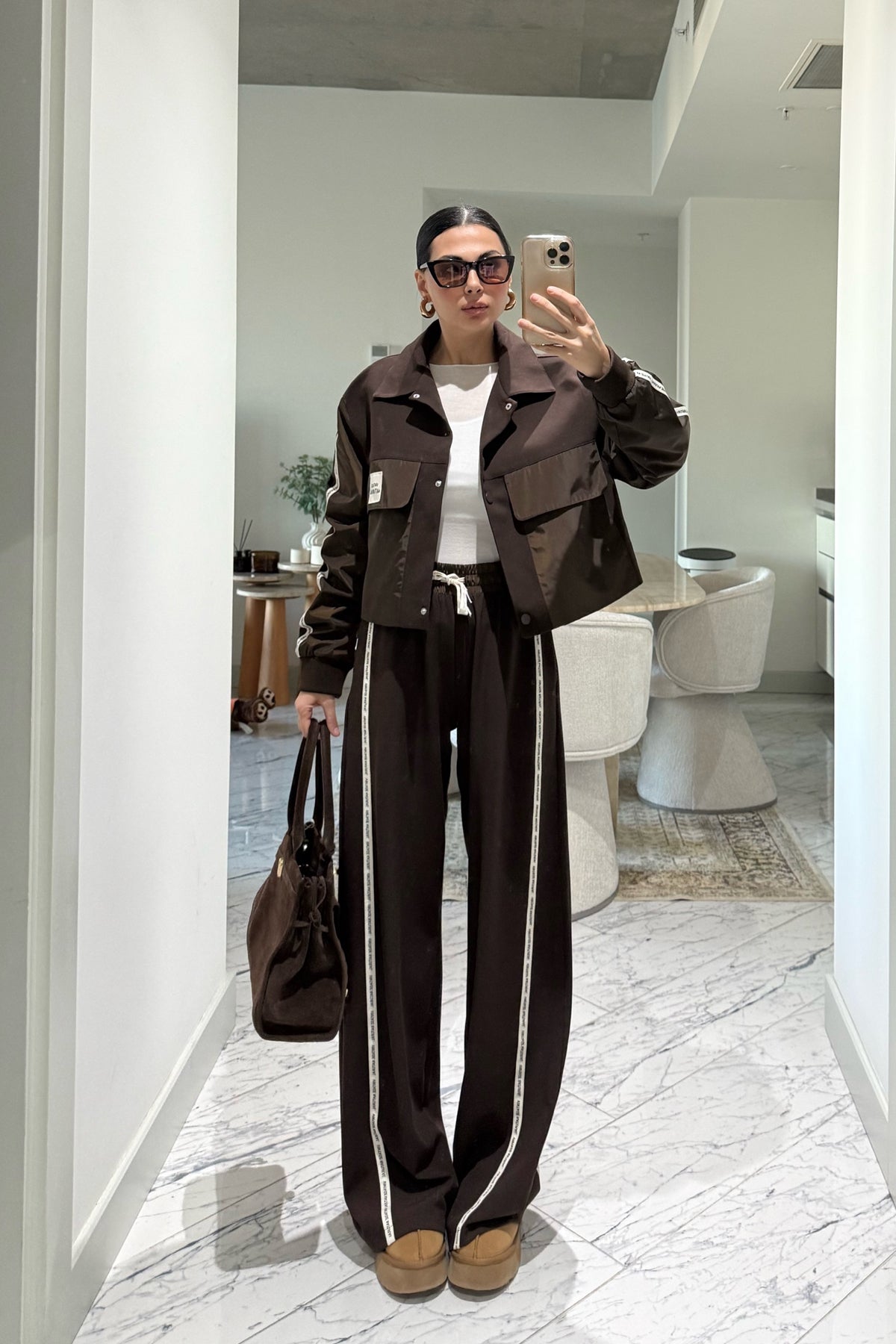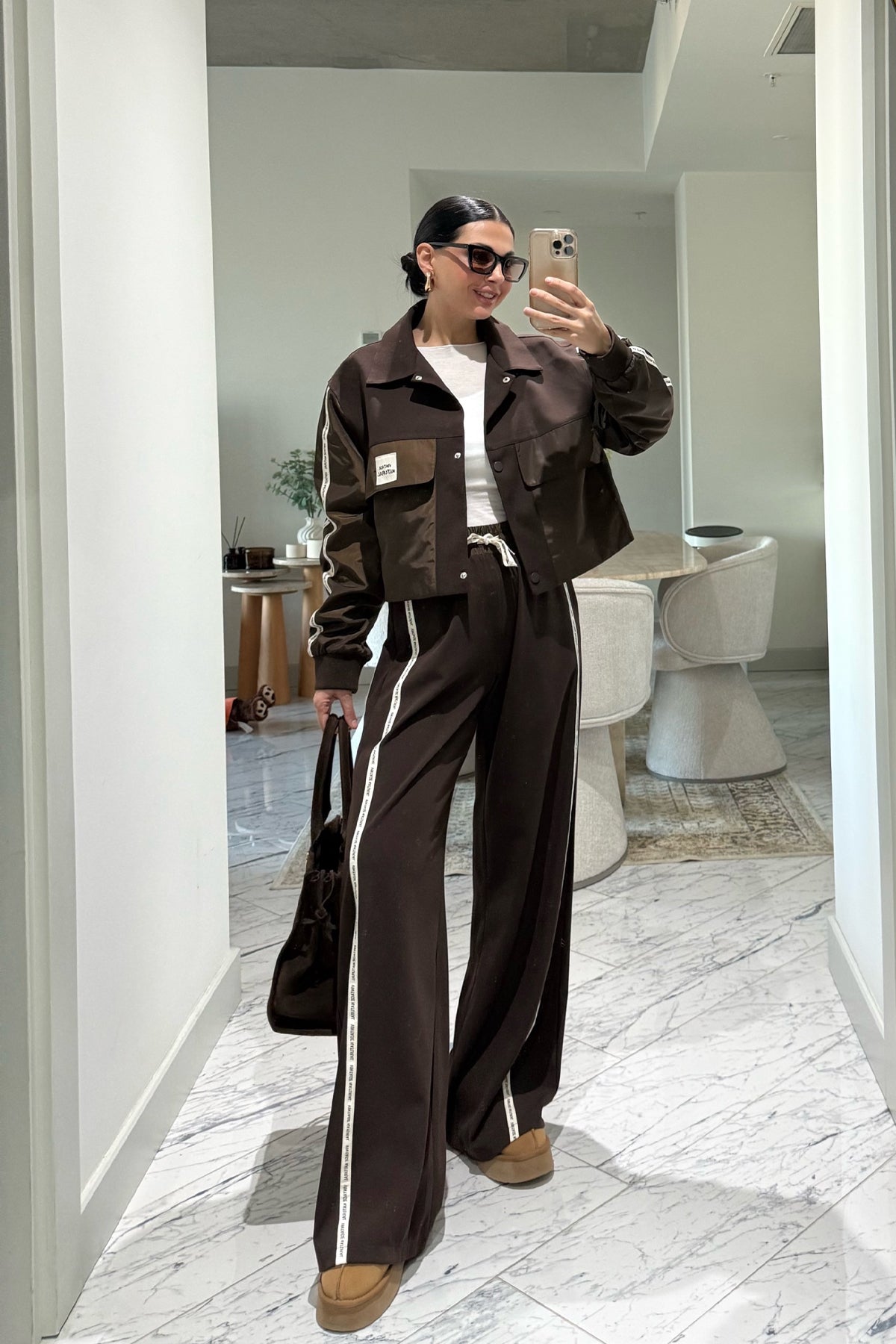 Kahverengi Şerit Yazı Detaylı Yüksek Bel PANTOLON SY-3392-Kahverengi