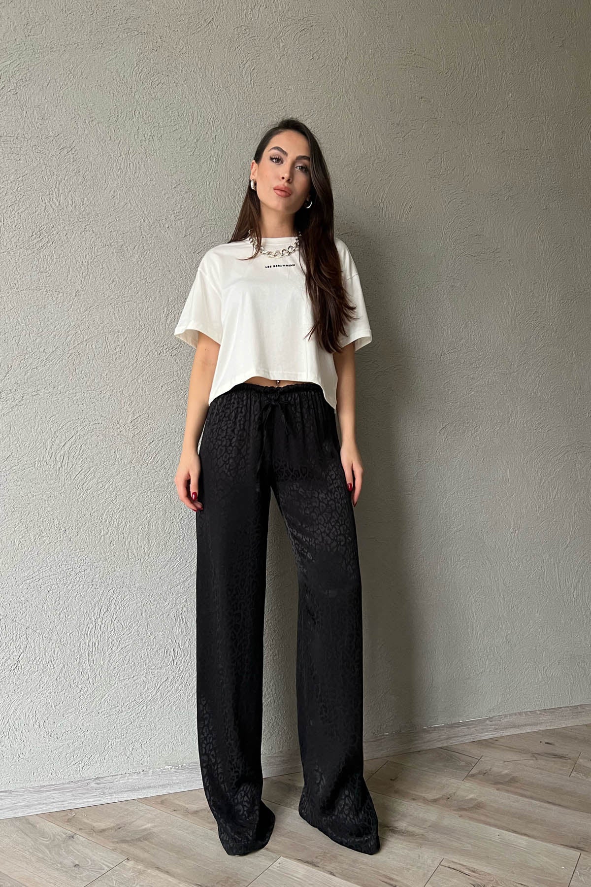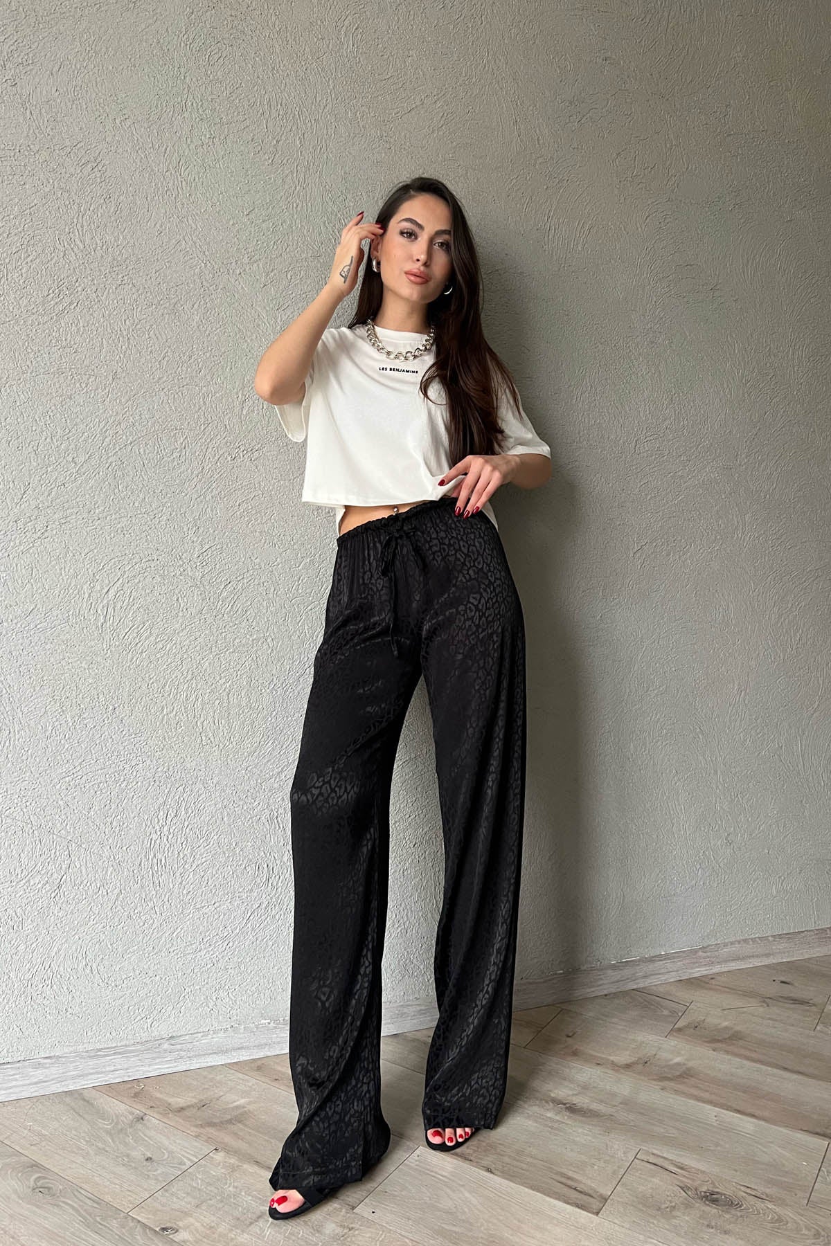Ürün Detayları ;Siyah Leopar Desenli Jakarlı Bol Paça Pantolon