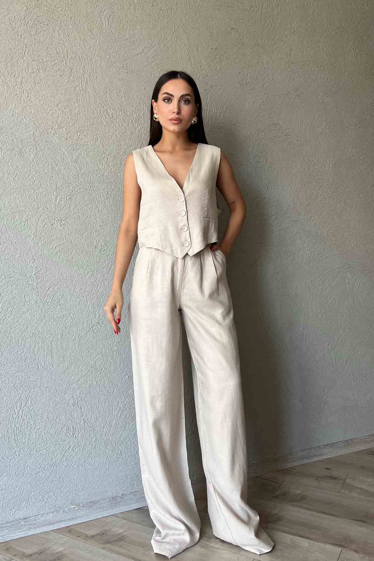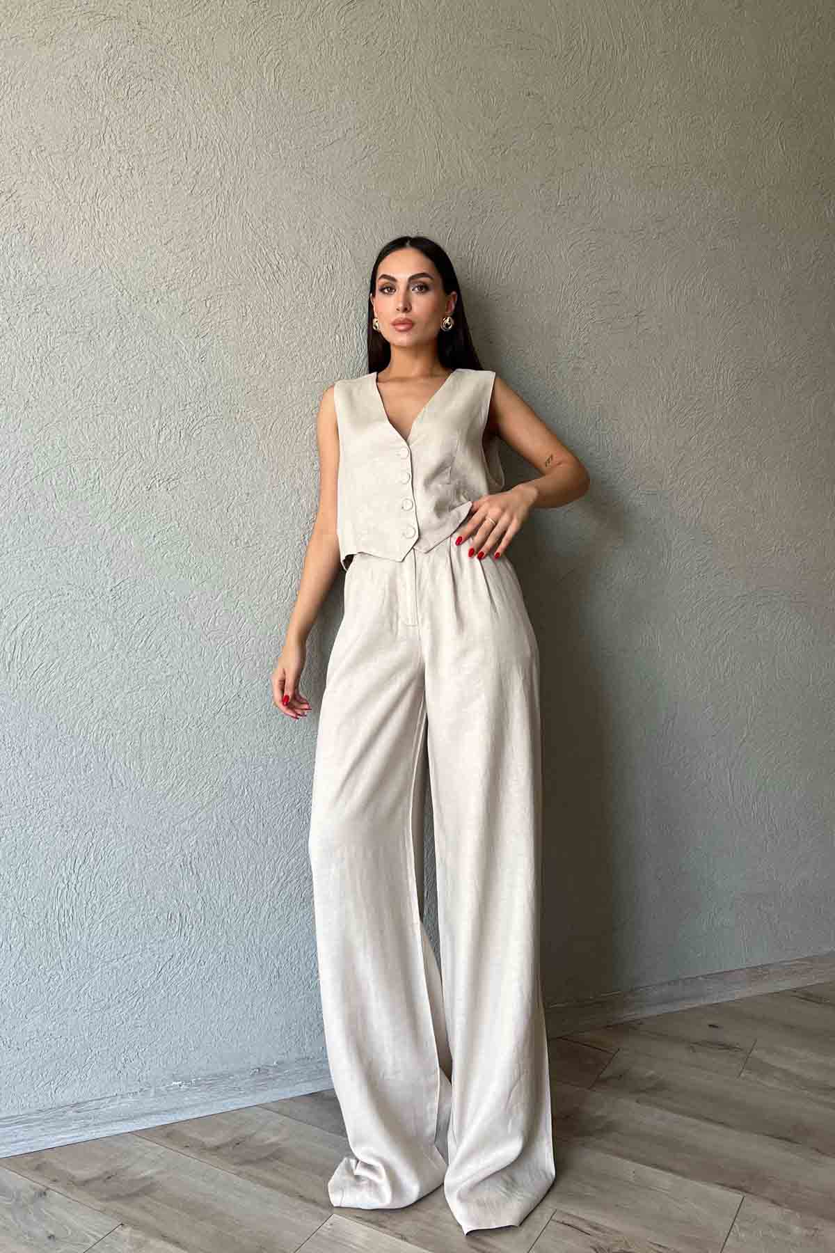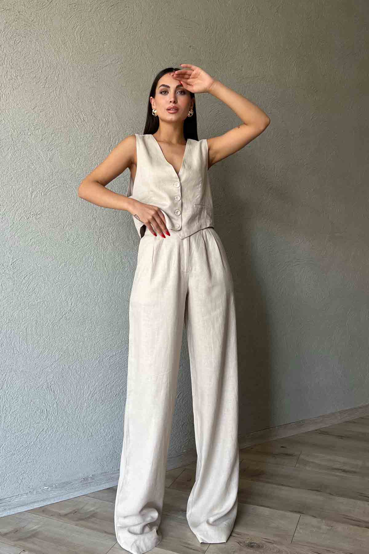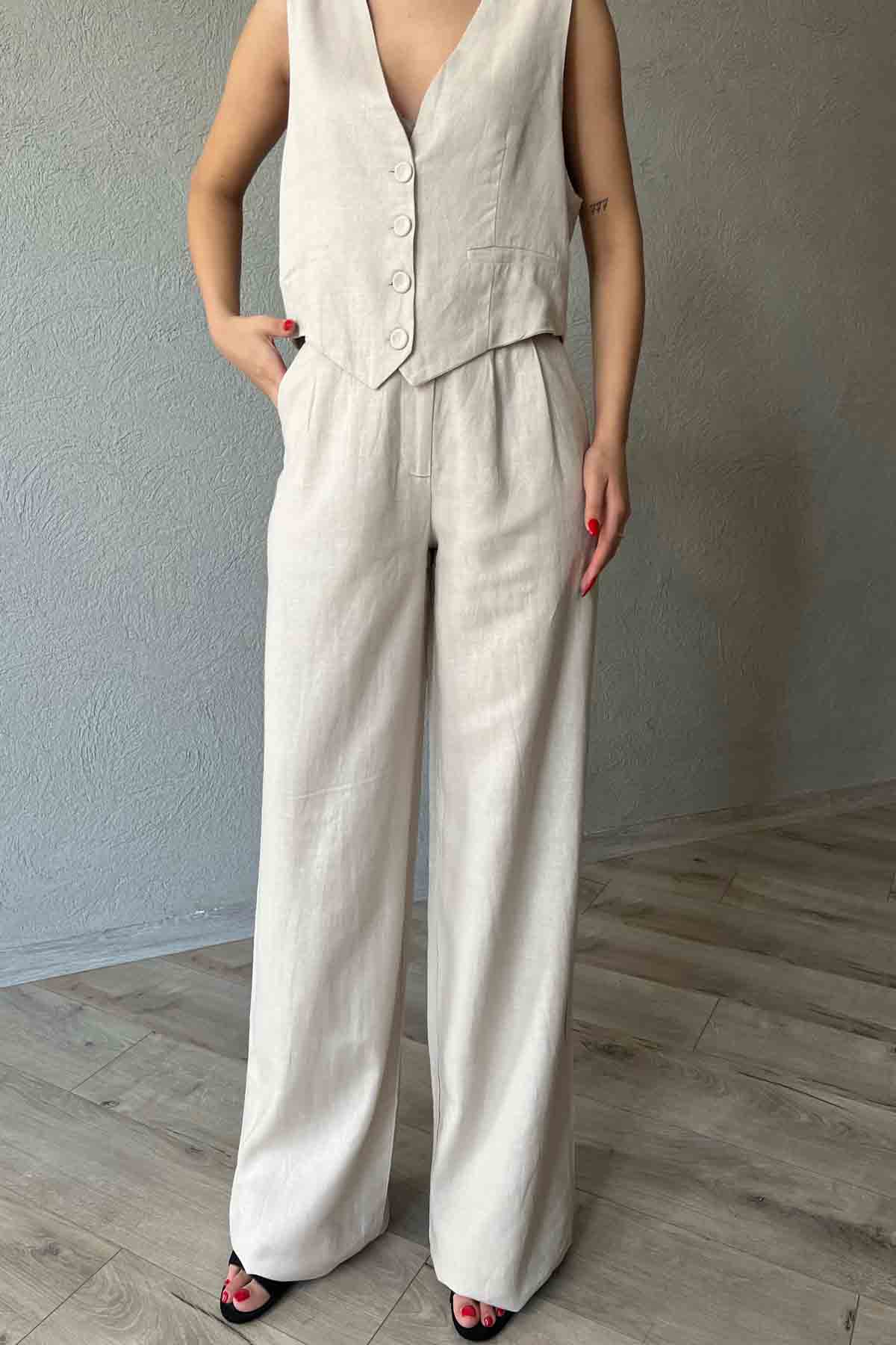 Taş Pile Detaylı Rahat Kesim Keten Pantolon SY-2097-Taş