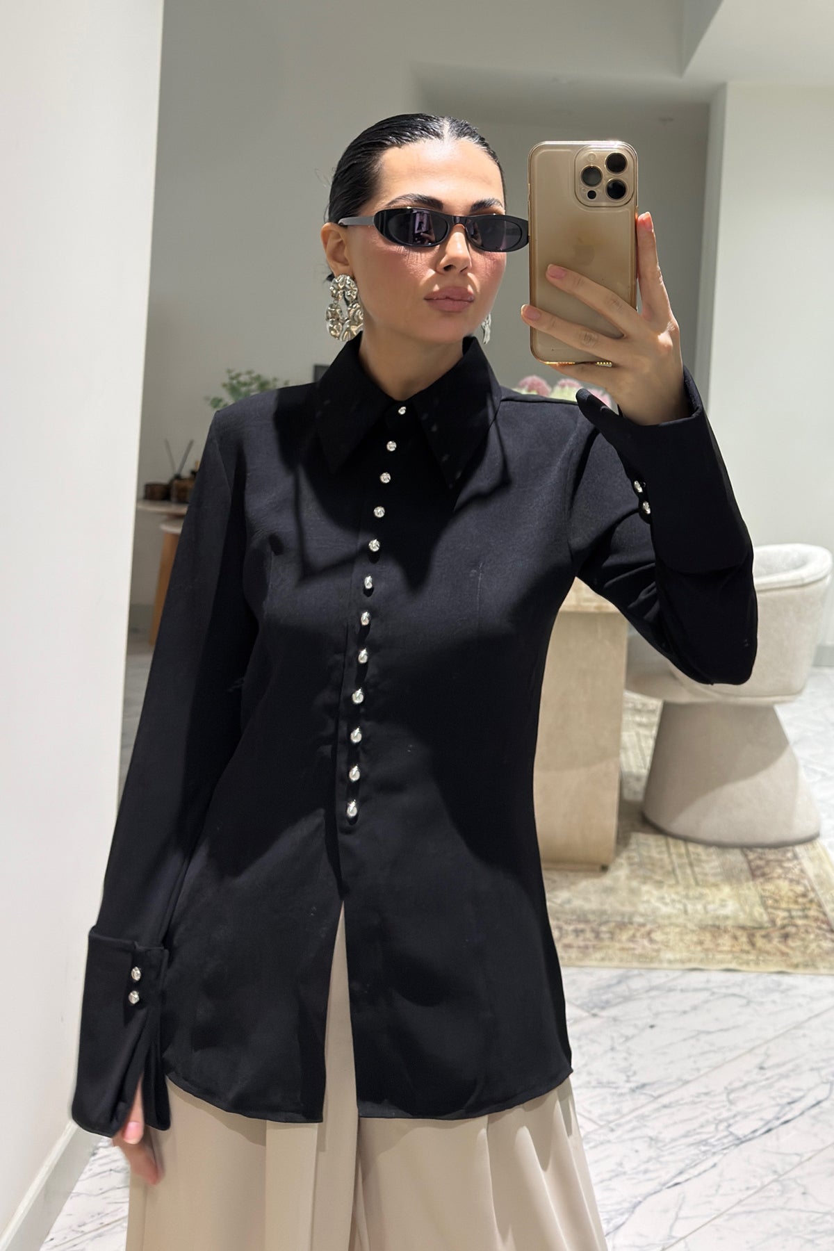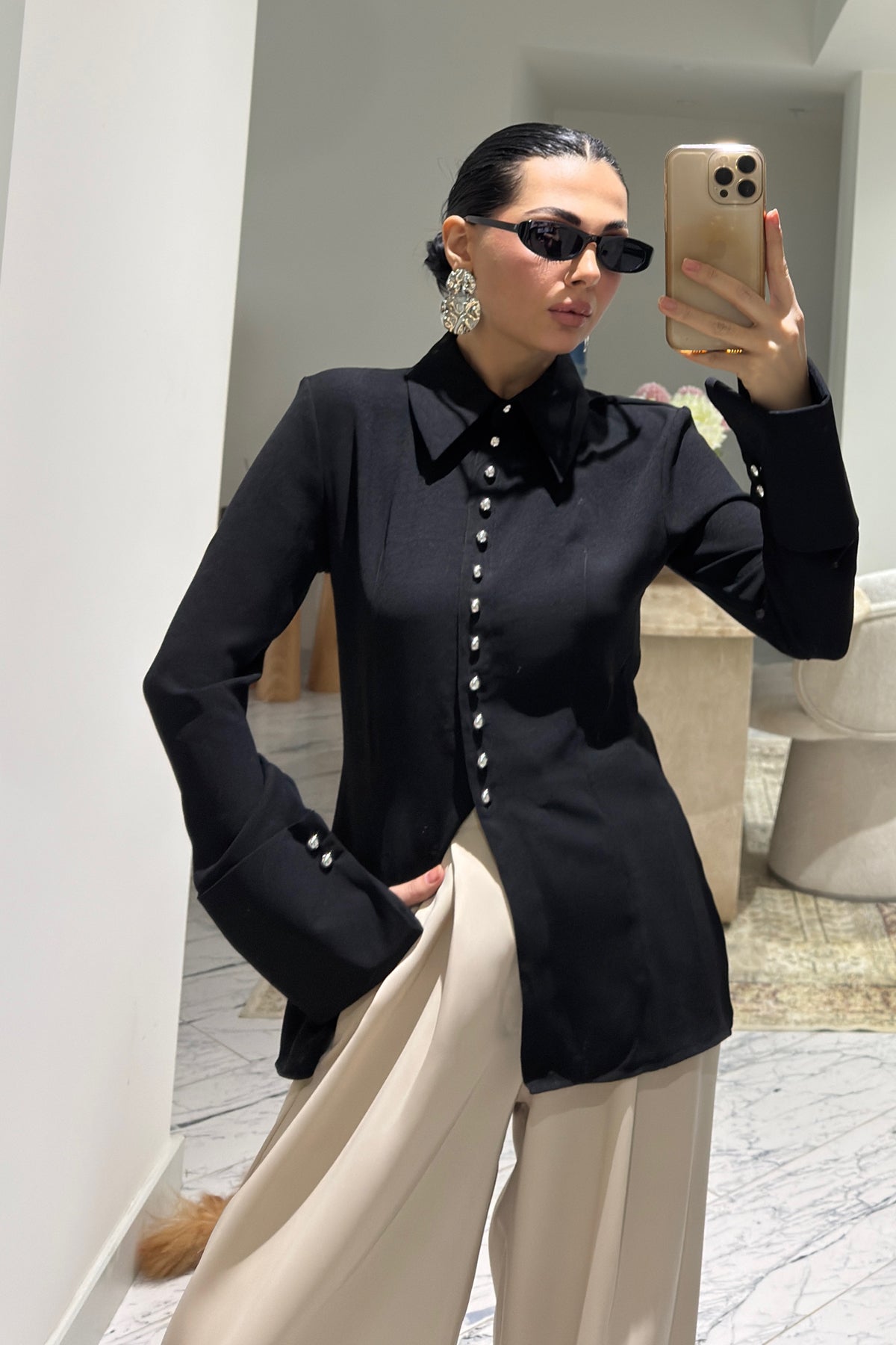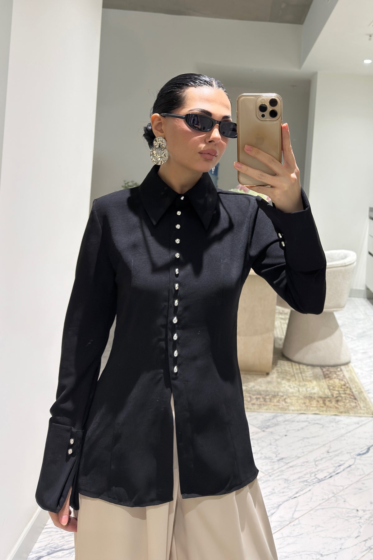 Beli Oturmalı Klasik Yaka Siyah Gömlek SY-3589-Siyah