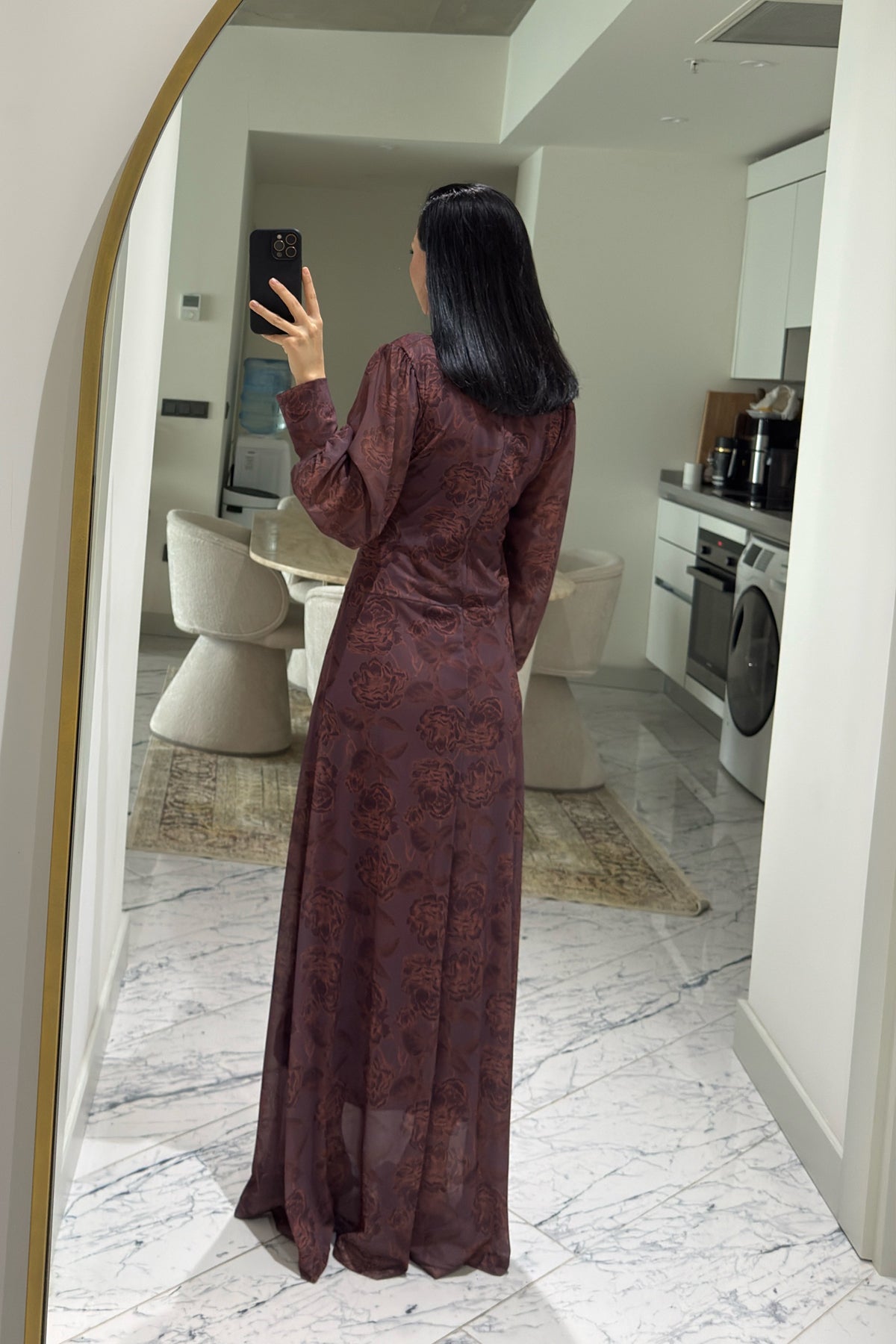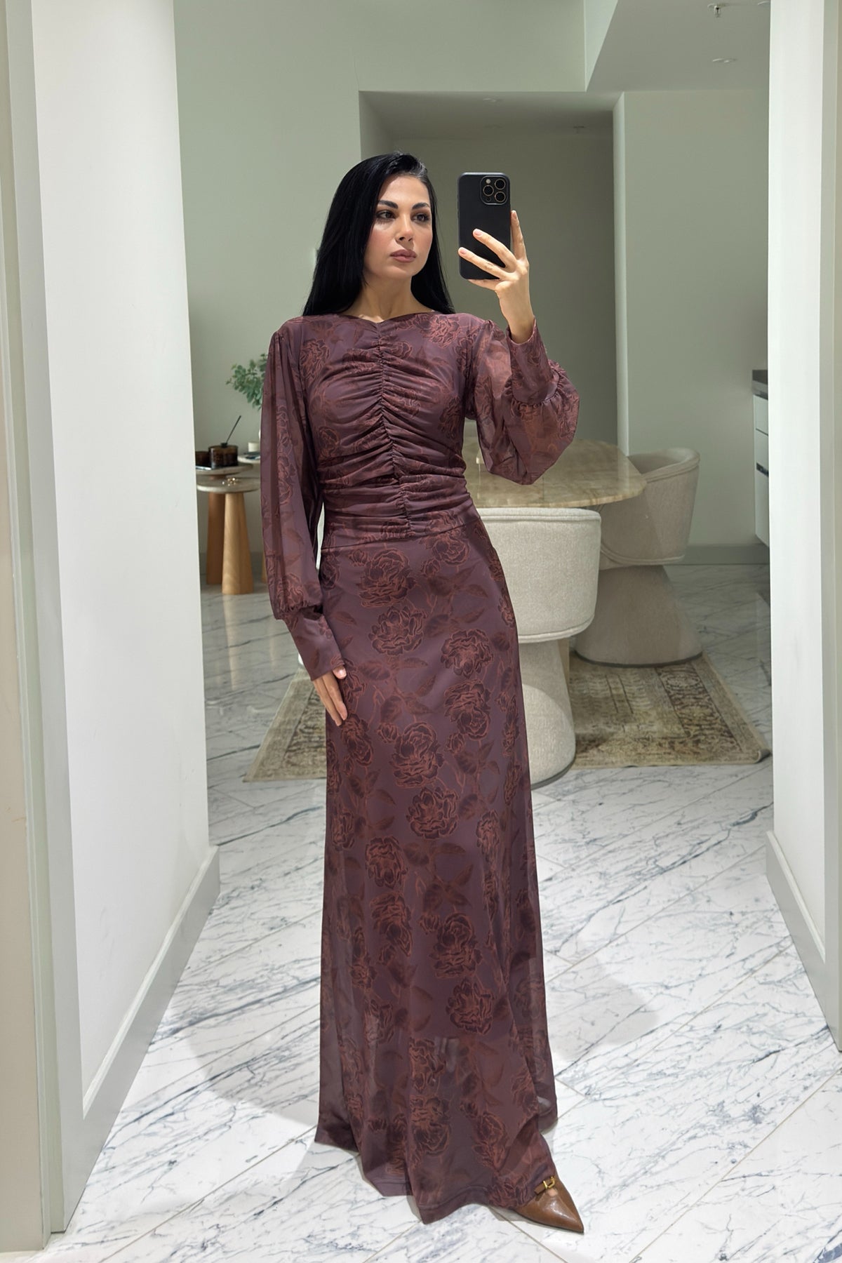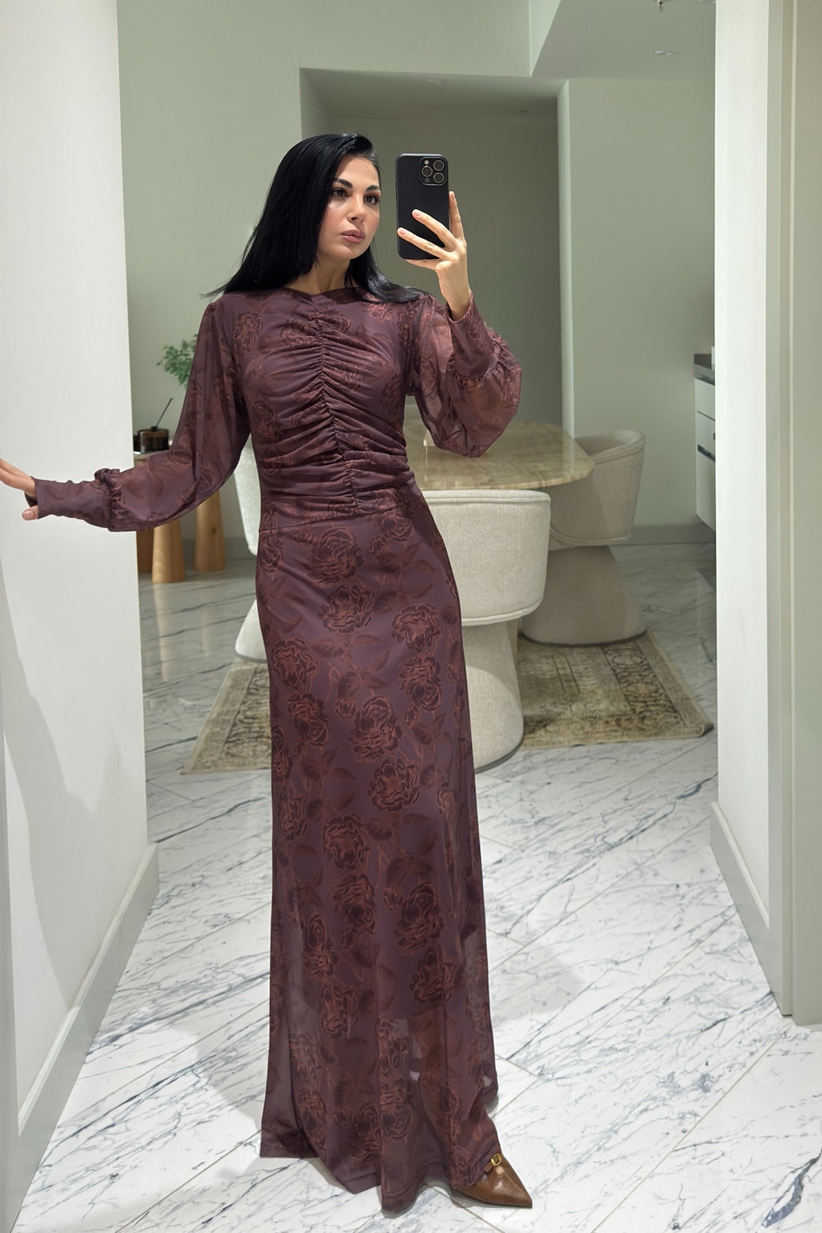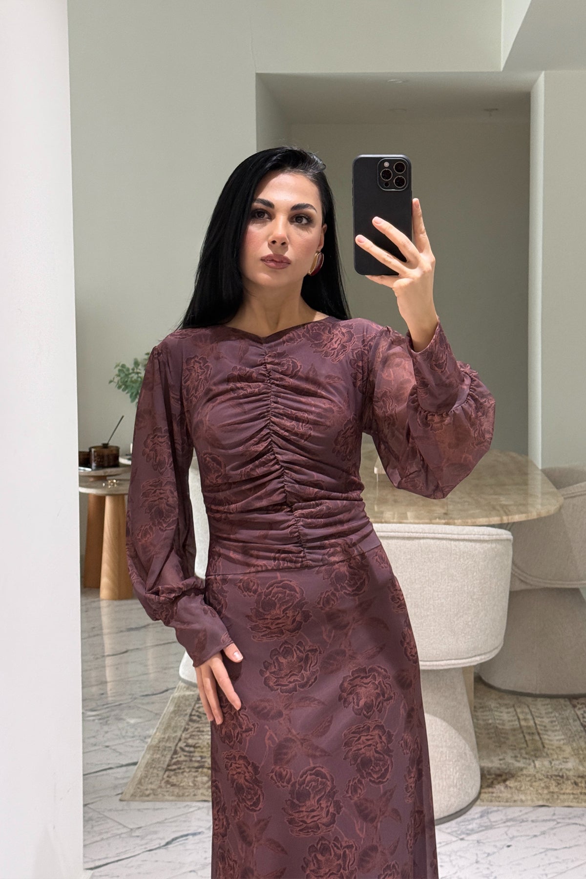 Kahve Önü Büzgü Detaylı Elbise SY-3628-Kahverengi