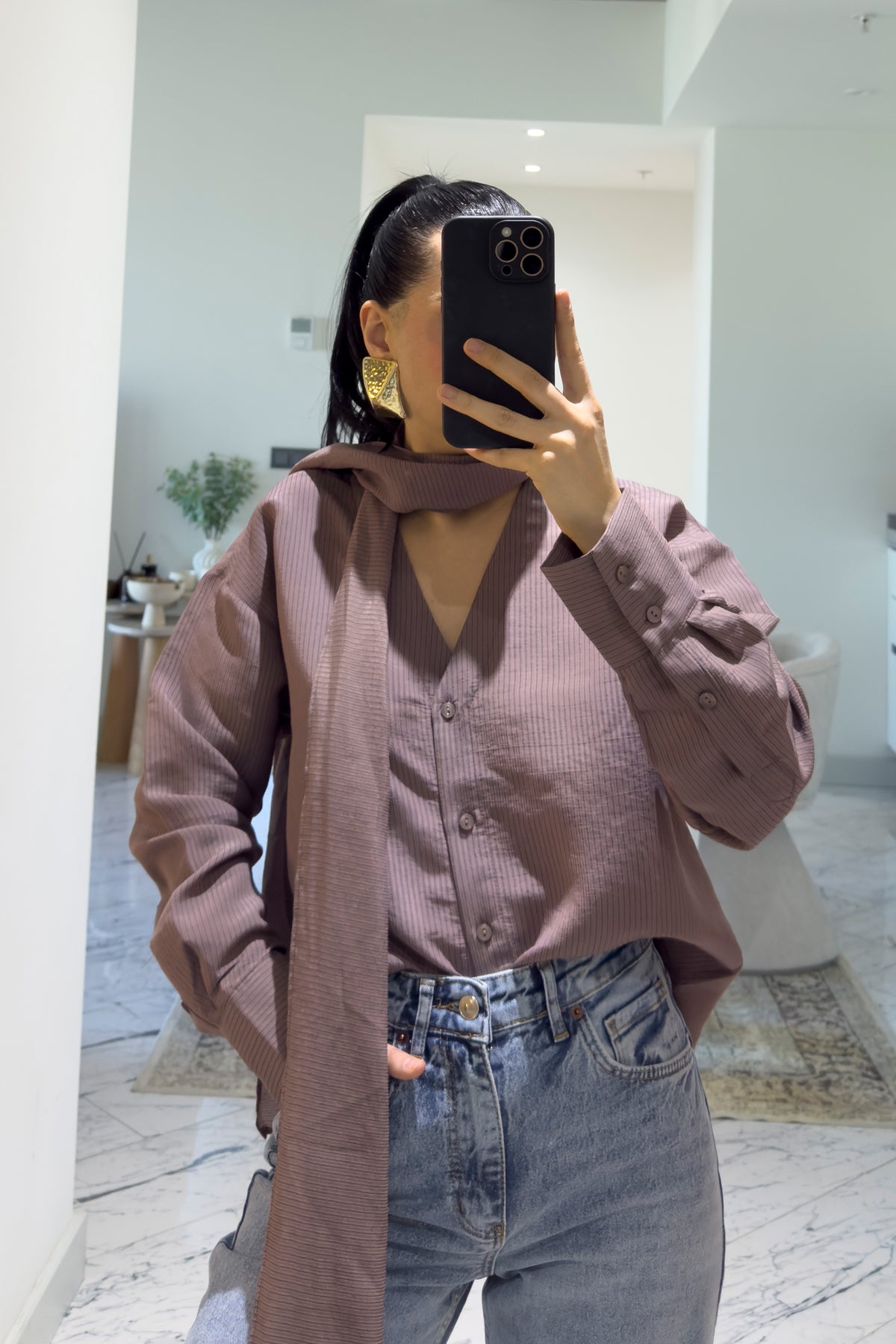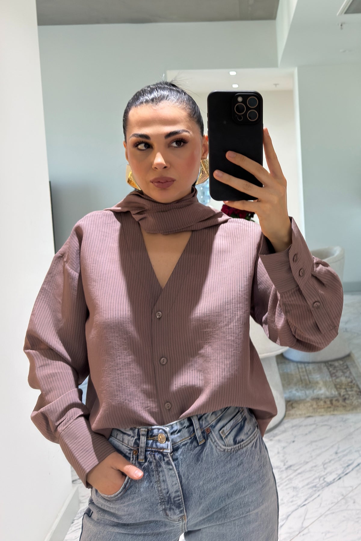 Ürün Detayları:Kahve Şal Detaylı Çizgili Gömlek