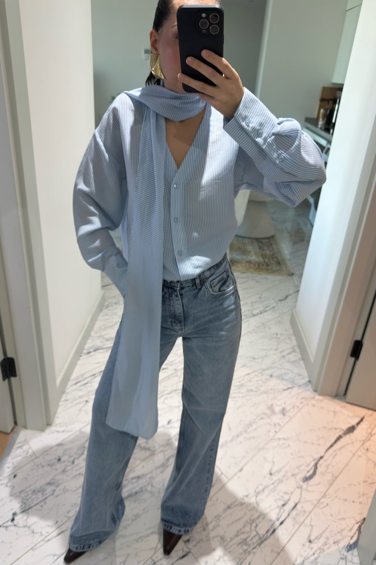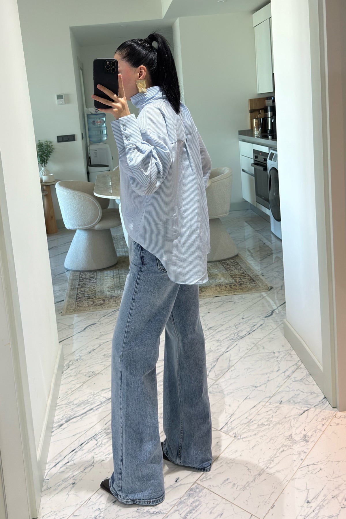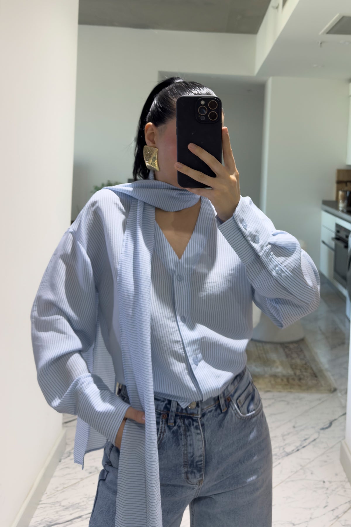 Ürün Detayları:Mavi Şal Detaylı Çizgili Gömlek