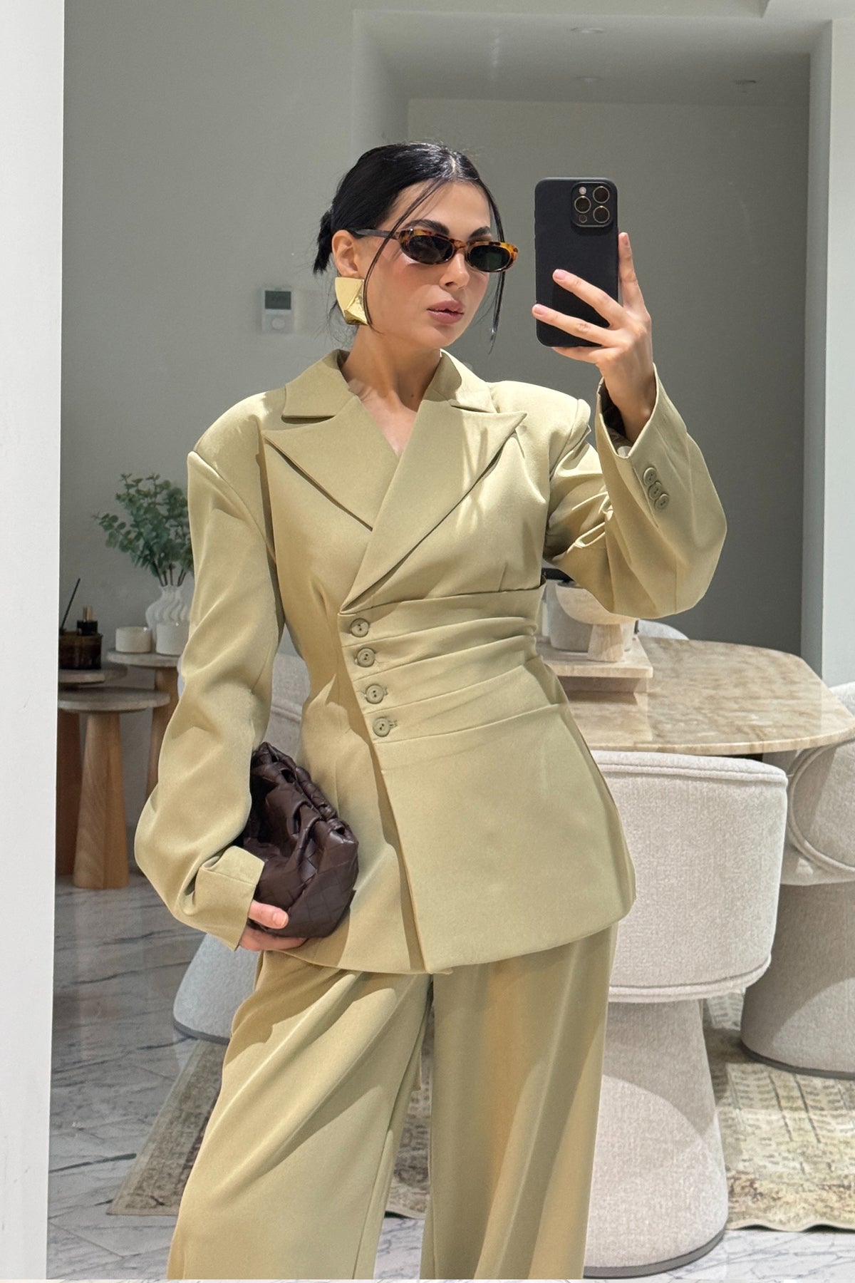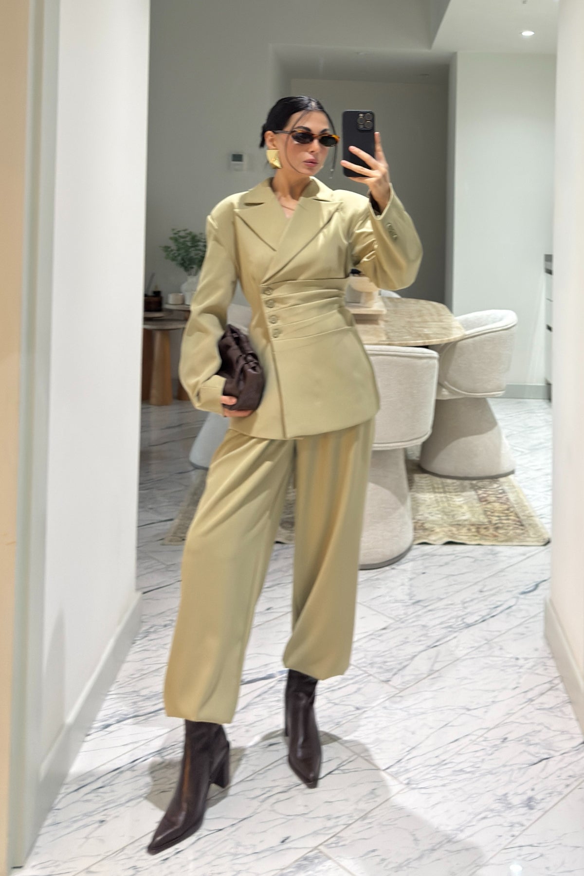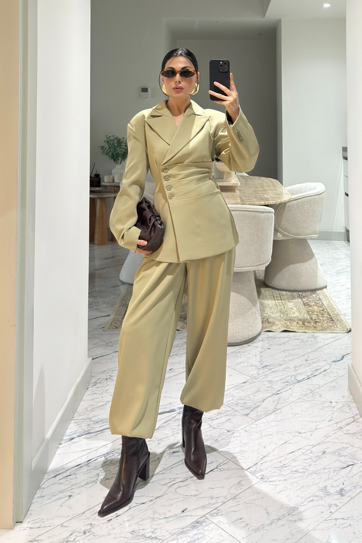 Ürün Detayları:Haki Beli Drapeli Ceket Ve Şalvar Pantolon Takım