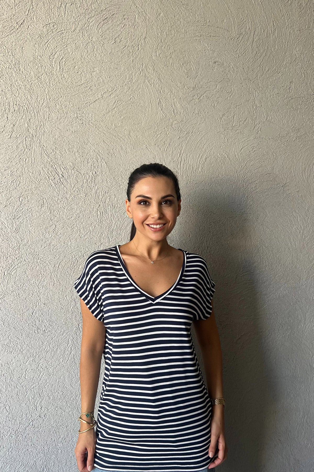 Beyaz Çizgili Koyu Lacivert V Yaka Basic T-shirt SY-0250-Koyu Lacivert