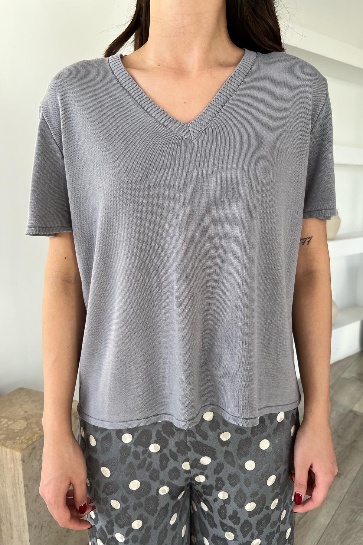 Gri V Yaka Kısa Kol Triko T-shırt SY-1731-Gri