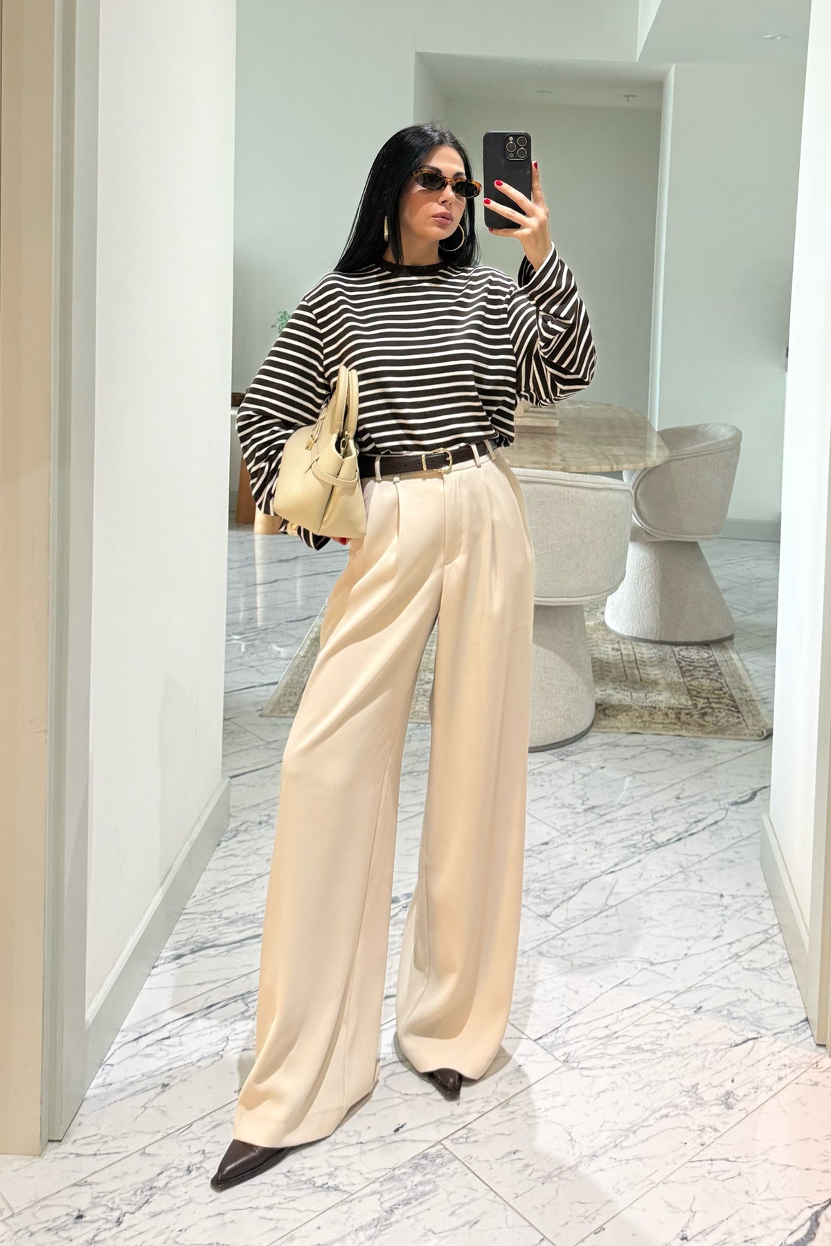 Kahve-Ekru Biisiklet Yaka Çizgili Likralı Uzun Kollu T-Shirt SY-3645-Kahverengi