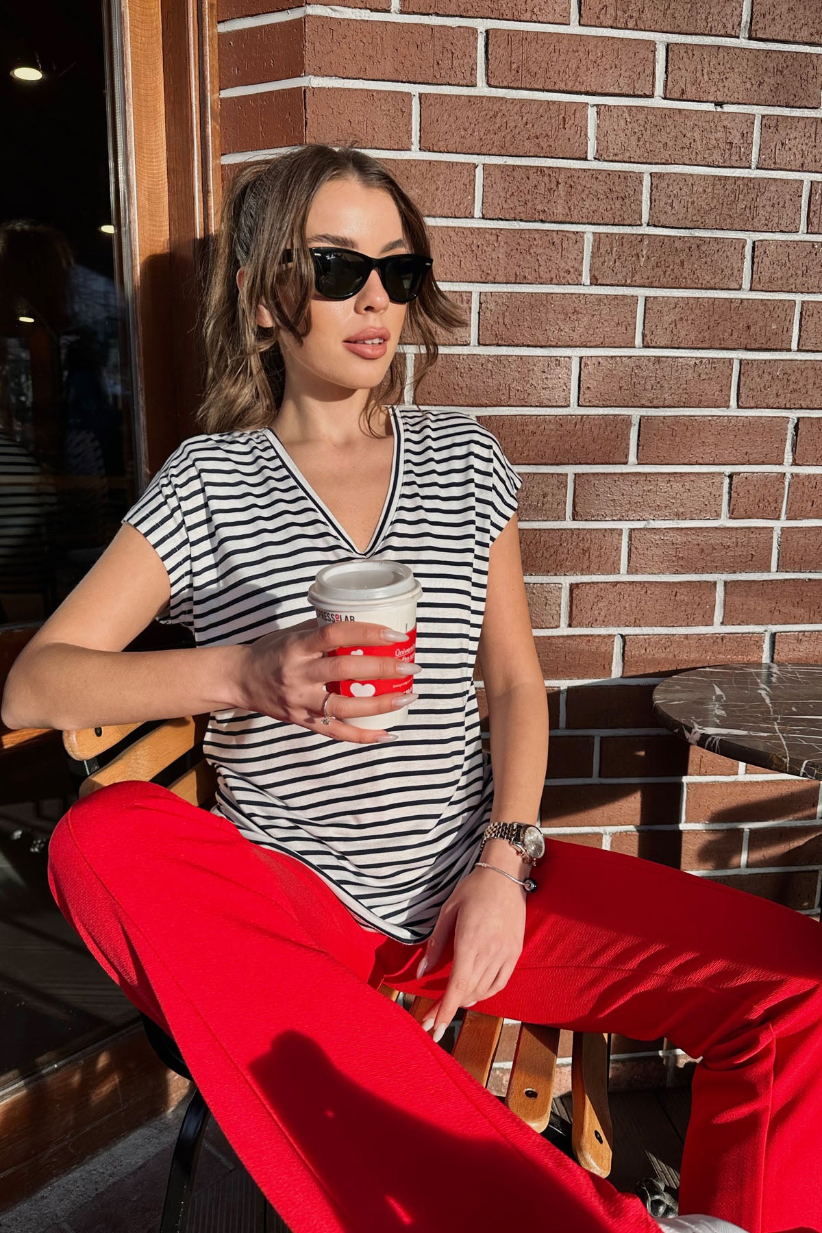 Lacivert Çizgili V Yaka Basic T-shirt SY-0250-Lacivert
