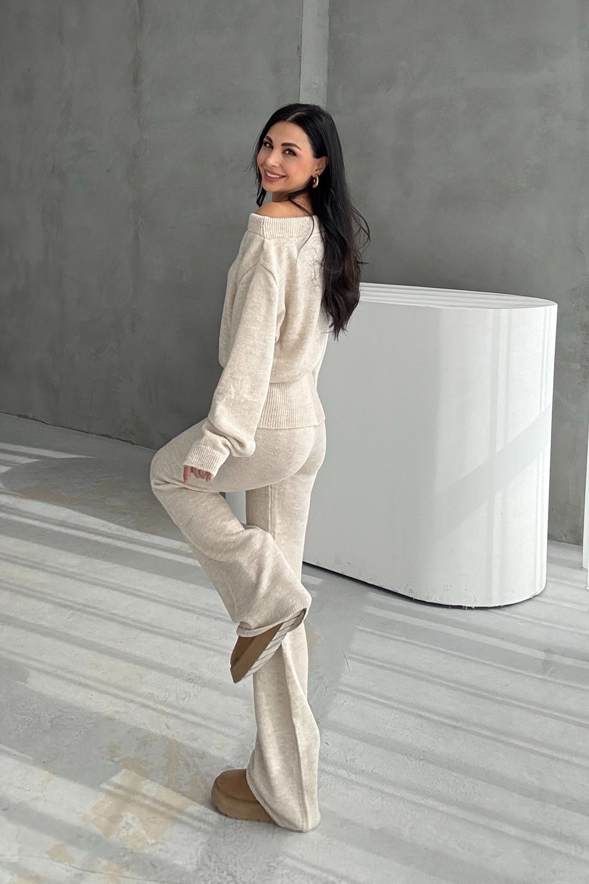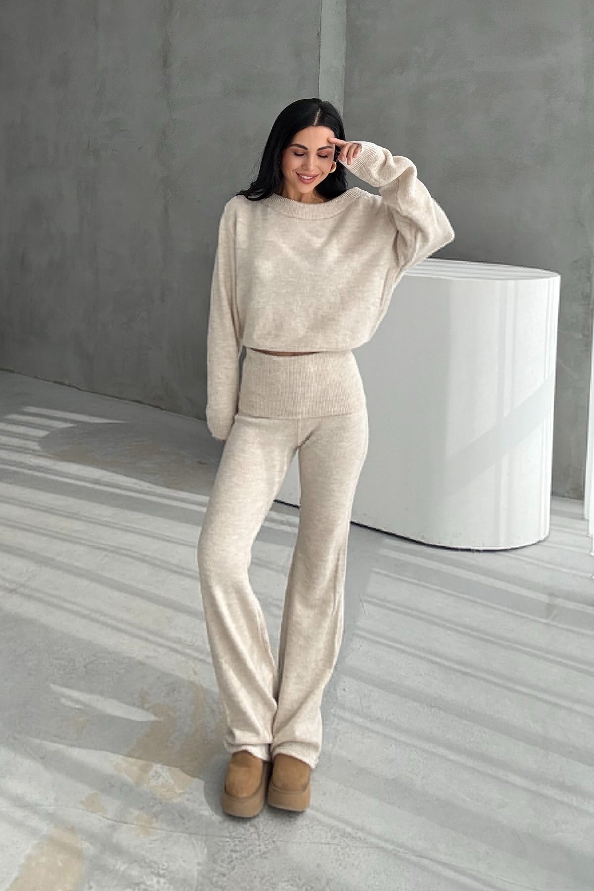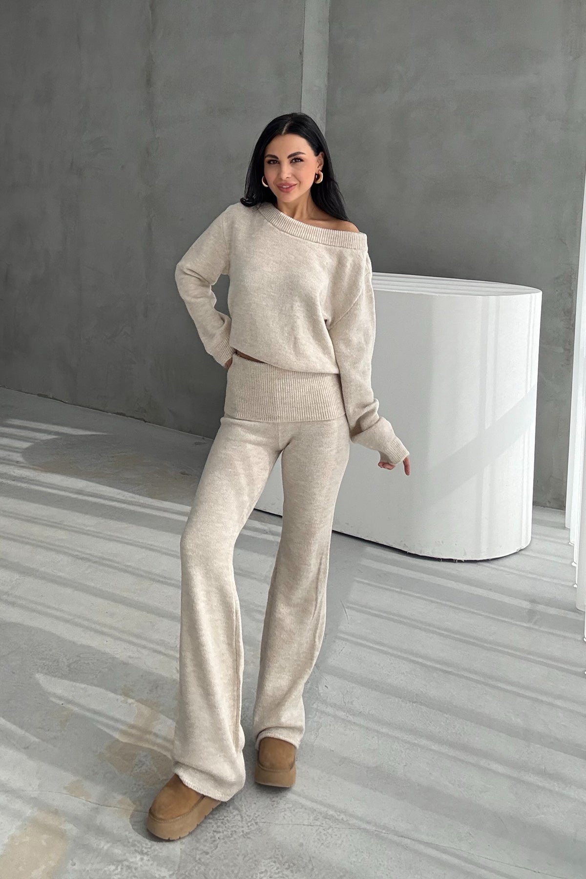 Ürün Detayları:Bej Kayık Yaka Kazak ve Triko Pantolon Takım