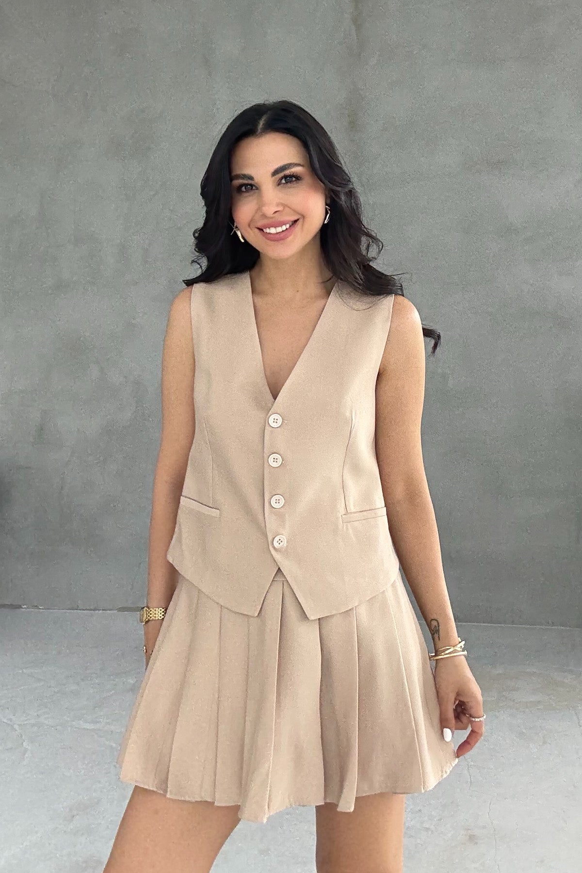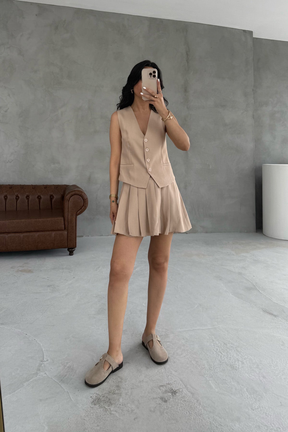 Bej Maskülen Yelek Piliseli Etek Takım SY-2030-Bej