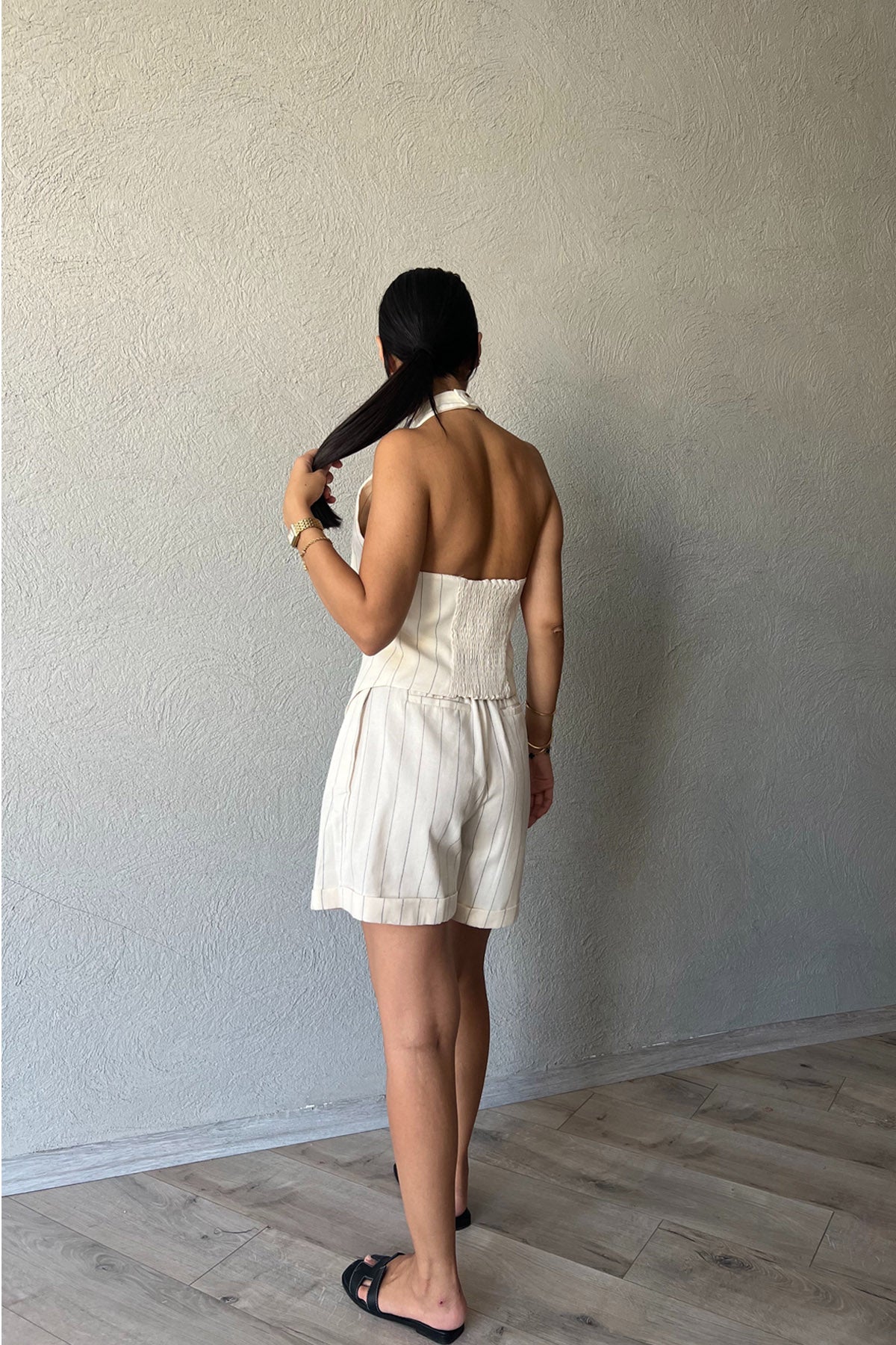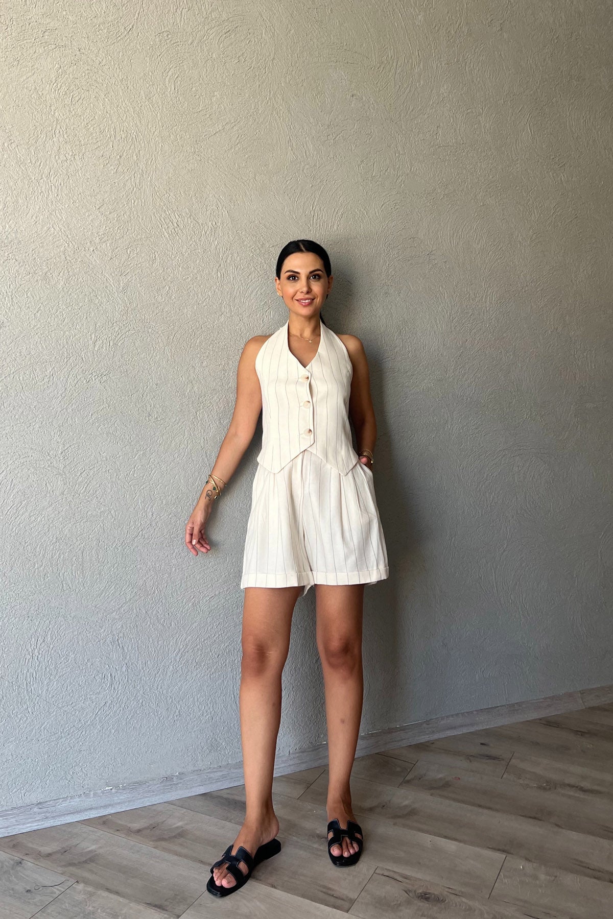 Ürün Detayları ; Ekru Gipeli ÇizgiliŞortlu Takım