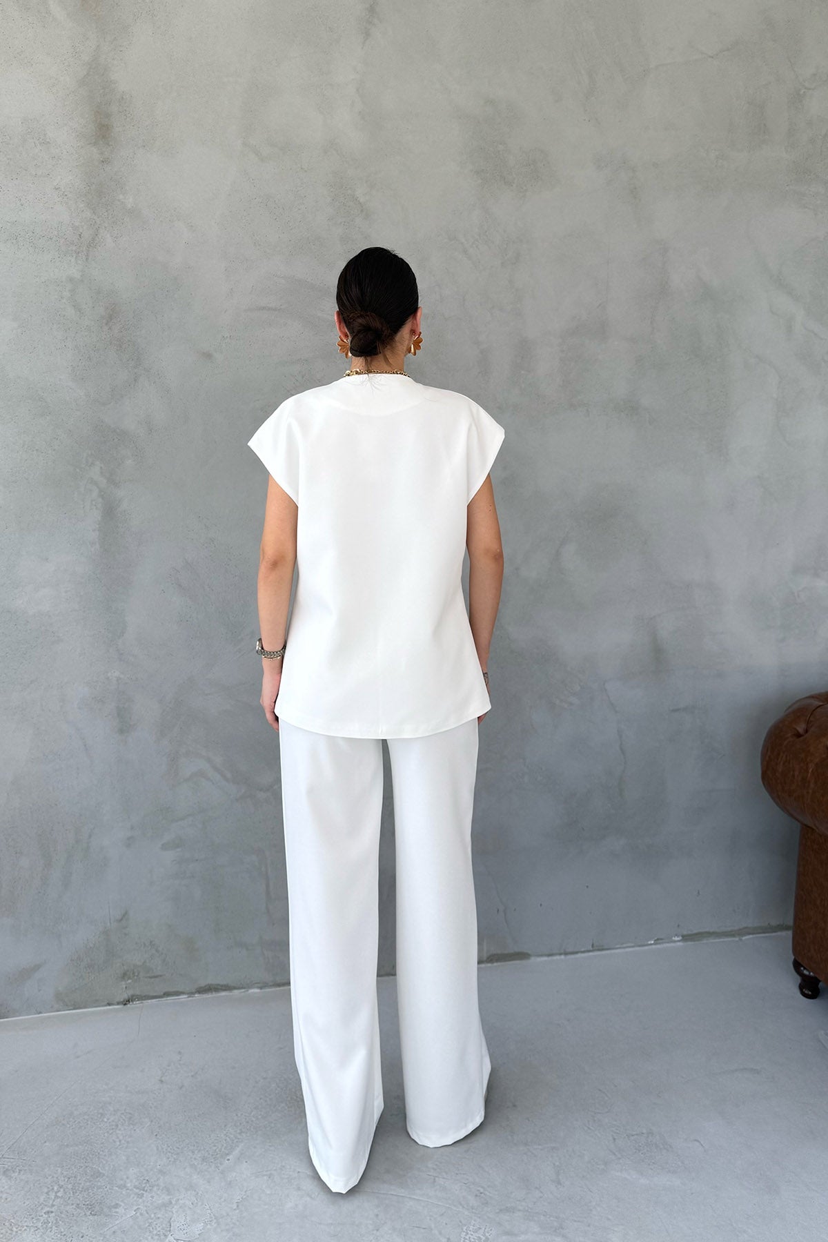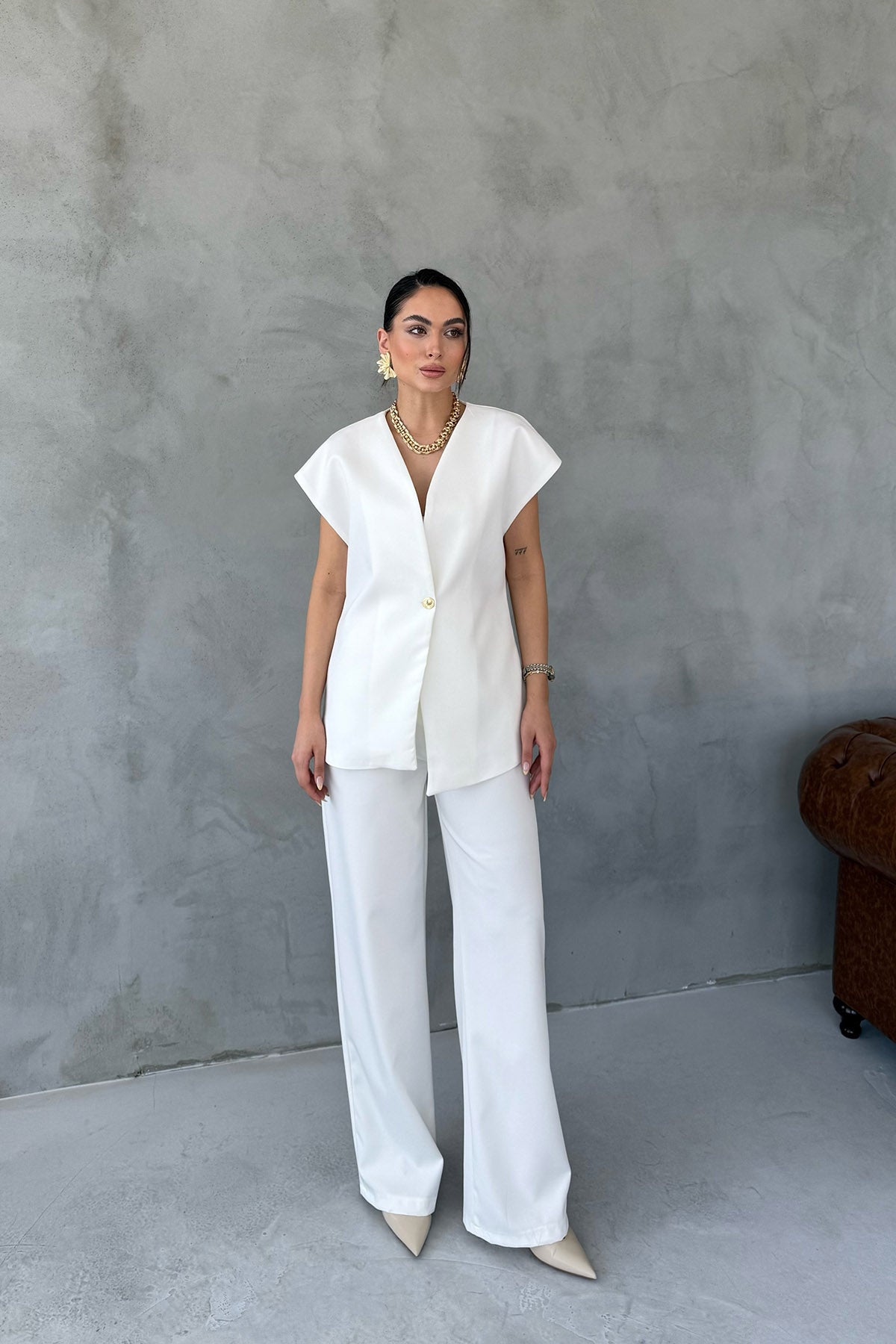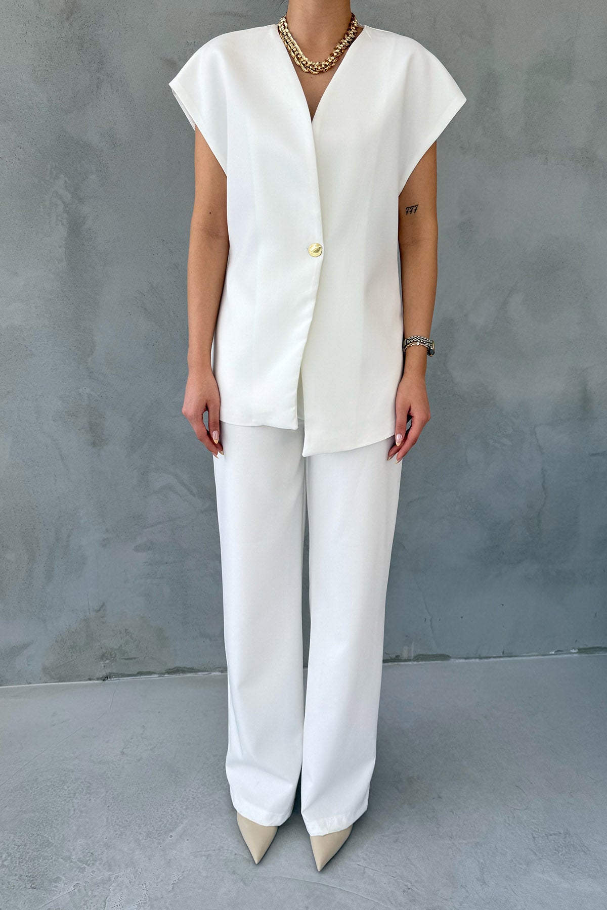 Ekru Gold Düğme Detaylı Asimetrik Kesim Yelek Pantolon Takım SY-3004-Ekru