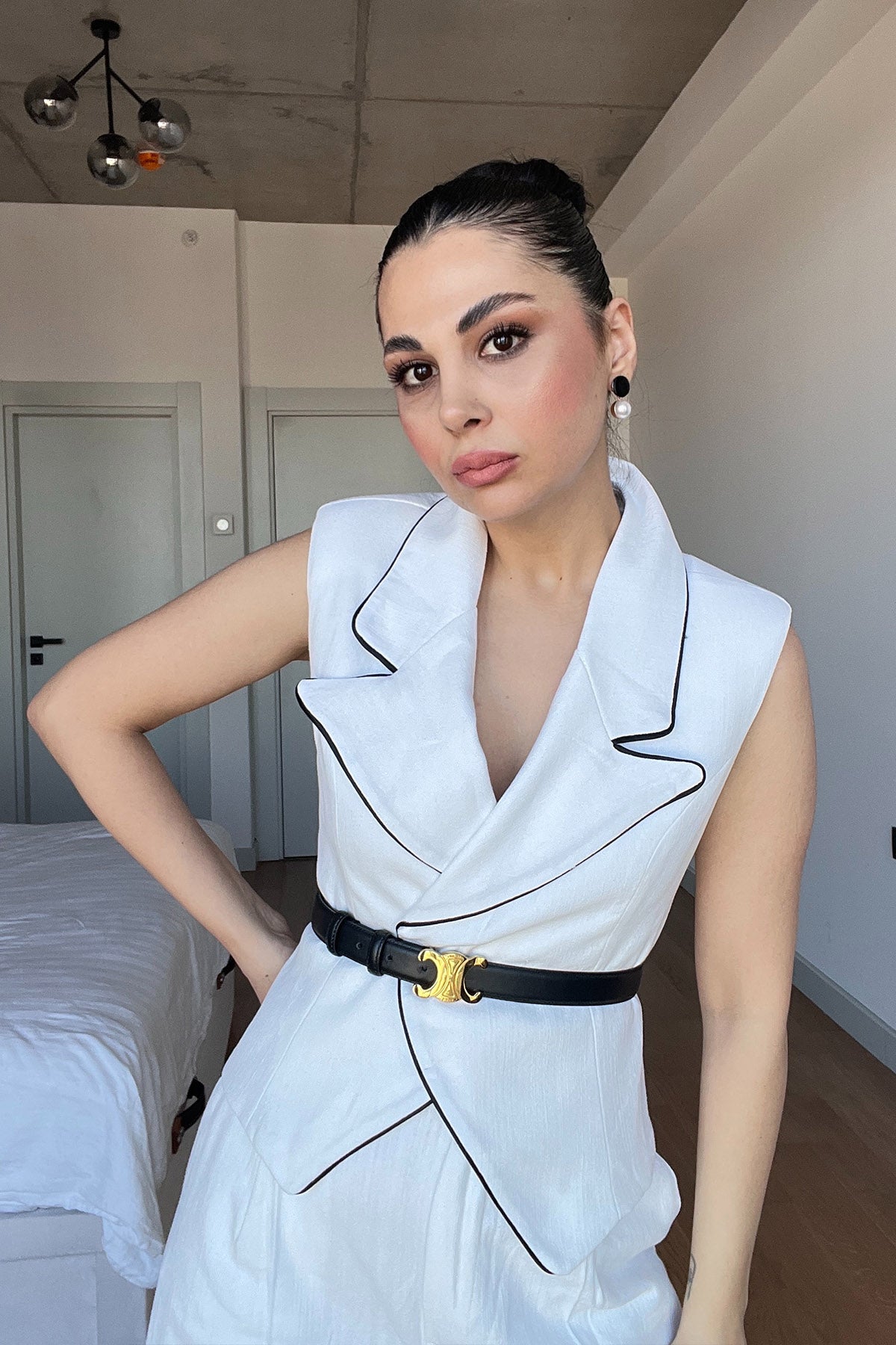 Ürün Detayları ;Ekru Keten Biyeli Yelek Ve Pantolon Takım