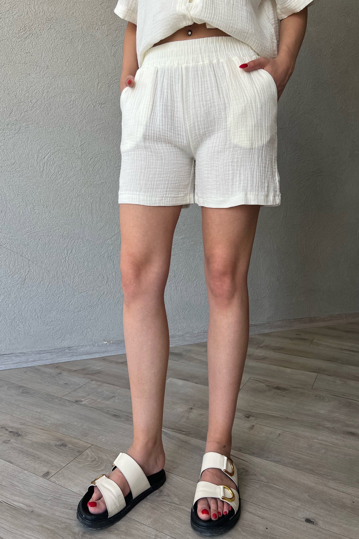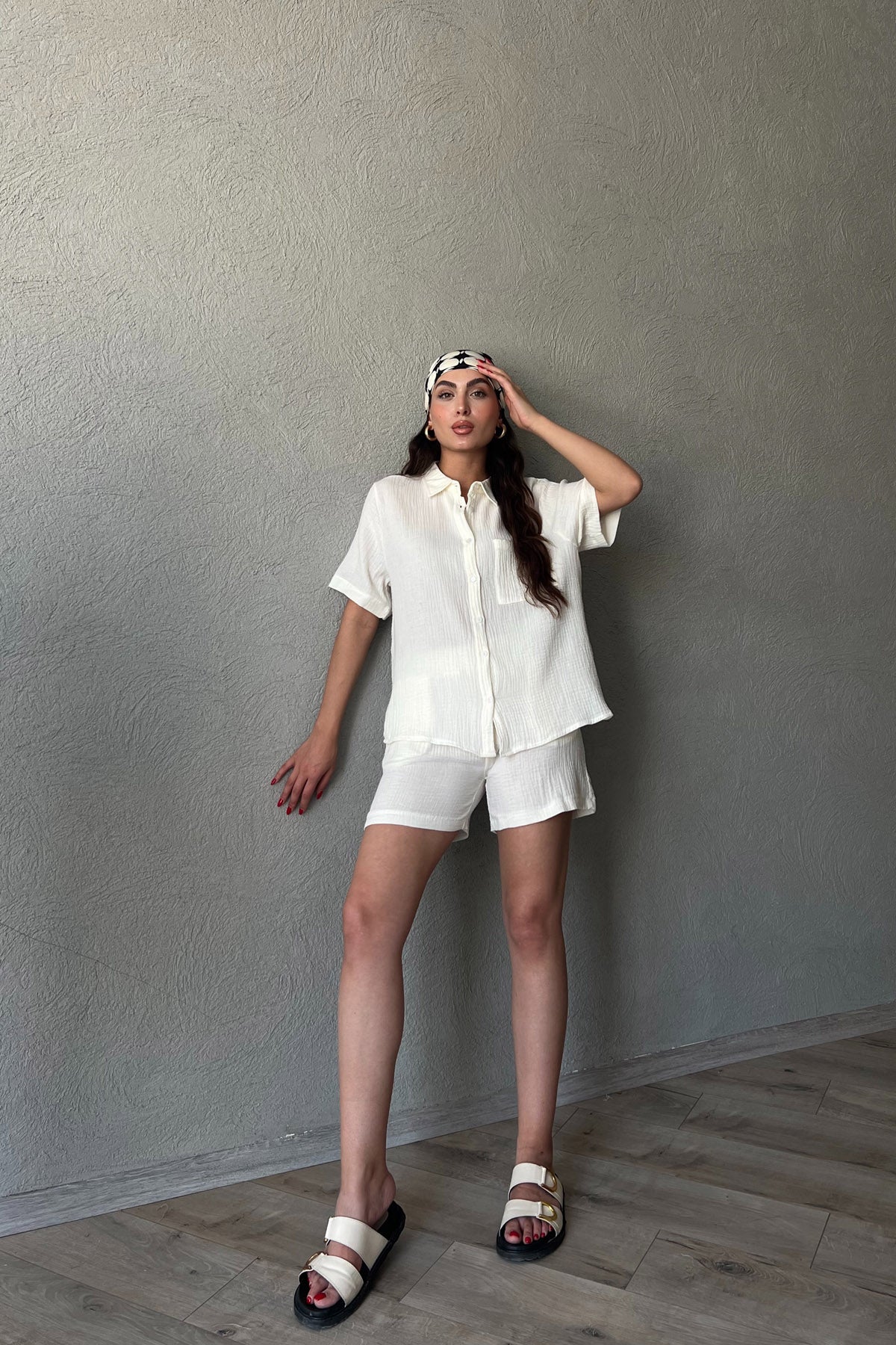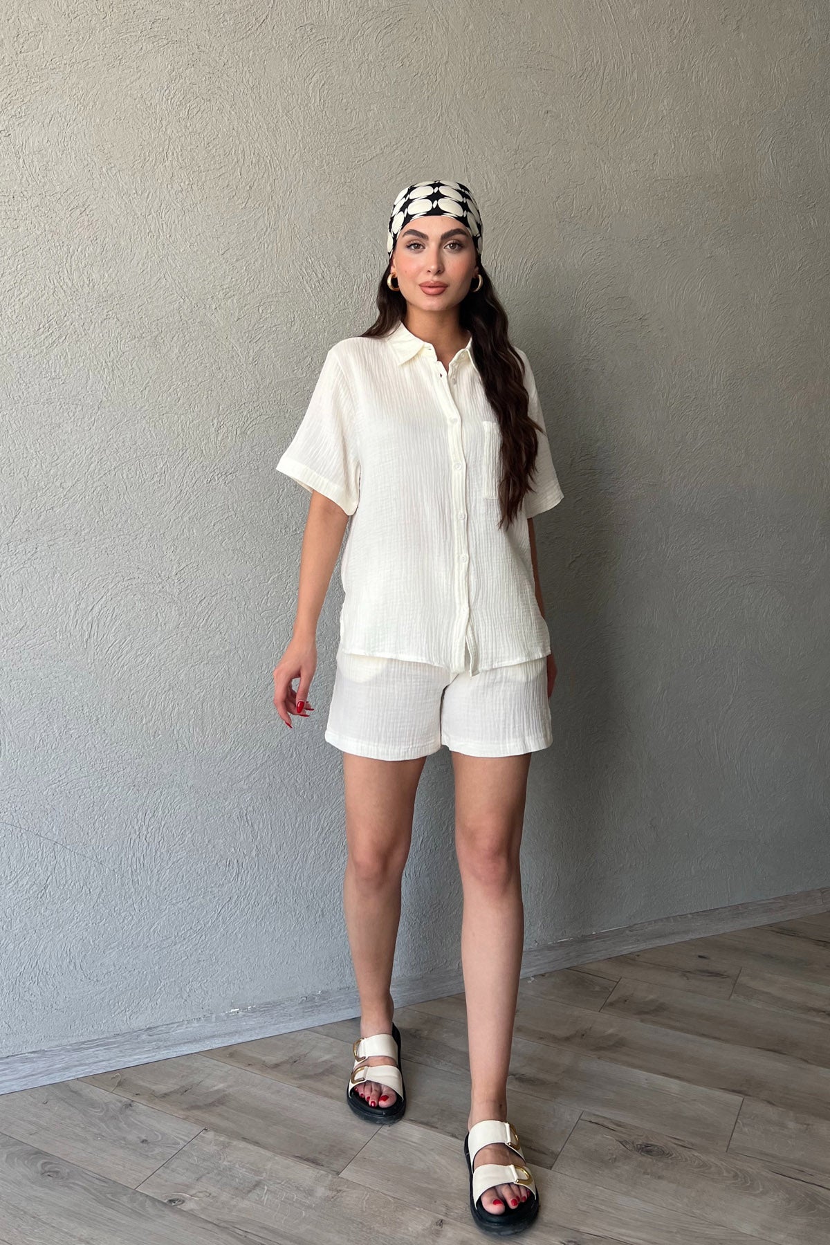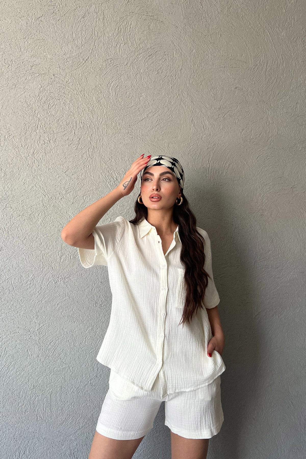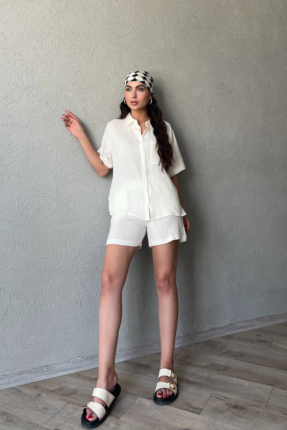 Ekru Kısa Kol Gömlek Şort Müslin Takım SY-2118-Ekru